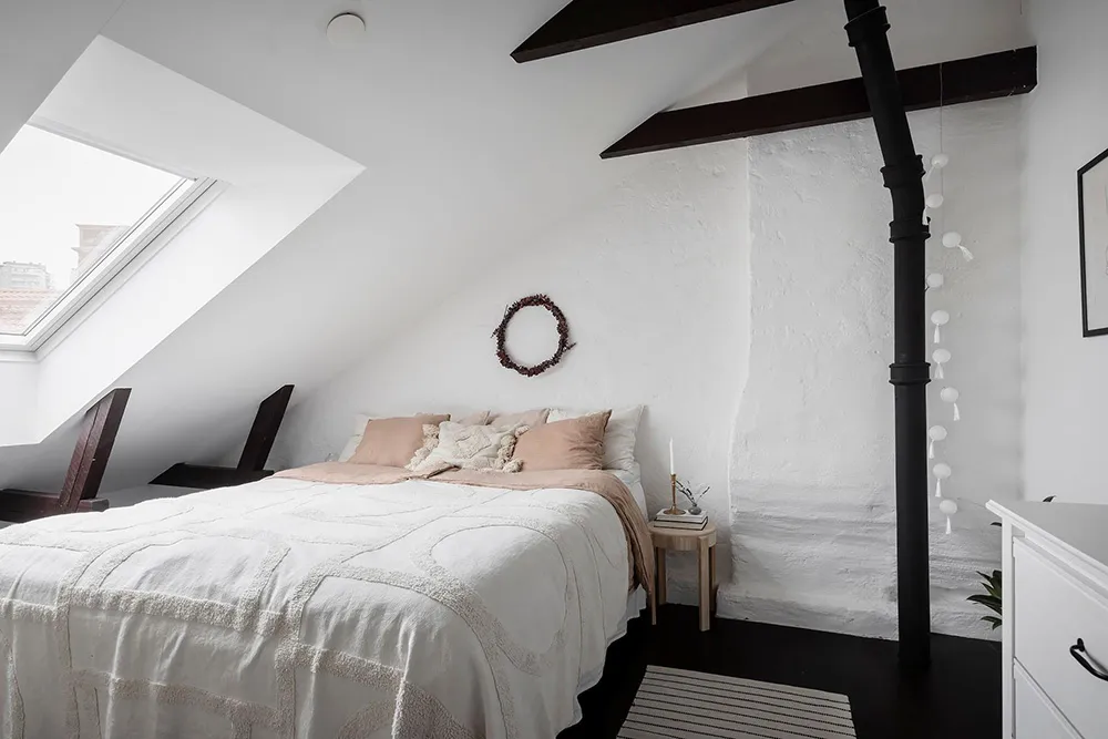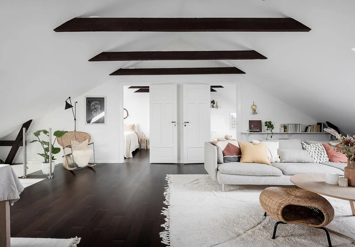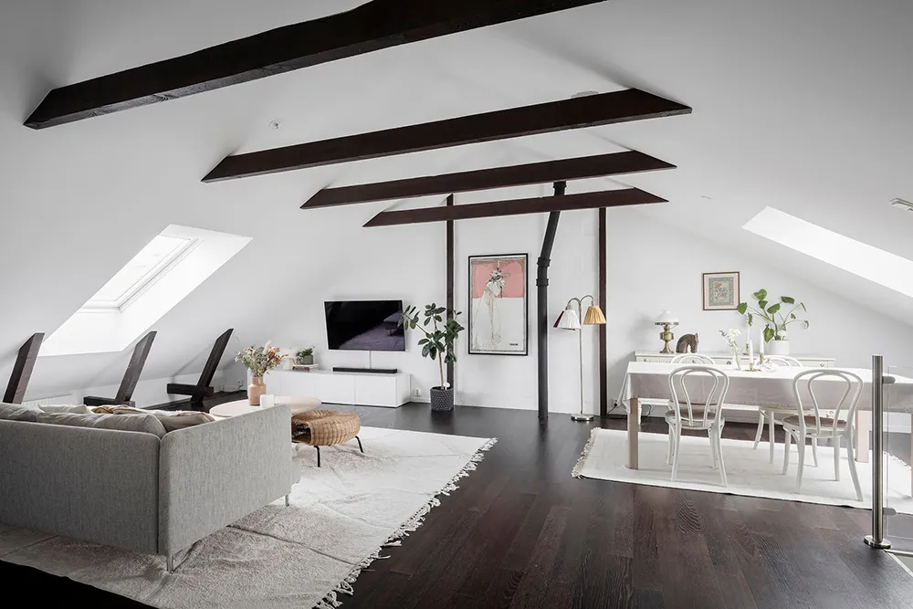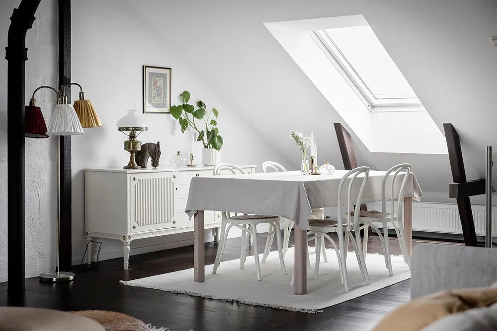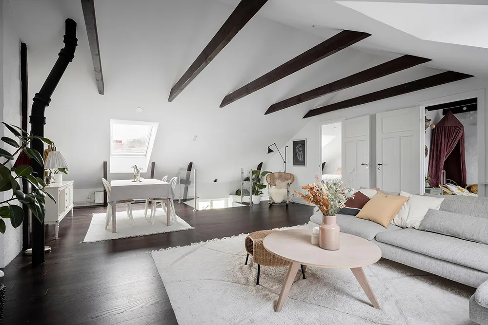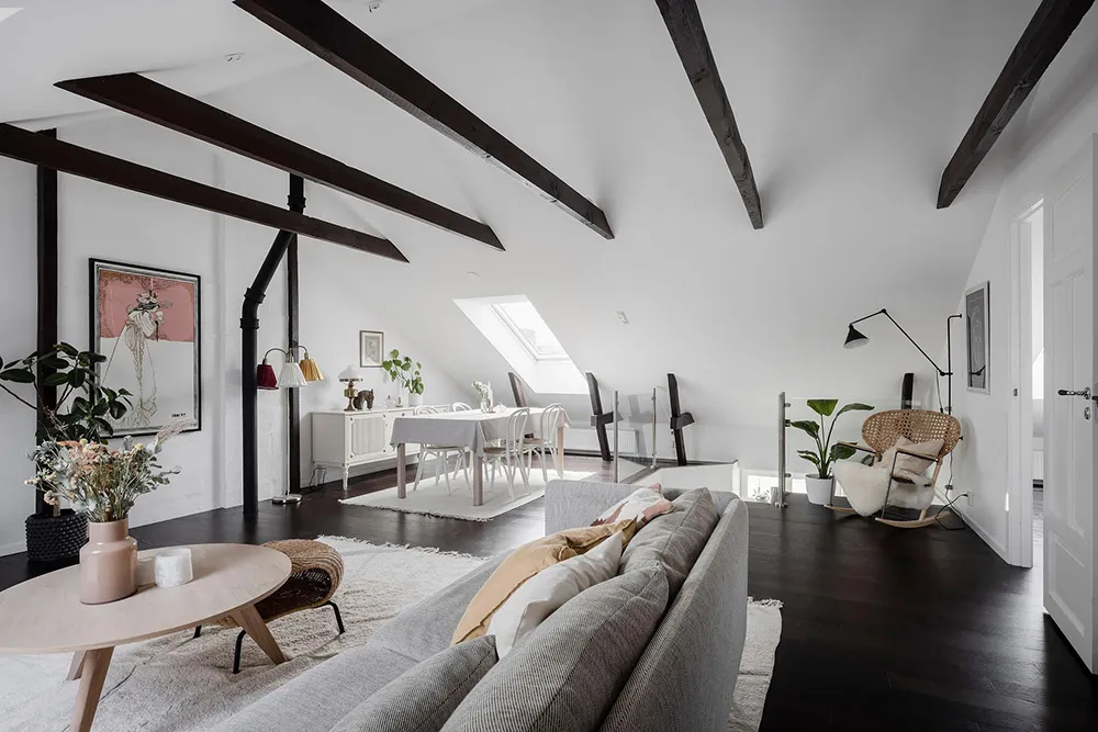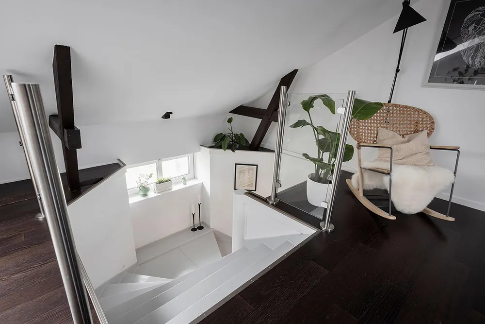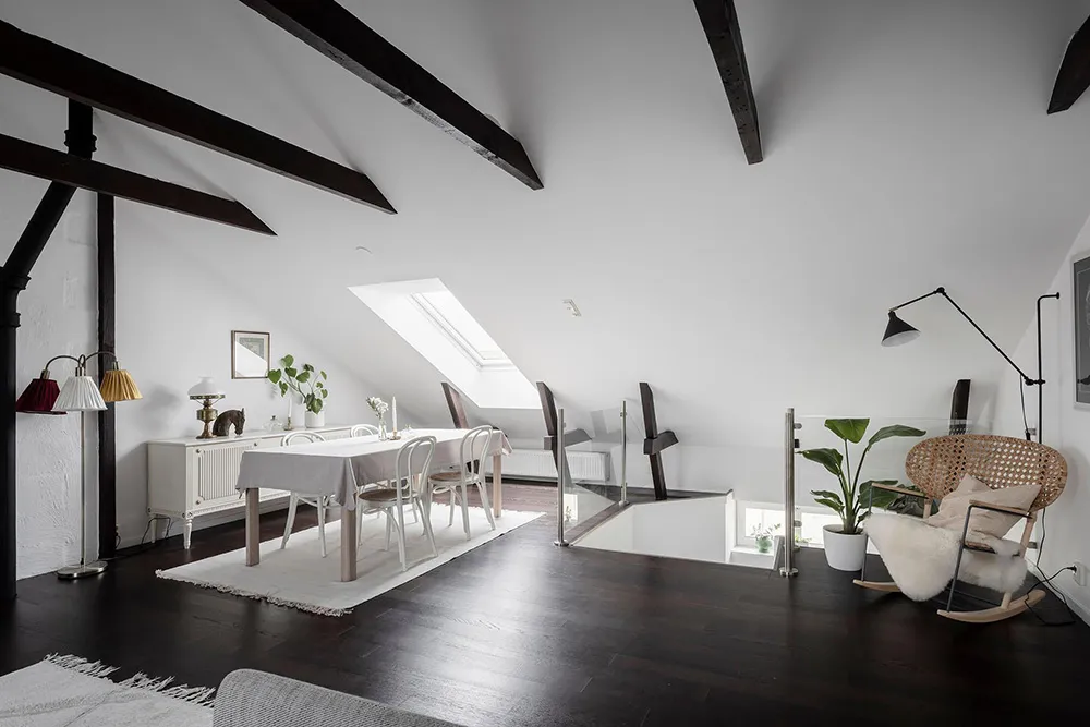 Cet appartement scandinave occupe les deux derniers étages d'un ancien bâtiment bas situé dans l'un des quartiers historiques de Göteborg.