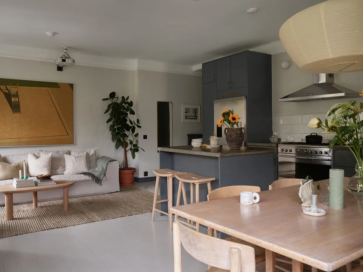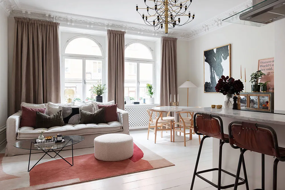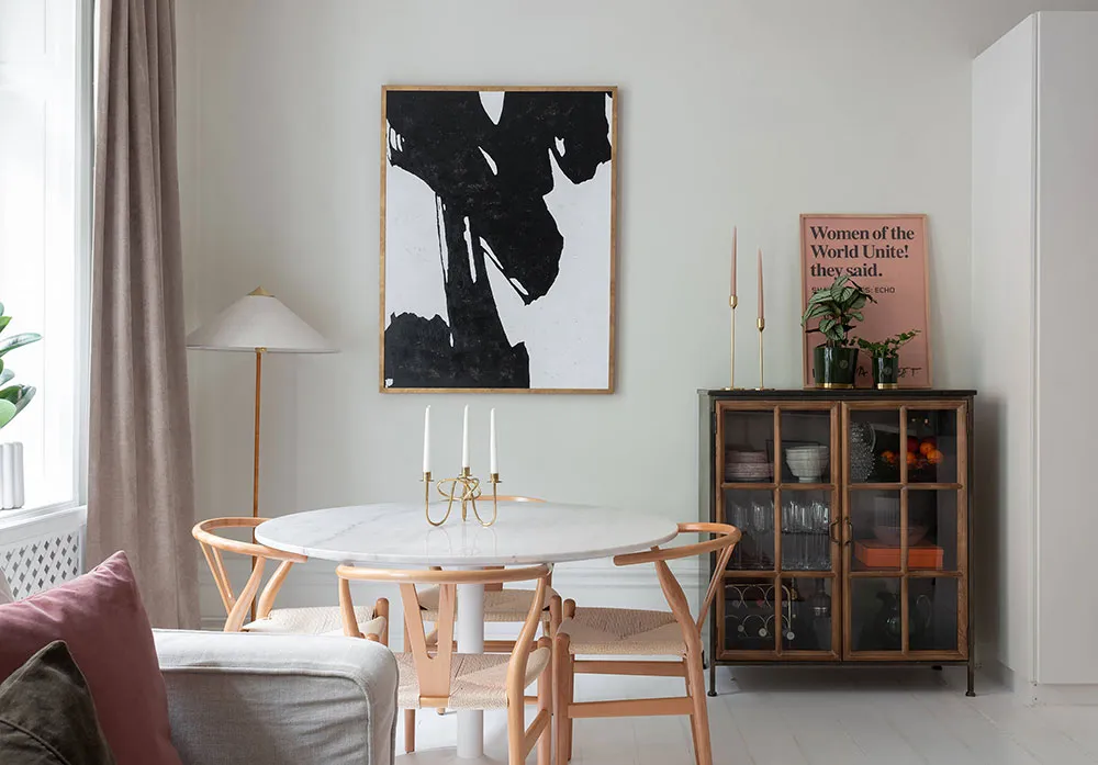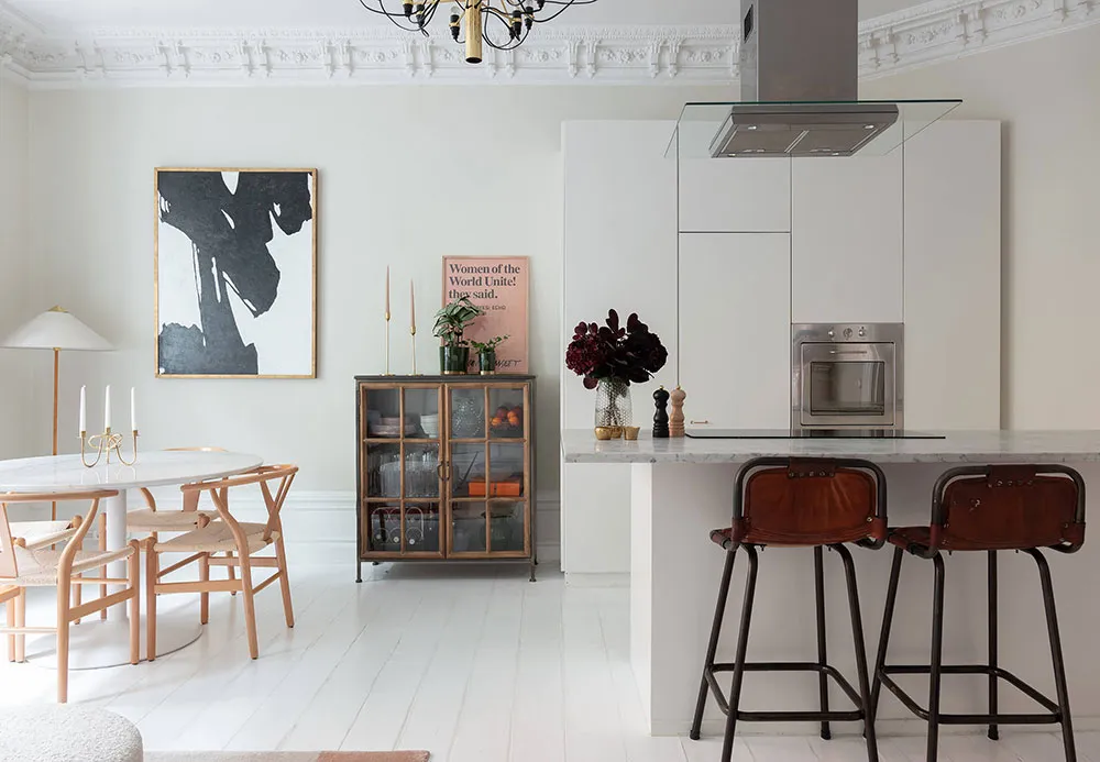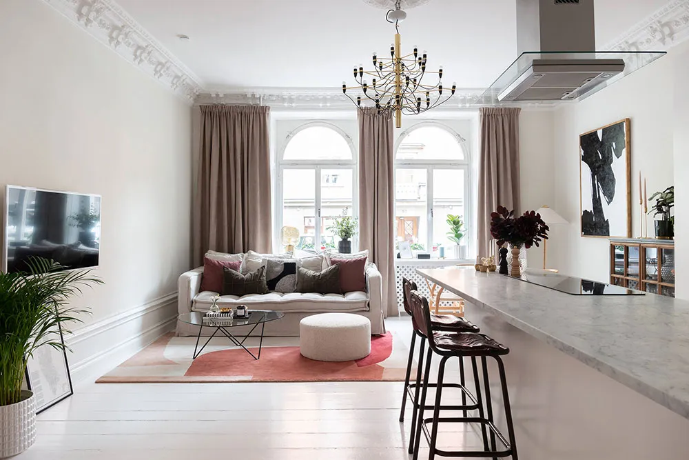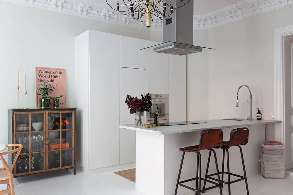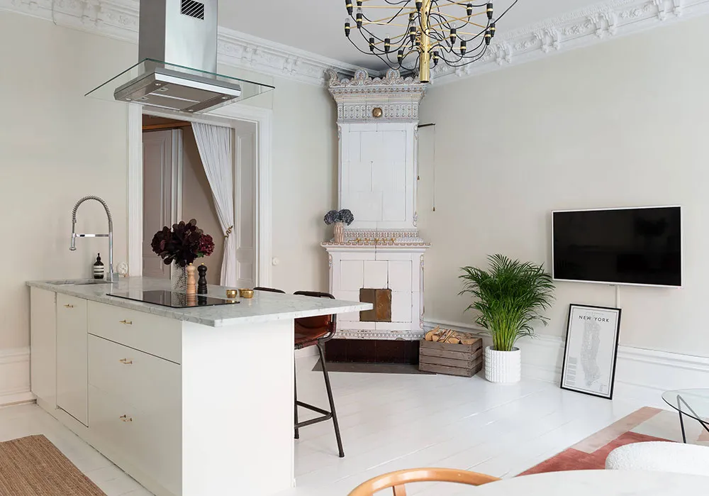 En regardant l'espace ouvert magnifique de la salle à manger et de la cuisine de cet appartement de deux pièces à Stockholm, il est difficile de croire que la superficie totale de l'appartement ne fait que 47 m² — visuellement, il semble nettement plus grand. Tout cela est dû au fait que la chambre a été conçue comme un espace très réduit, ressemblant davantage à une cabine dans laquelle ne rentre qu'un seul lit. Évidemment, les propriétaires passent leur temps libre dans la pièce principale, qui comprend plusieurs zones fonctionnelles, une ancienne cheminée à bois et un îlot de cuisine qui sert aussi de coin snacks. L'intérieur est assez lumineux grâce à une base claire et un sol blanc, sur laquelle les objets décoratifs stylés se détachent avec élégance et effet.