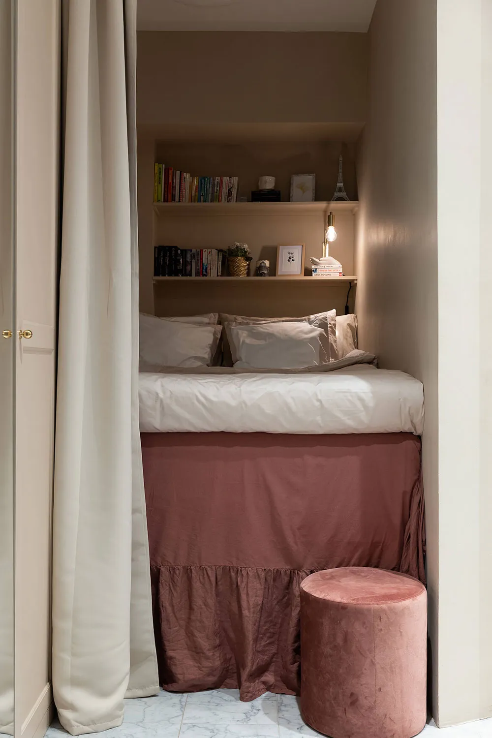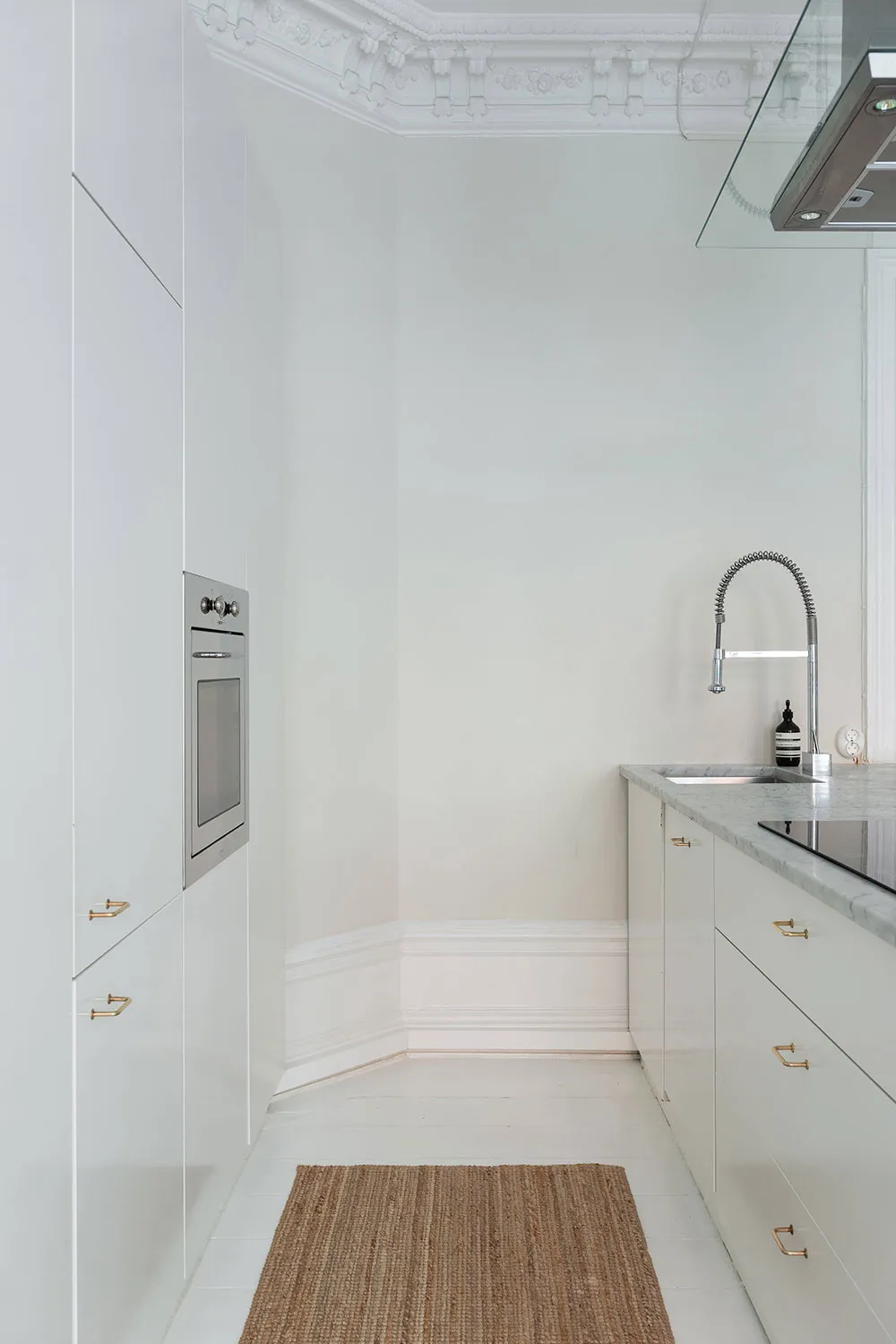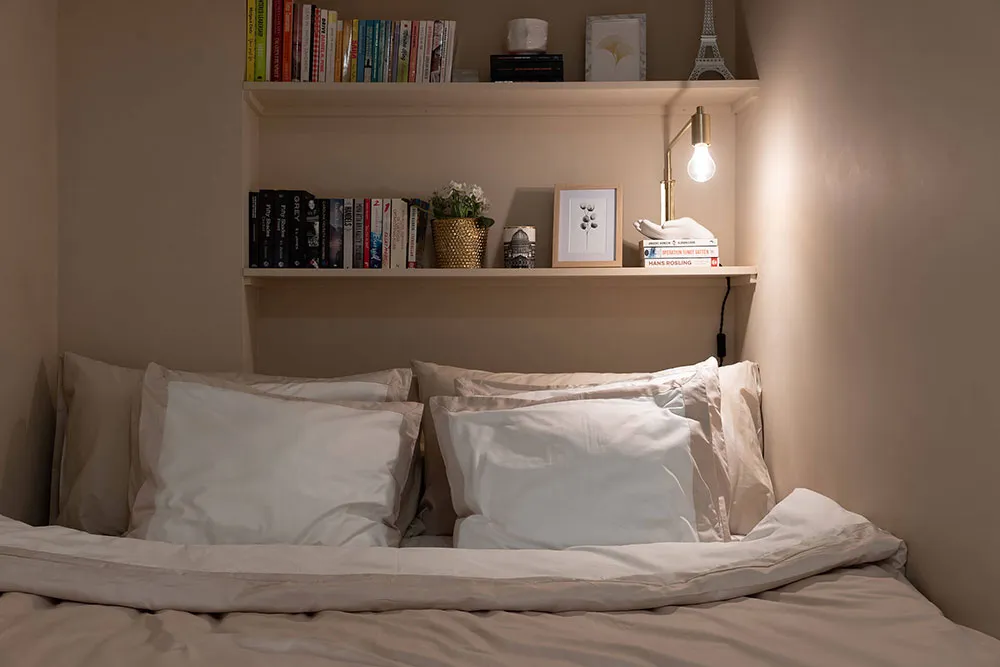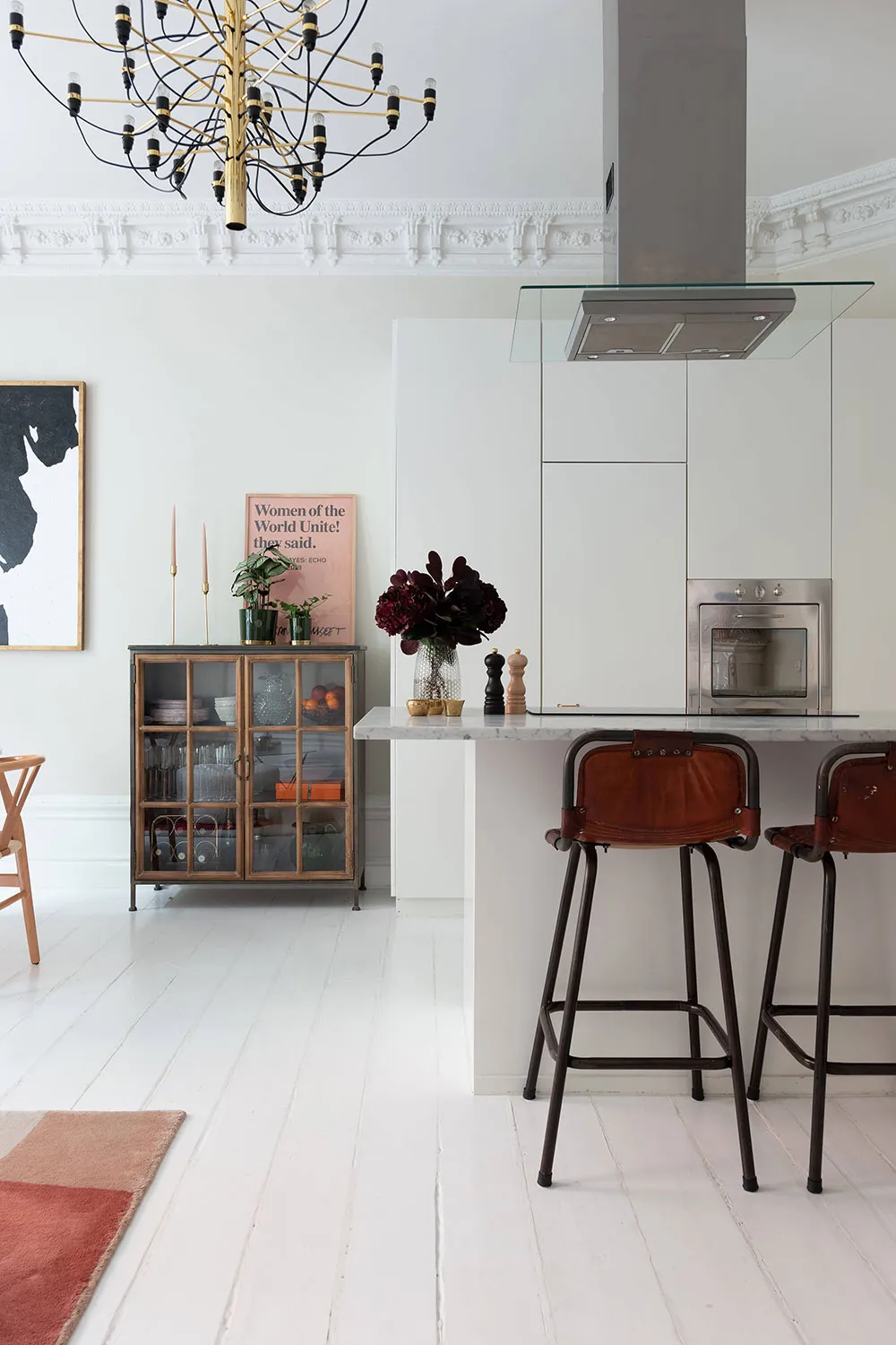 En regardant l'espace ouvert magnifique de la salle à manger et de la cuisine de cet appartement de deux pièces à Stockholm, il est difficile de croire que la superficie totale de l'appartement ne fait que 47 m² — visuellement, il semble nettement plus grand. Tout cela est dû au fait que la chambre a été conçue comme un espace très réduit, ressemblant davantage à une cabine dans laquelle ne rentre qu'un seul lit. Évidemment, les propriétaires passent leur temps libre dans la pièce principale, qui comprend plusieurs zones fonctionnelles, une ancienne cheminée à bois et un îlot de cuisine qui sert aussi de coin snacks. L'intérieur est assez lumineux grâce à une base claire et un sol blanc, sur laquelle les objets décoratifs stylés se détachent avec élégance et effet.