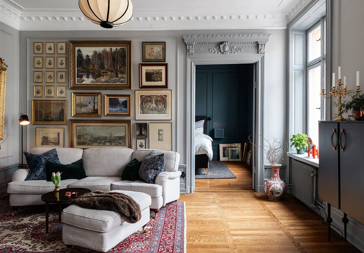 Élegante appartement suédois avec chambre à coucher bleue foncé (62 m²)