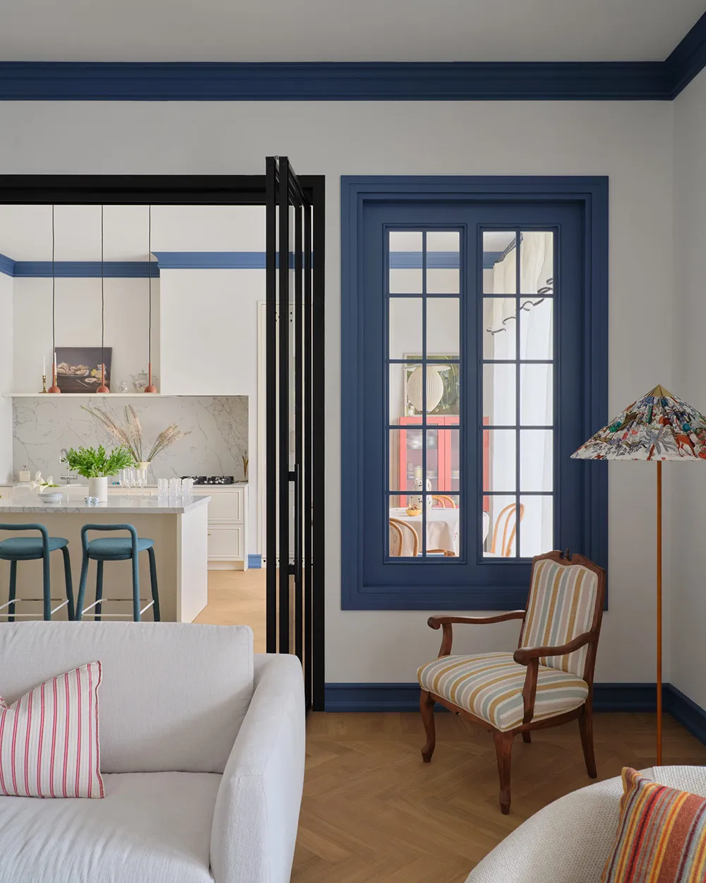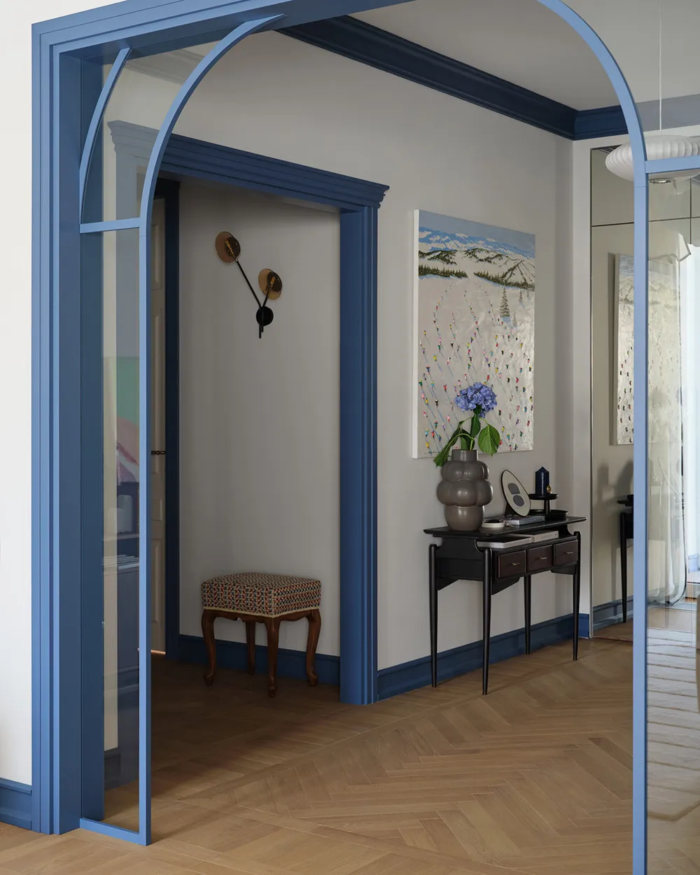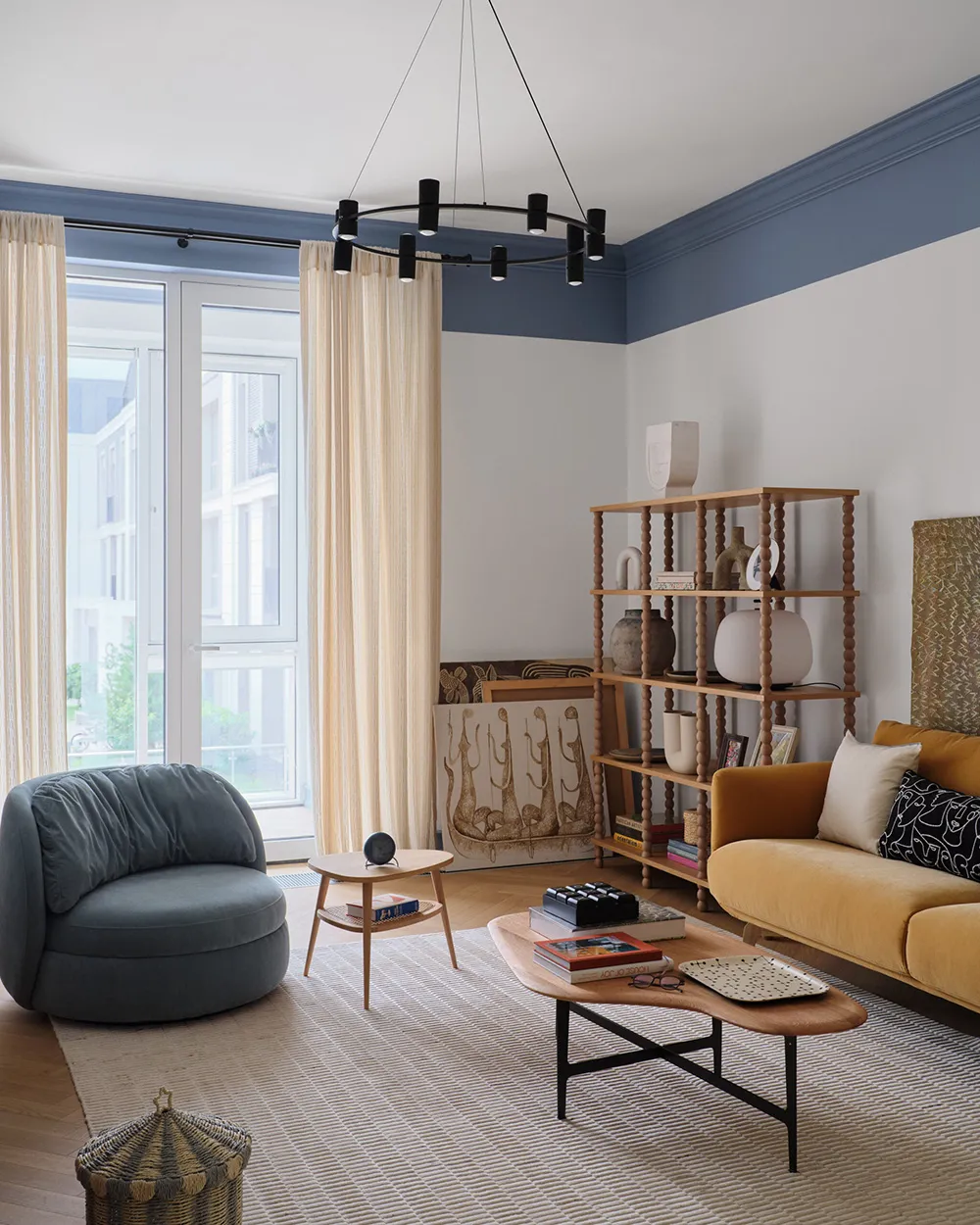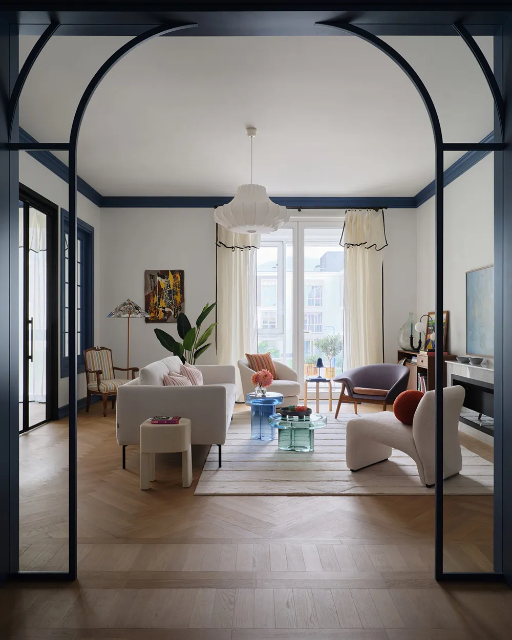Fenêtres arciformes et salle de séjour aux murs bleus : appartement à Stockholm (90 m²)