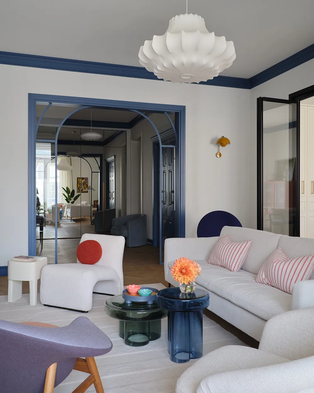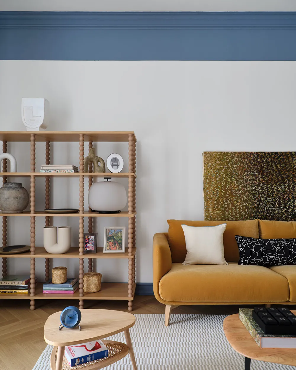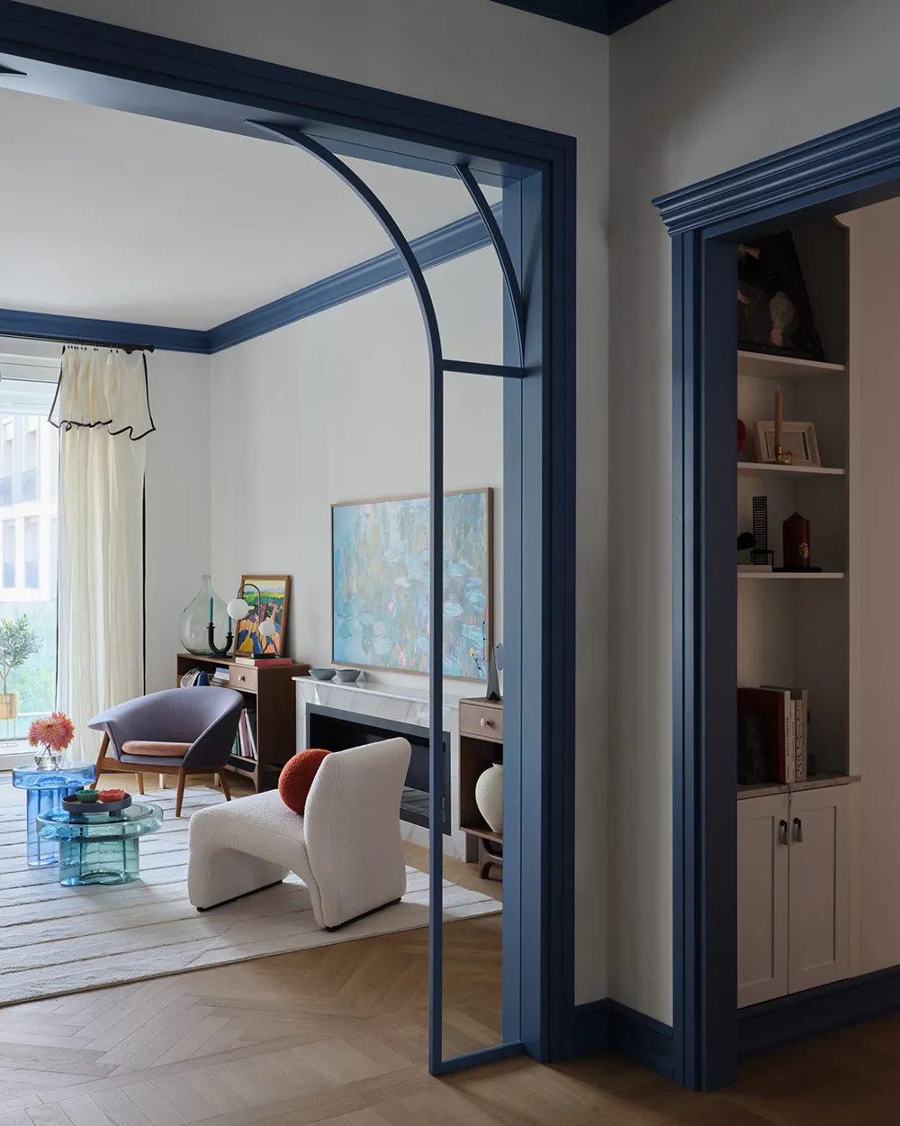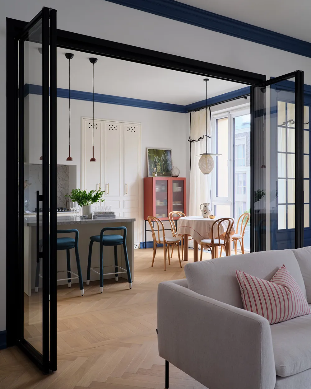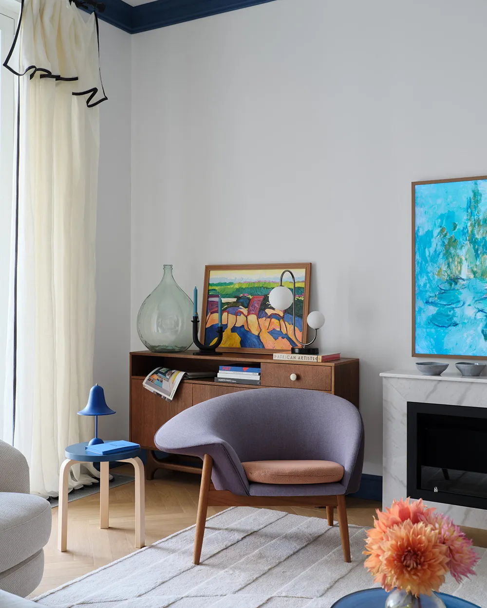 Fenêtres arciformes et salle de séjour aux murs bleus : appartement à Stockholm (90 m²)