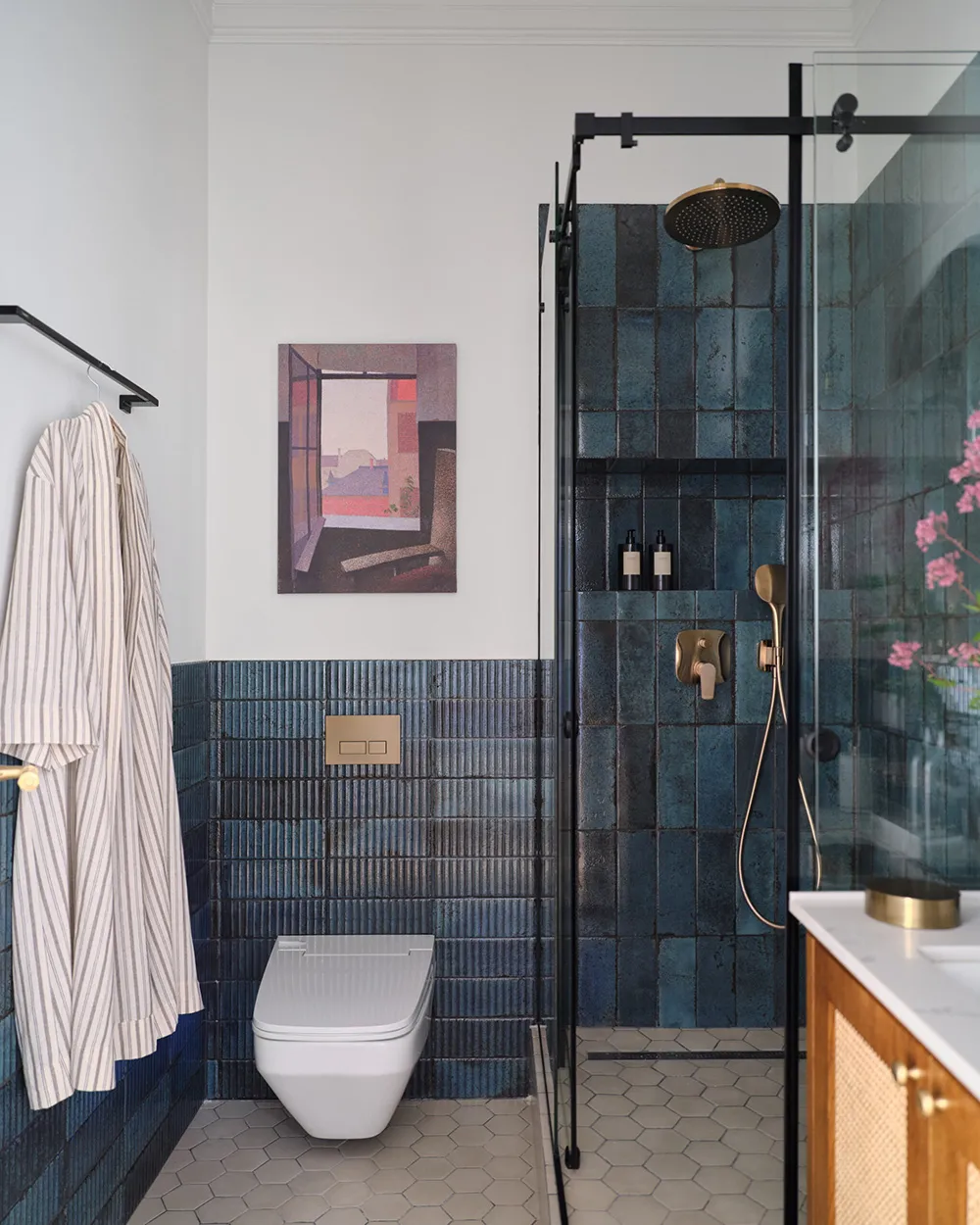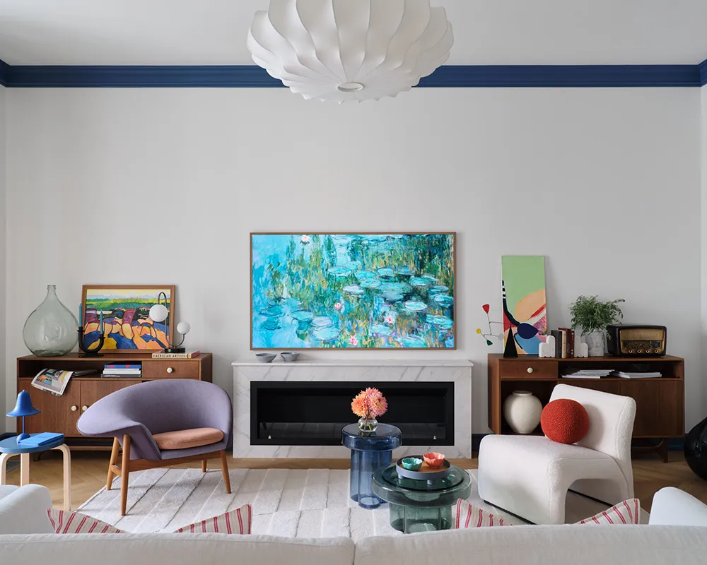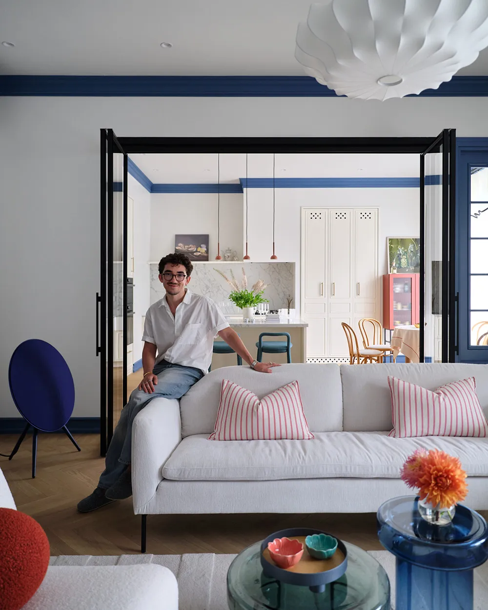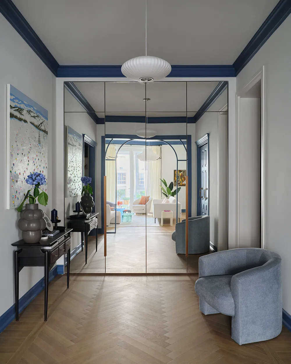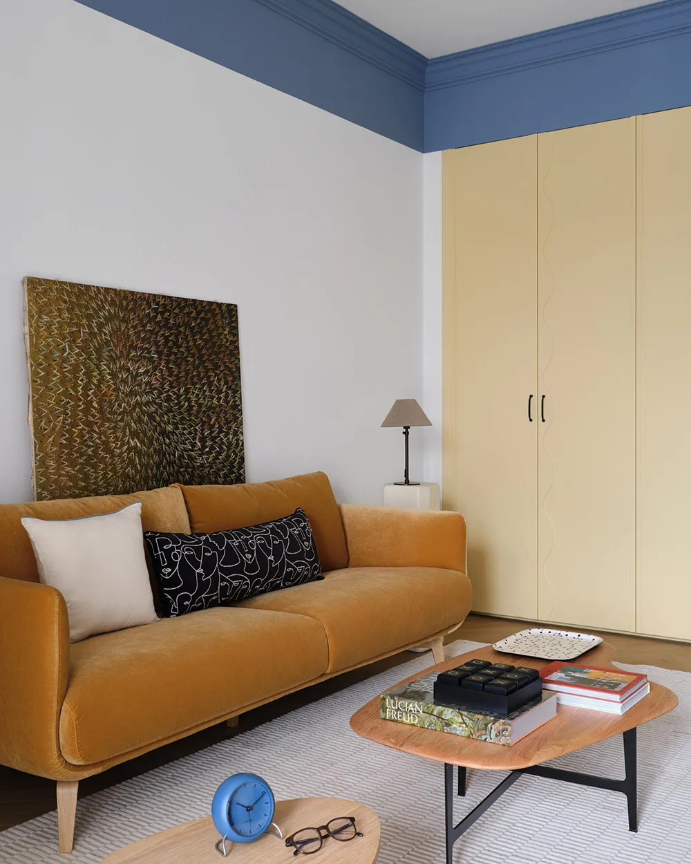 Fenêtres arciformes et salle de séjour aux murs bleus : appartement à Stockholm (90 m²)