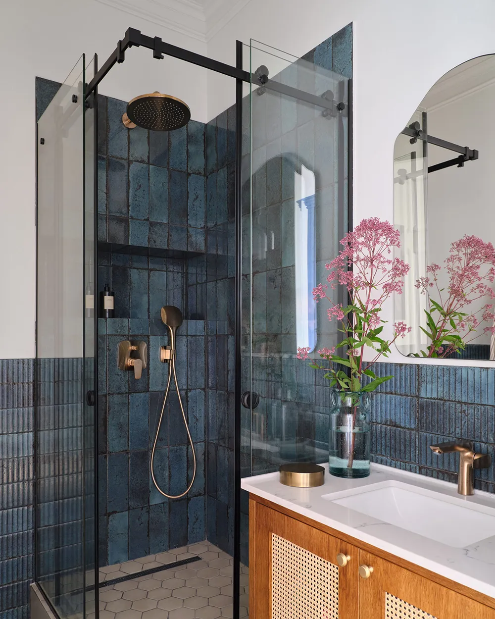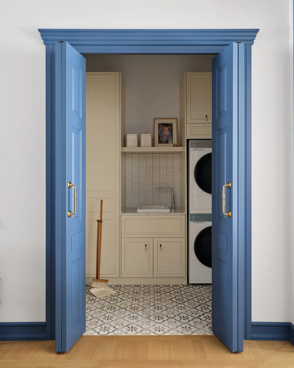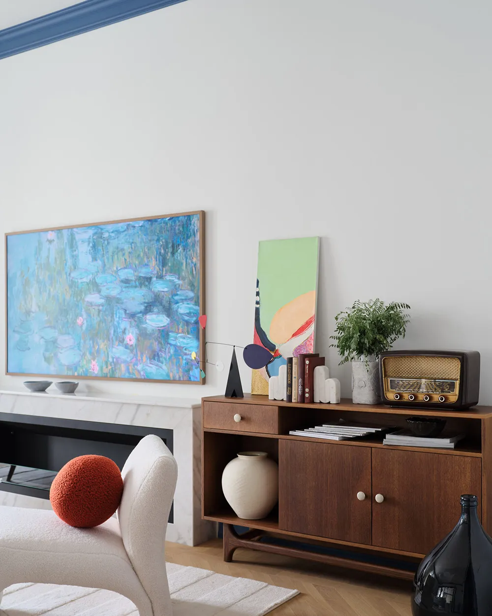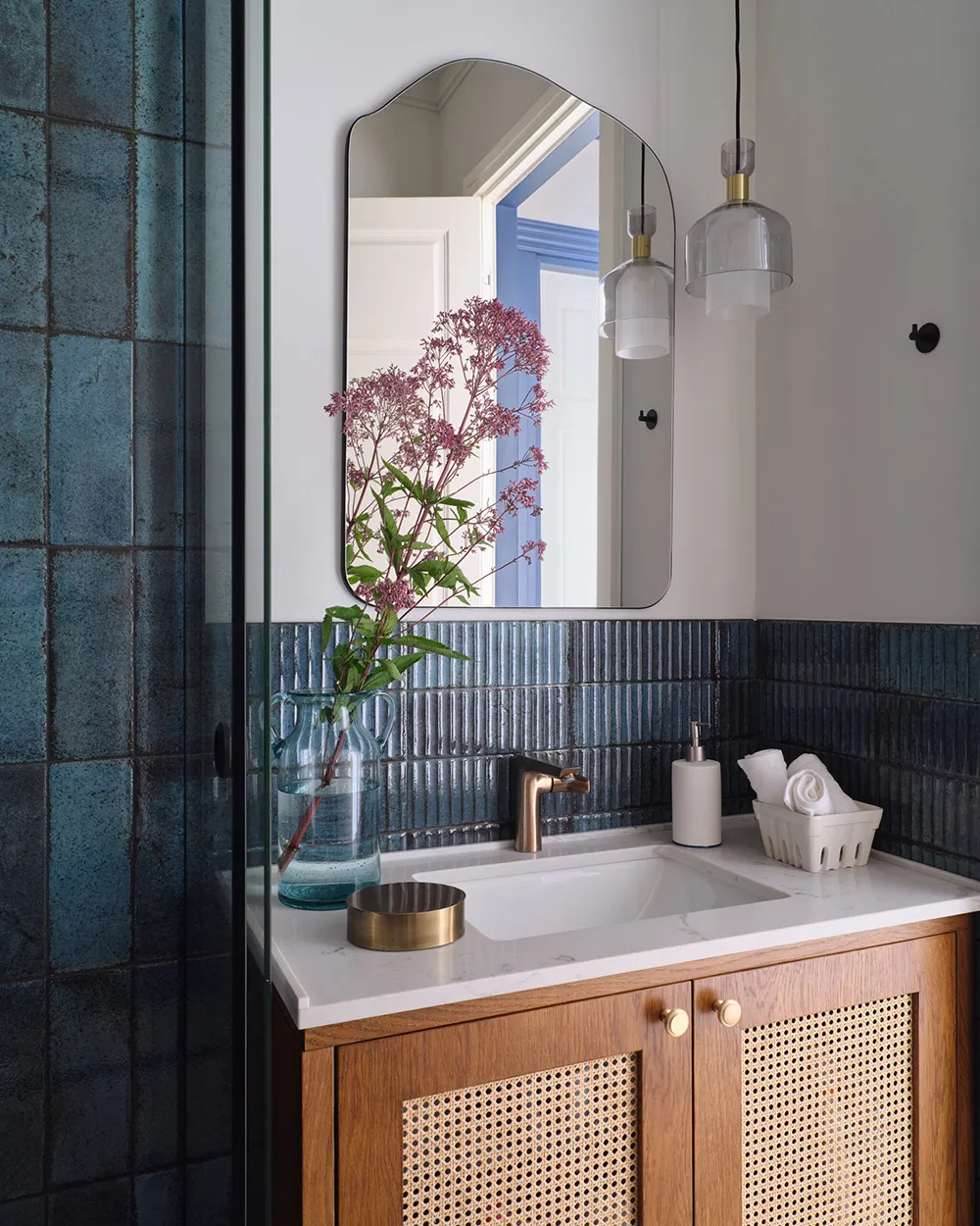 Fenêtres arciformes et salle de séjour aux murs bleus : appartement à Stockholm (90 m²)