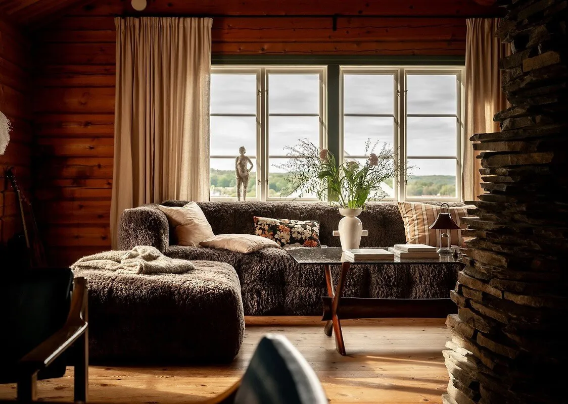 Maison en bois chaleureuse et confortable en Suède avec toit vert
