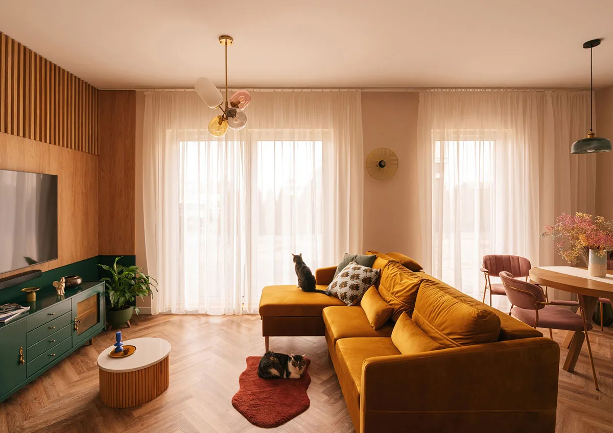 Beaux tons et notes d'art déco : intérieur d'une famille jeune à Wrocław