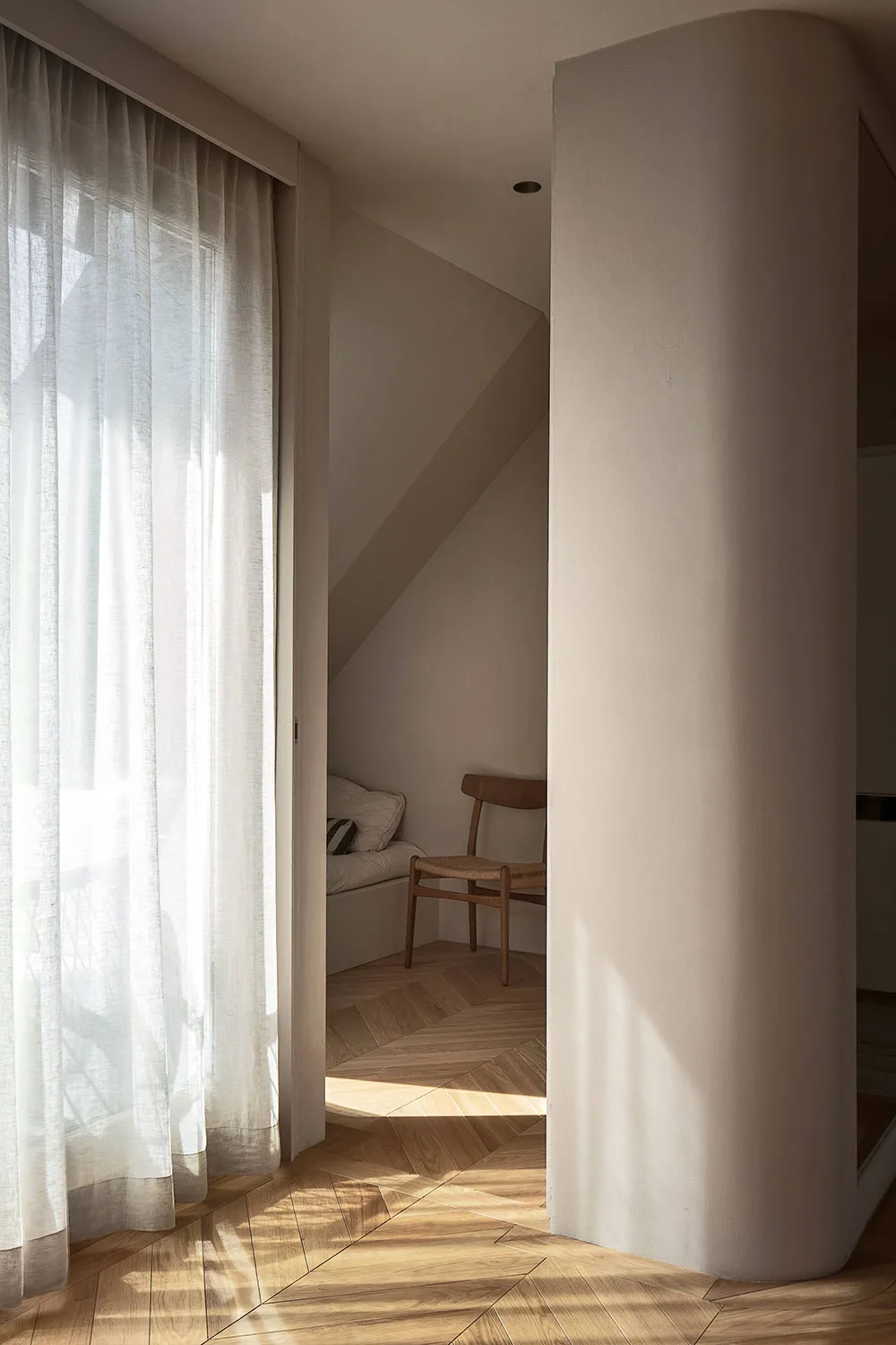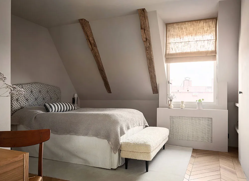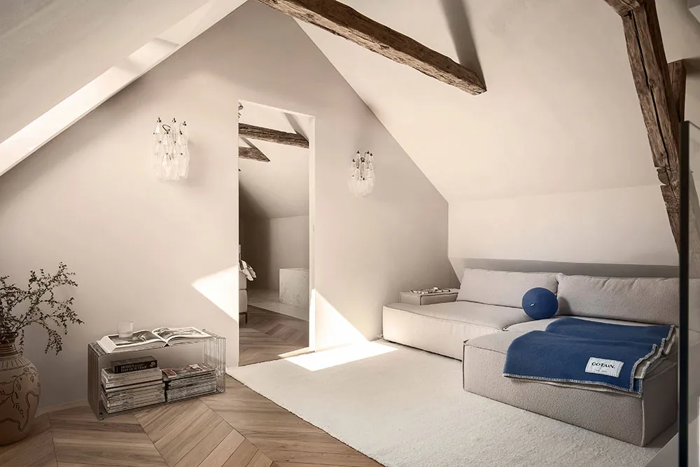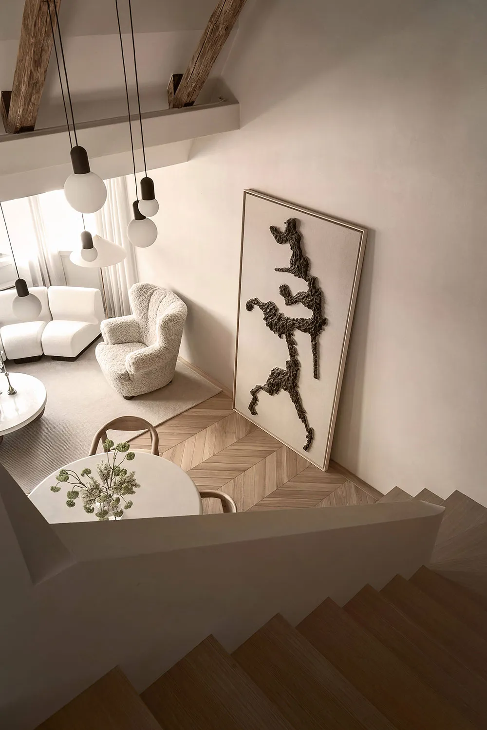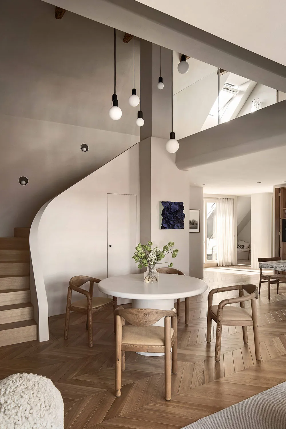 Intérieur scandinave doux avec escalier blanc et mansarde