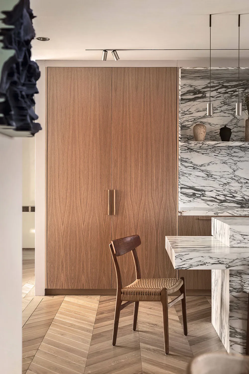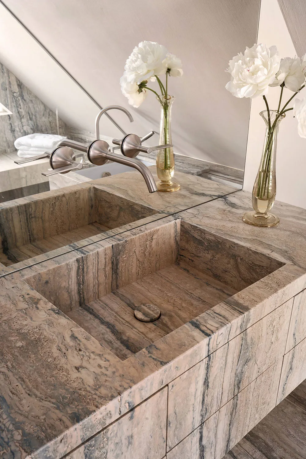 Les Scandinaves modérés utilisent rarement beaucoup de marbre dans leurs intérieurs, mais dans cet élégant appartement de mansarde à Stockholm, le stone naturel est devenu l'un des éléments les plus importants du design.