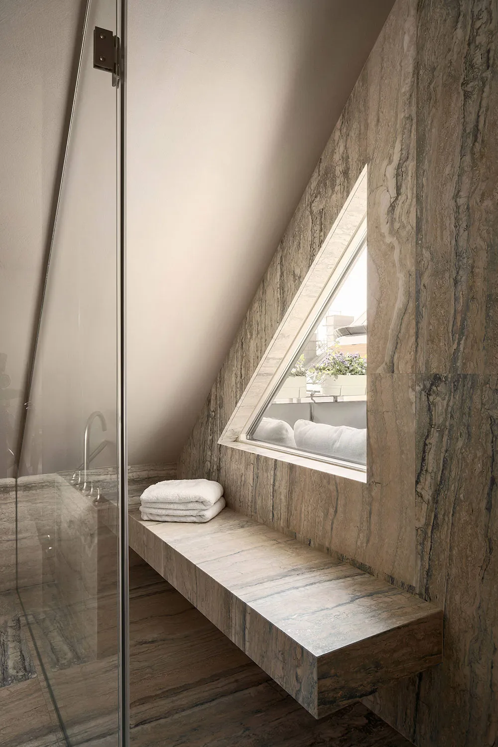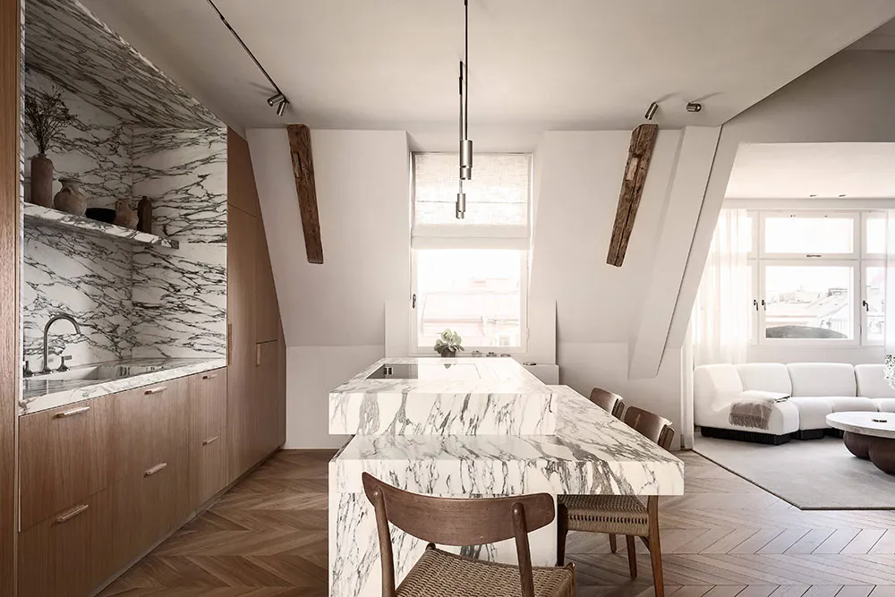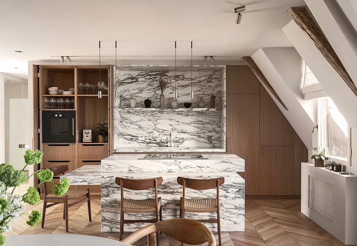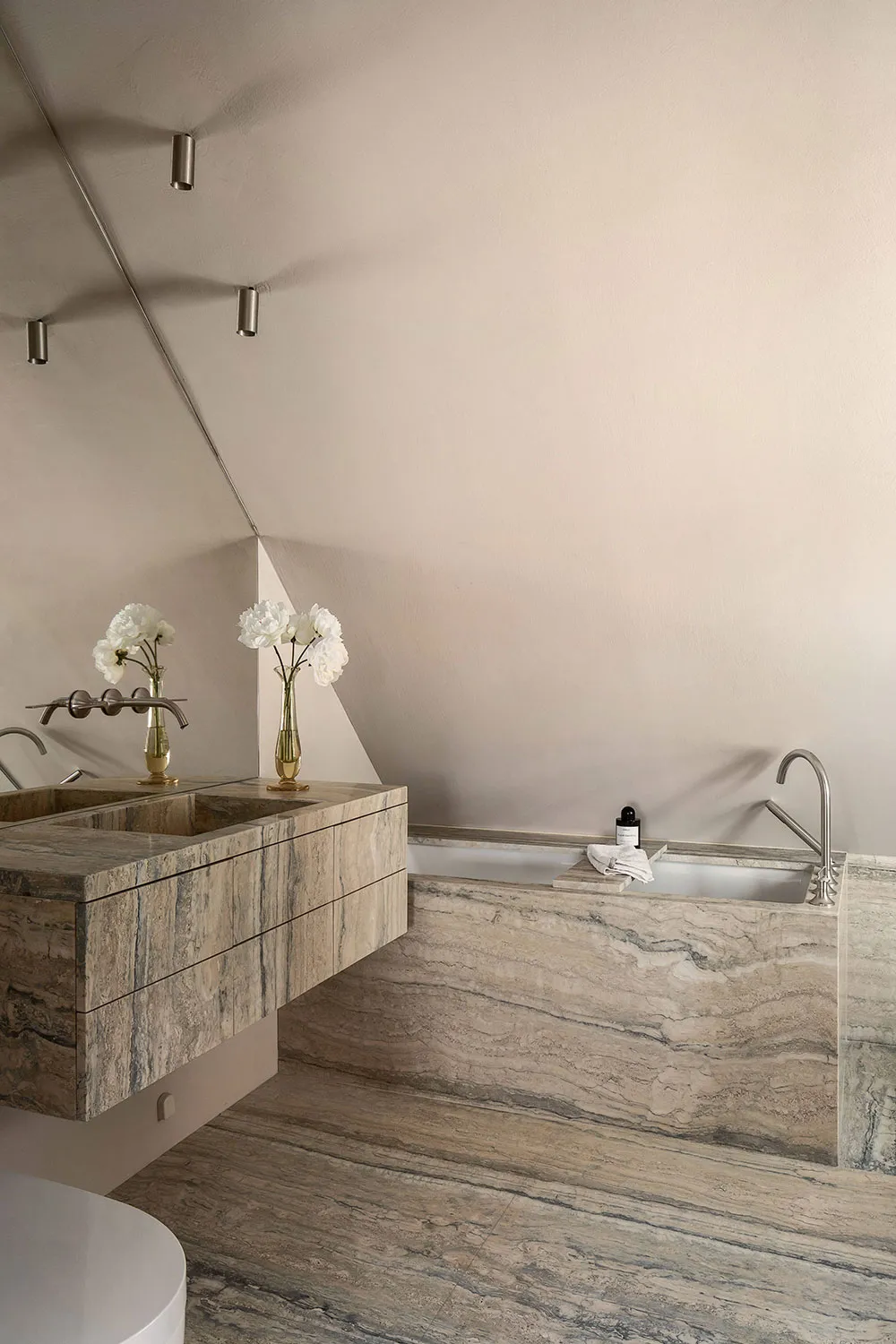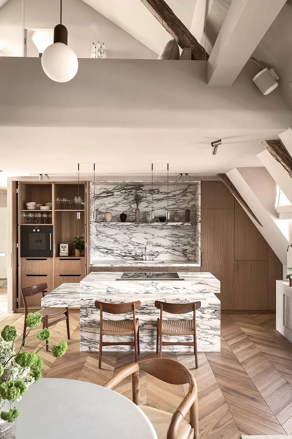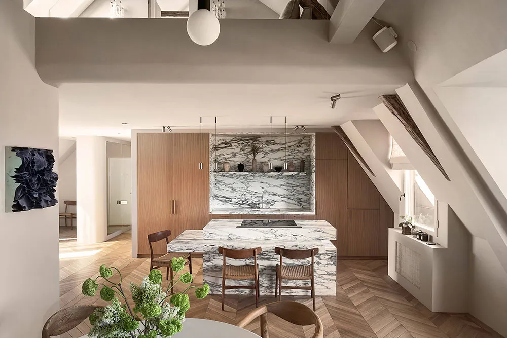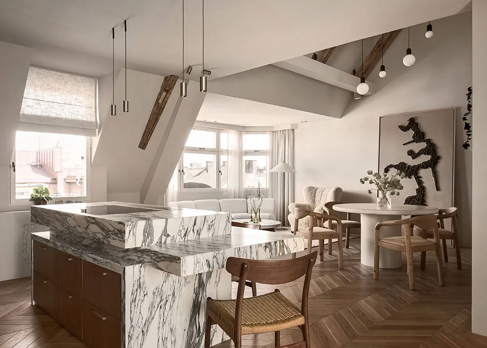 Luxueux marbre dans le design d'une élégante appartement de mansarde à Stockholm
