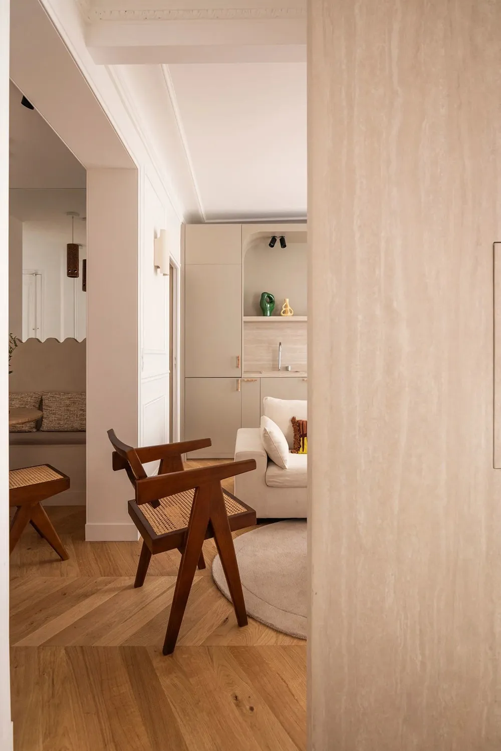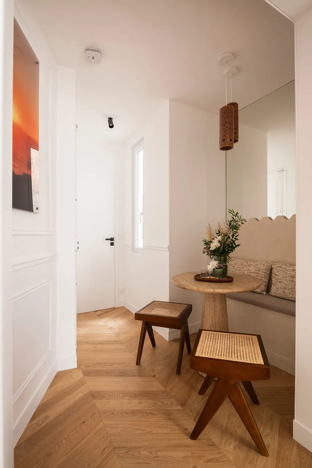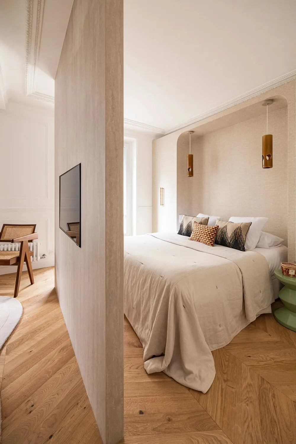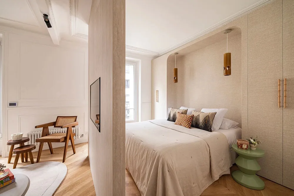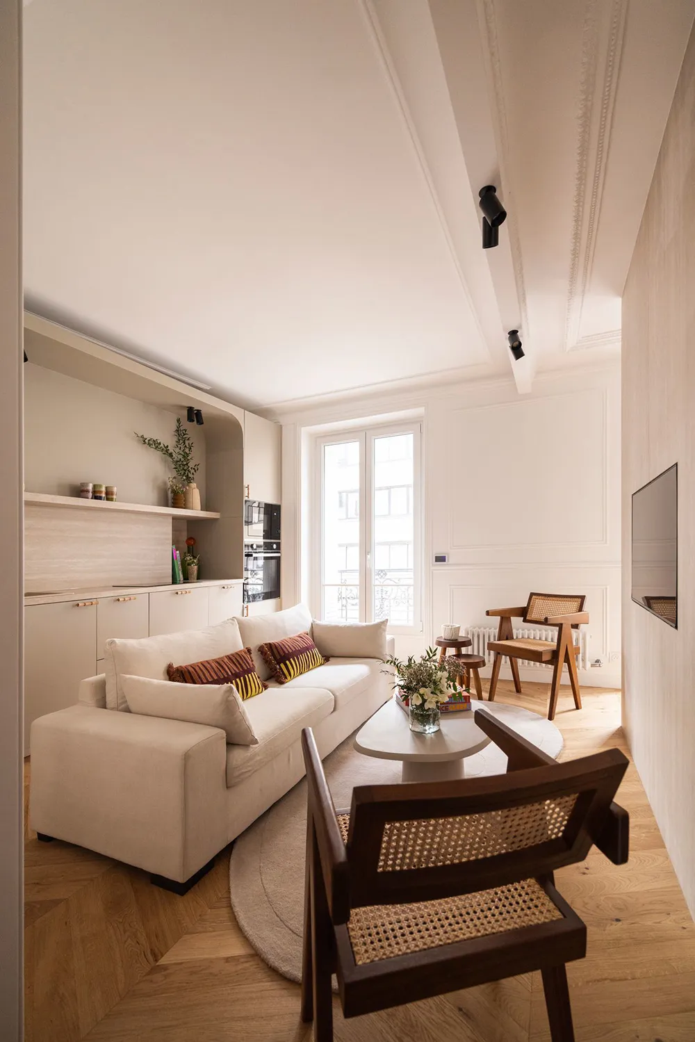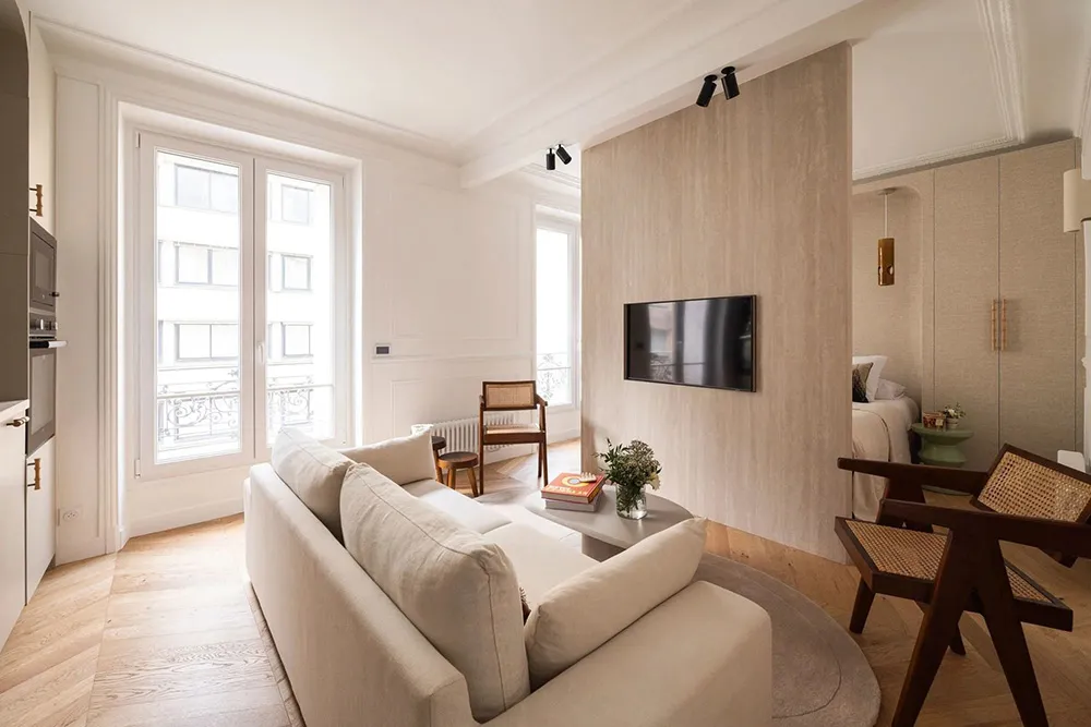 Lorsque le propriétaire de ce petit appartement du 16e arrondissement de Paris a contacté le designer Sarah Benhamou, il souhaitait redéfinir l'intérieur et créer un espace moderne léger rappelant une chambre d'hôtel.