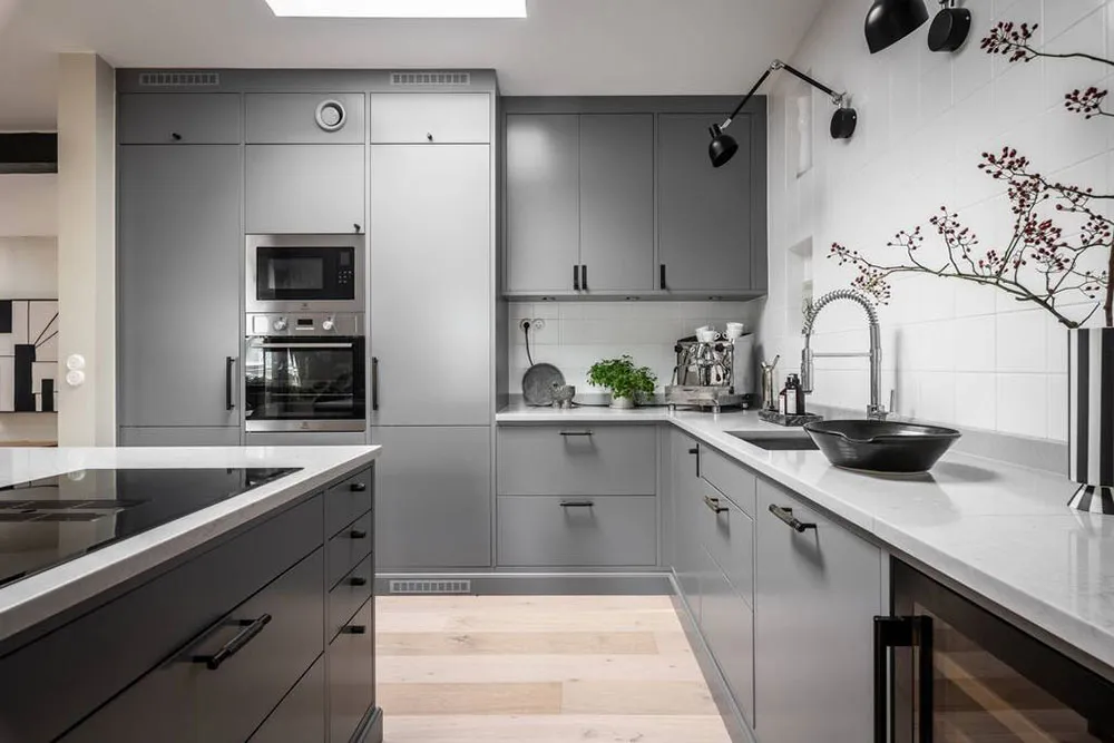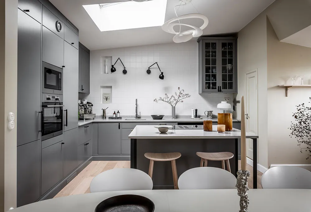 Les tons beiges et gris dans cette grande mansarde à Göteborg s'opposent l'un à l'autre d'un côté comme chauds et frais, mais de l'autre les complètent et renforcent l'impression globale du design.