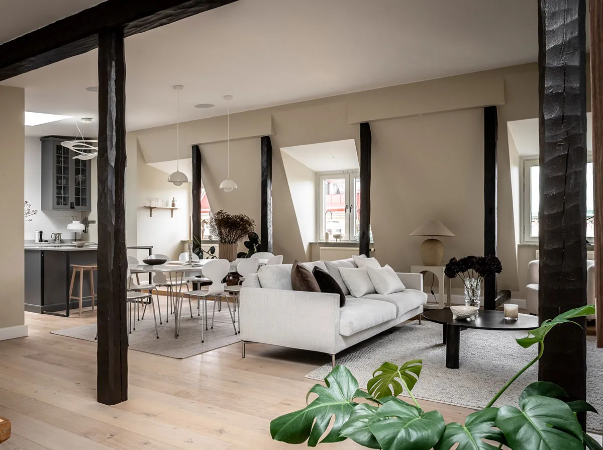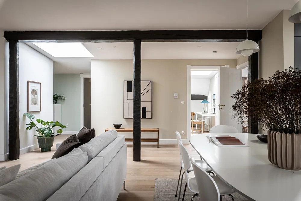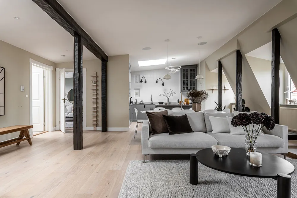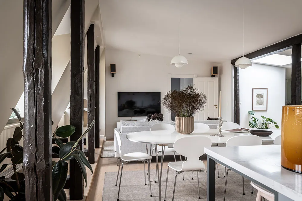 Intérieur chaleureux et élégant d'une grande mansarde à Göteborg