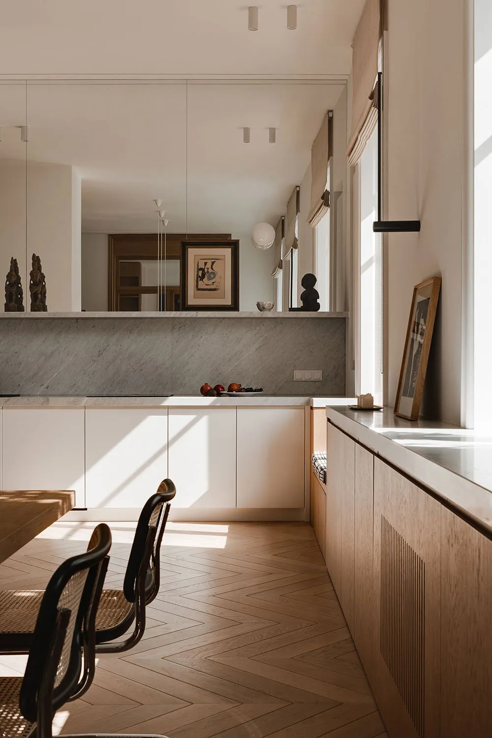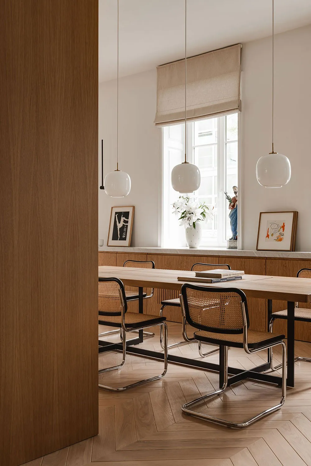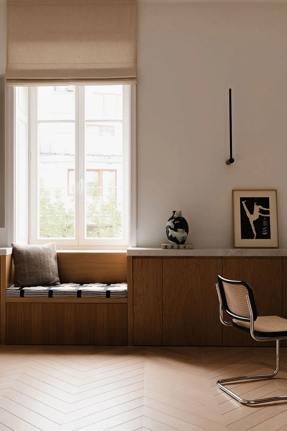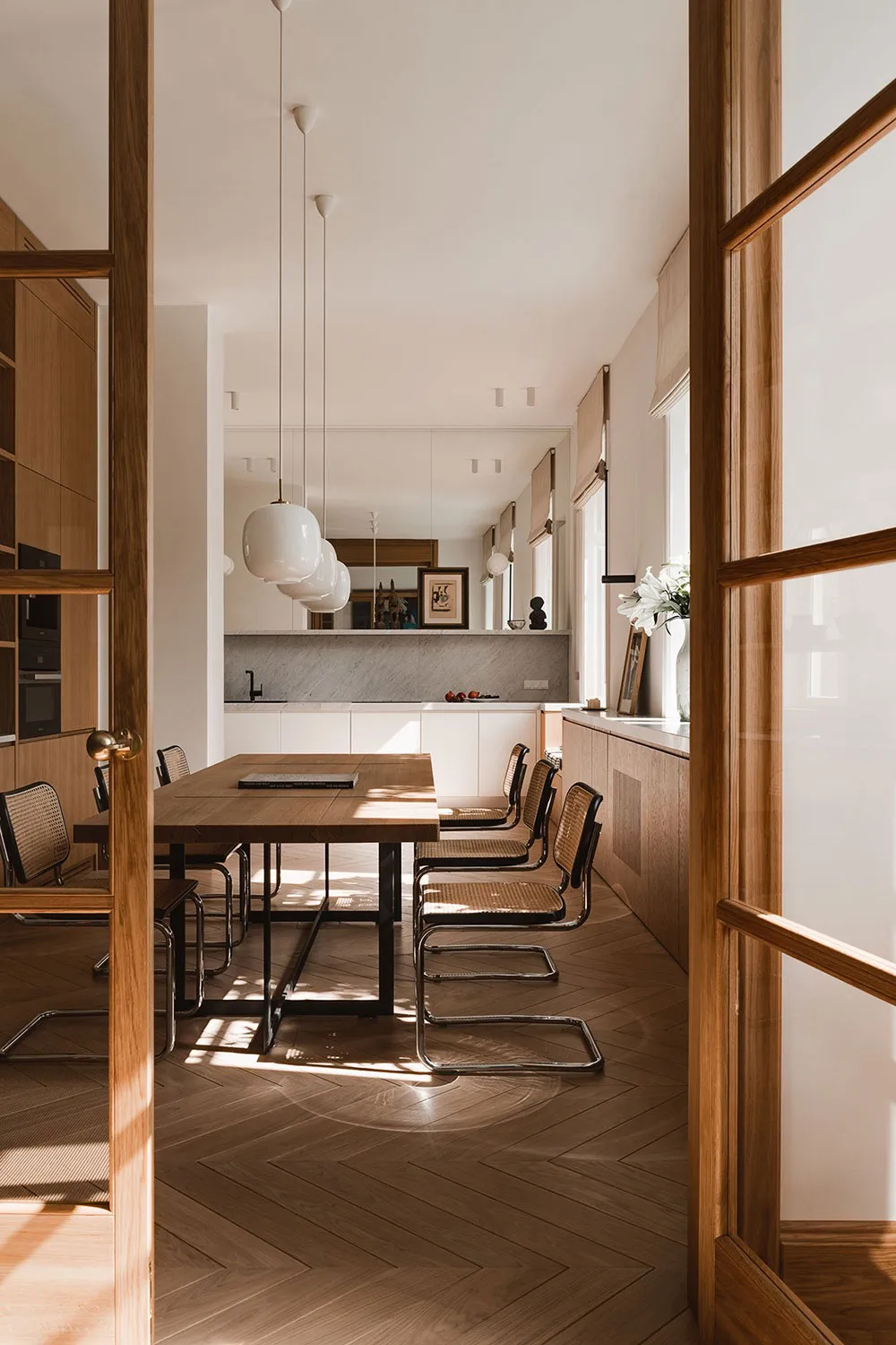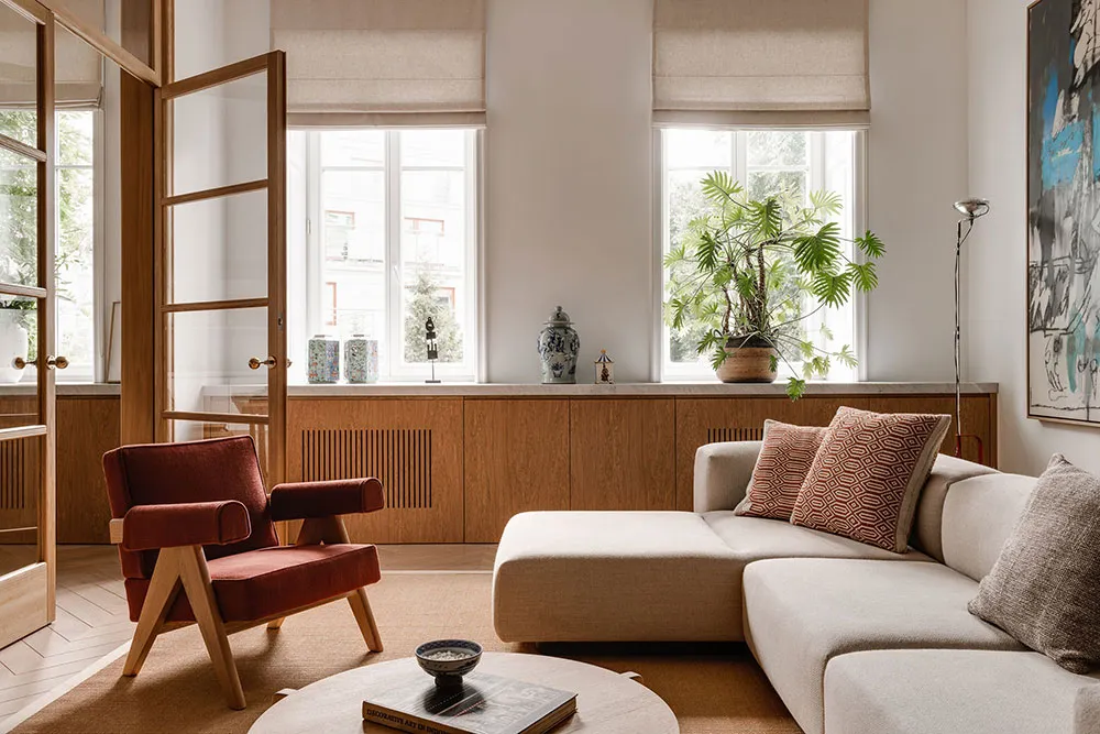 Modernité élégante et accents mid-century : un appartement beau dans un ancien bâtiment à Varsovie