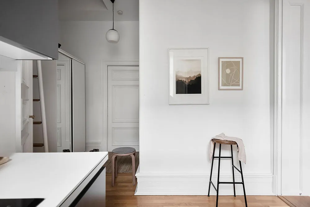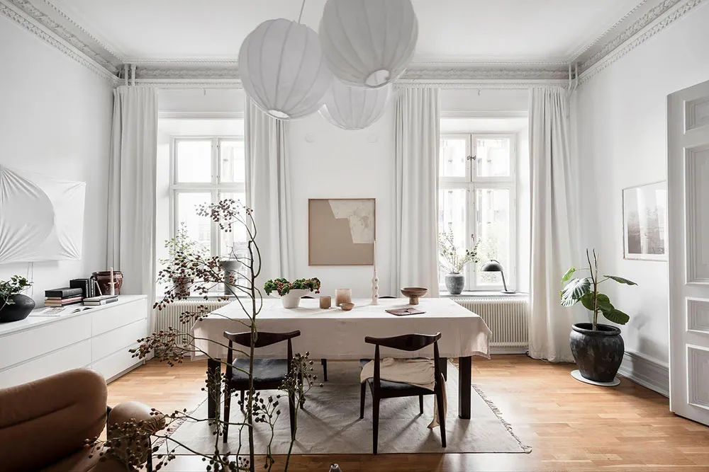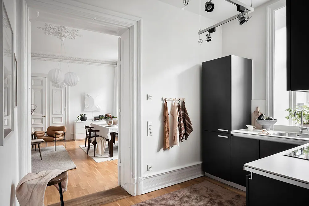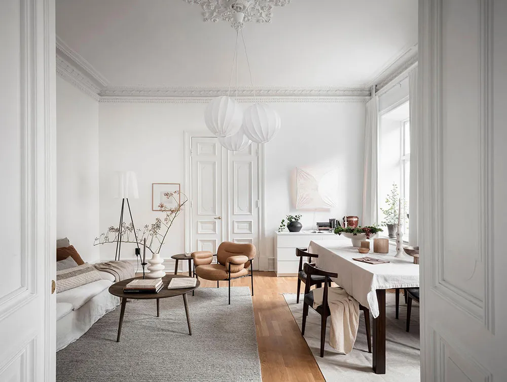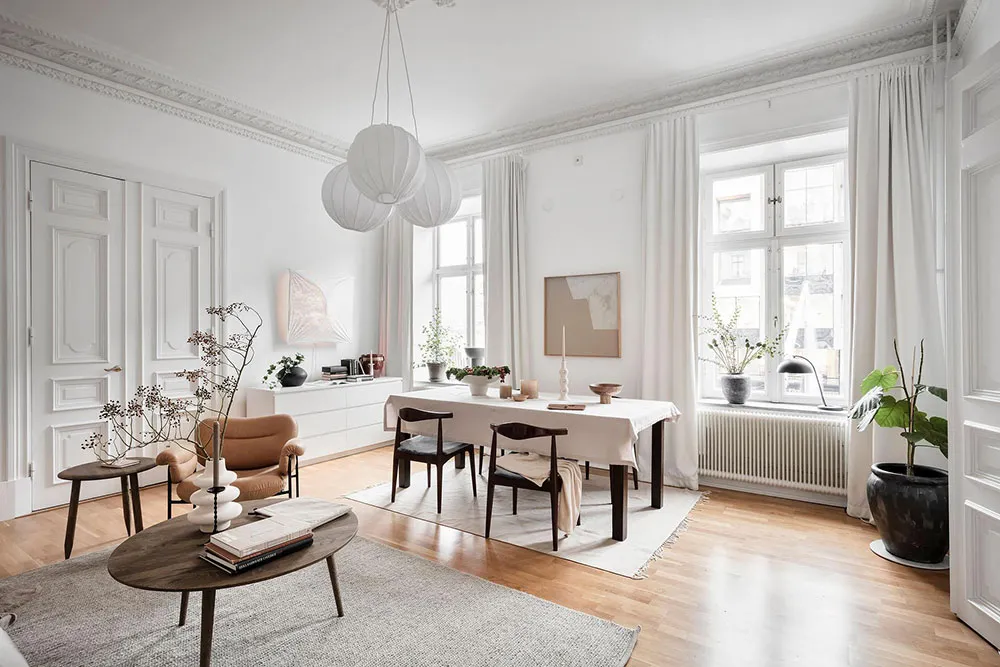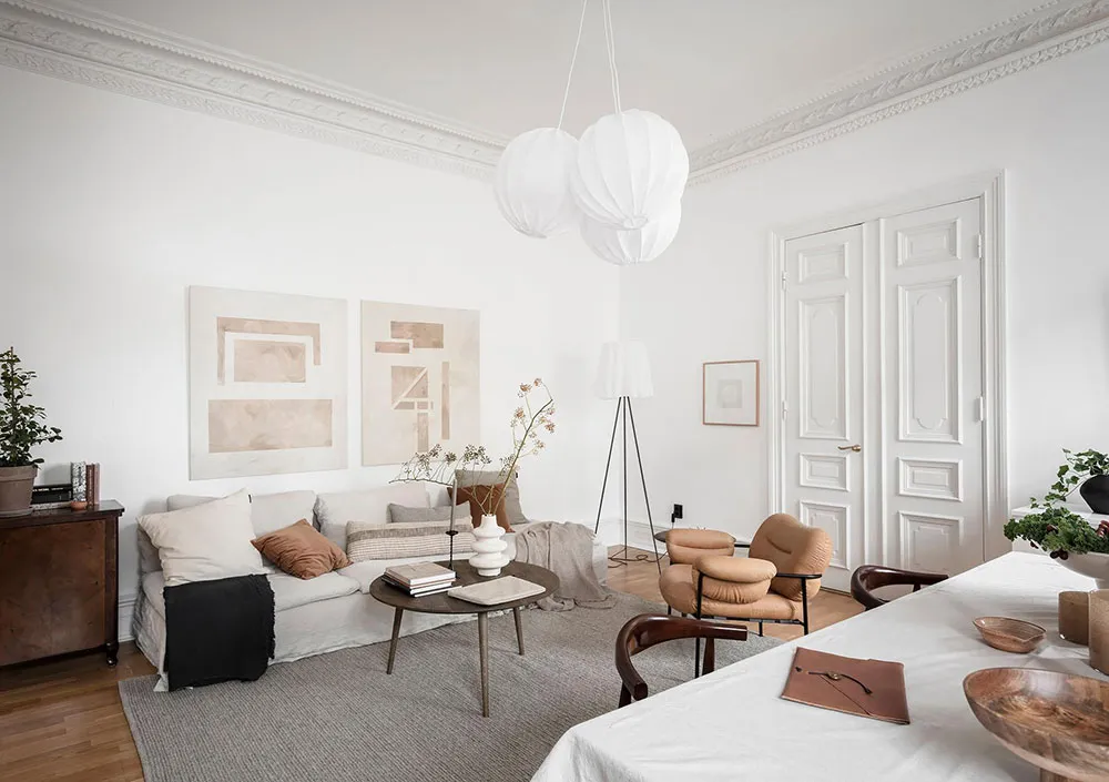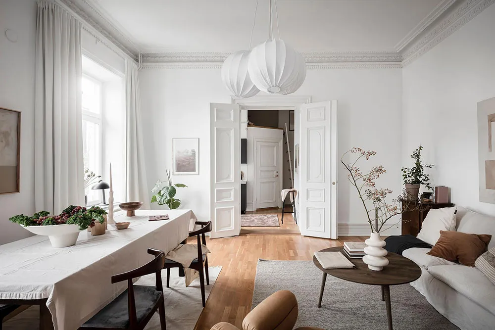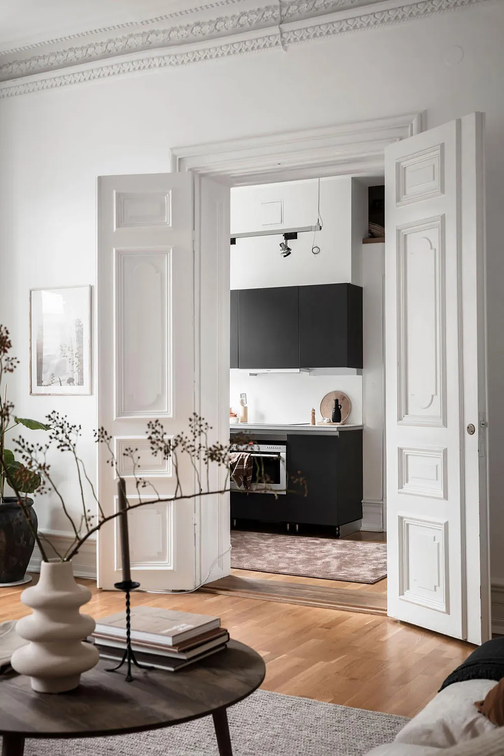 Lorsque vous voyez le salon lumineux et ouvert de cet appartement suédois aux hauts plafonds et décorations, il semble que ce soit un vaste appartement avec plusieurs grandes pièces dans un style classique.