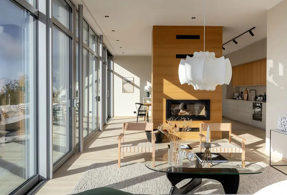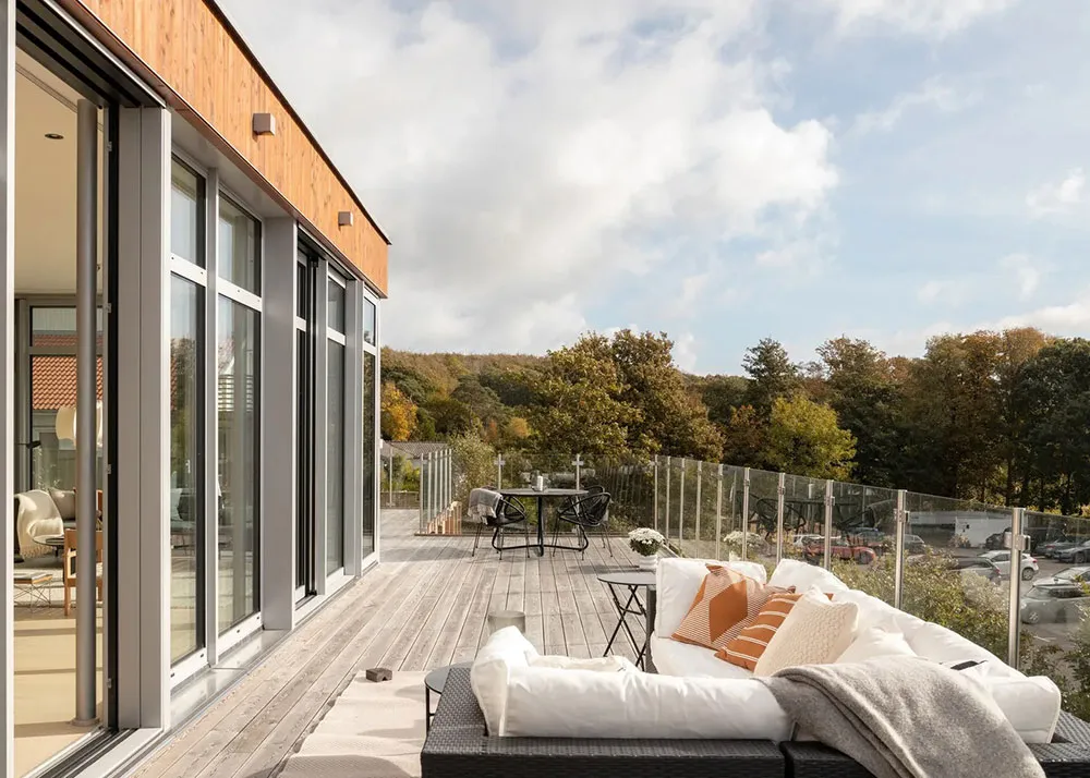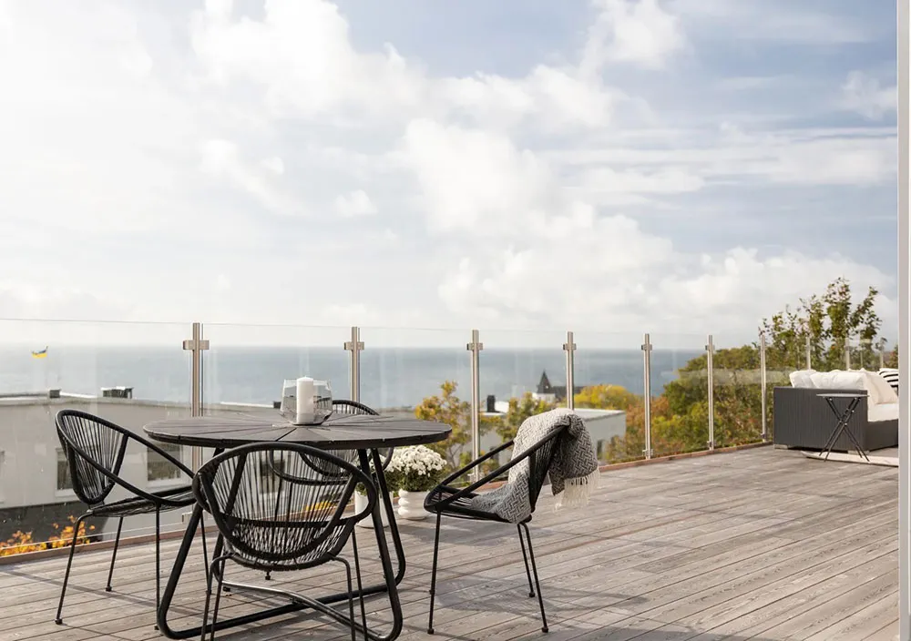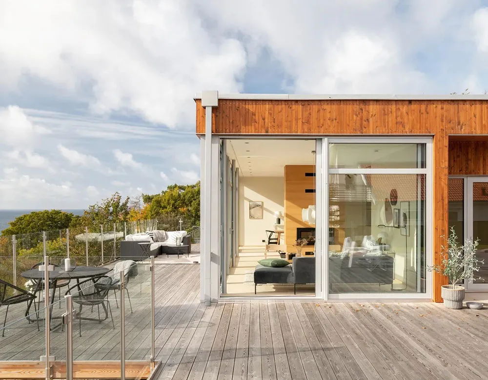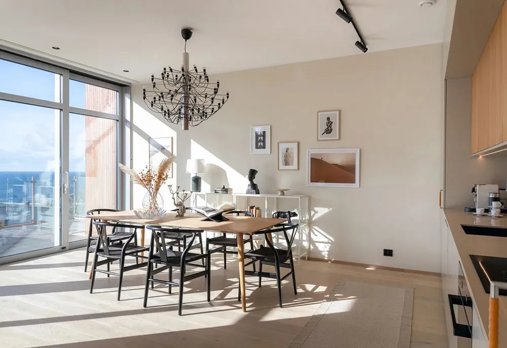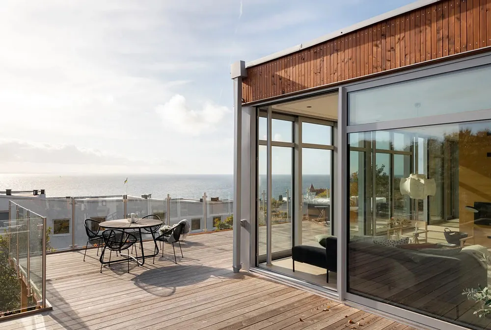 Appartement en bord de mer en Suède avec une grande terrasse et des intérieurs inondés de lumière du soleil