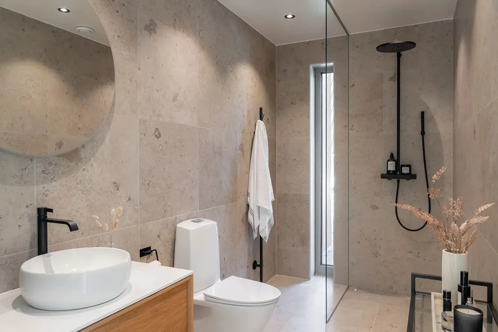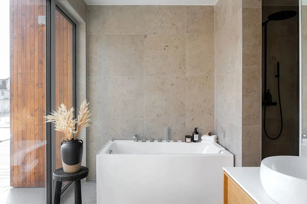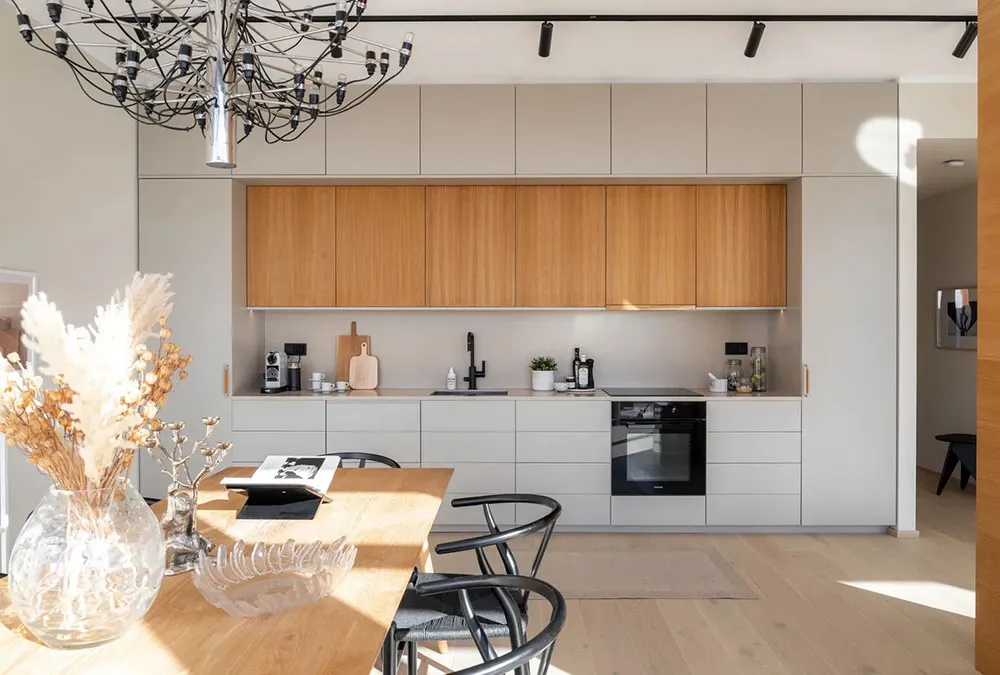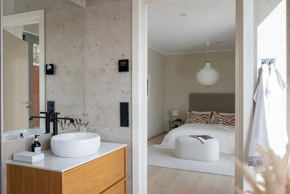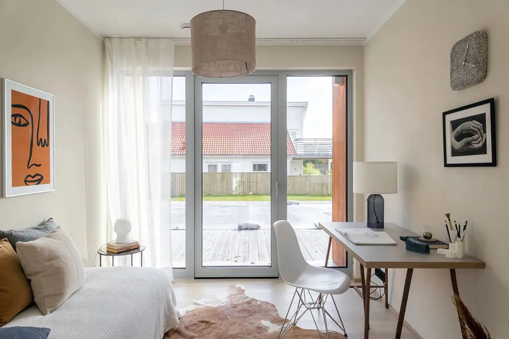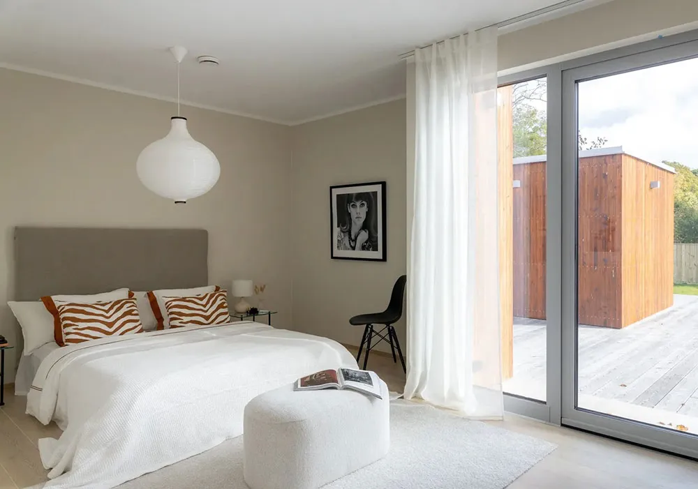 Appartement en bord de mer en Suède avec une grande terrasse et des intérieurs inondés de lumière du soleil