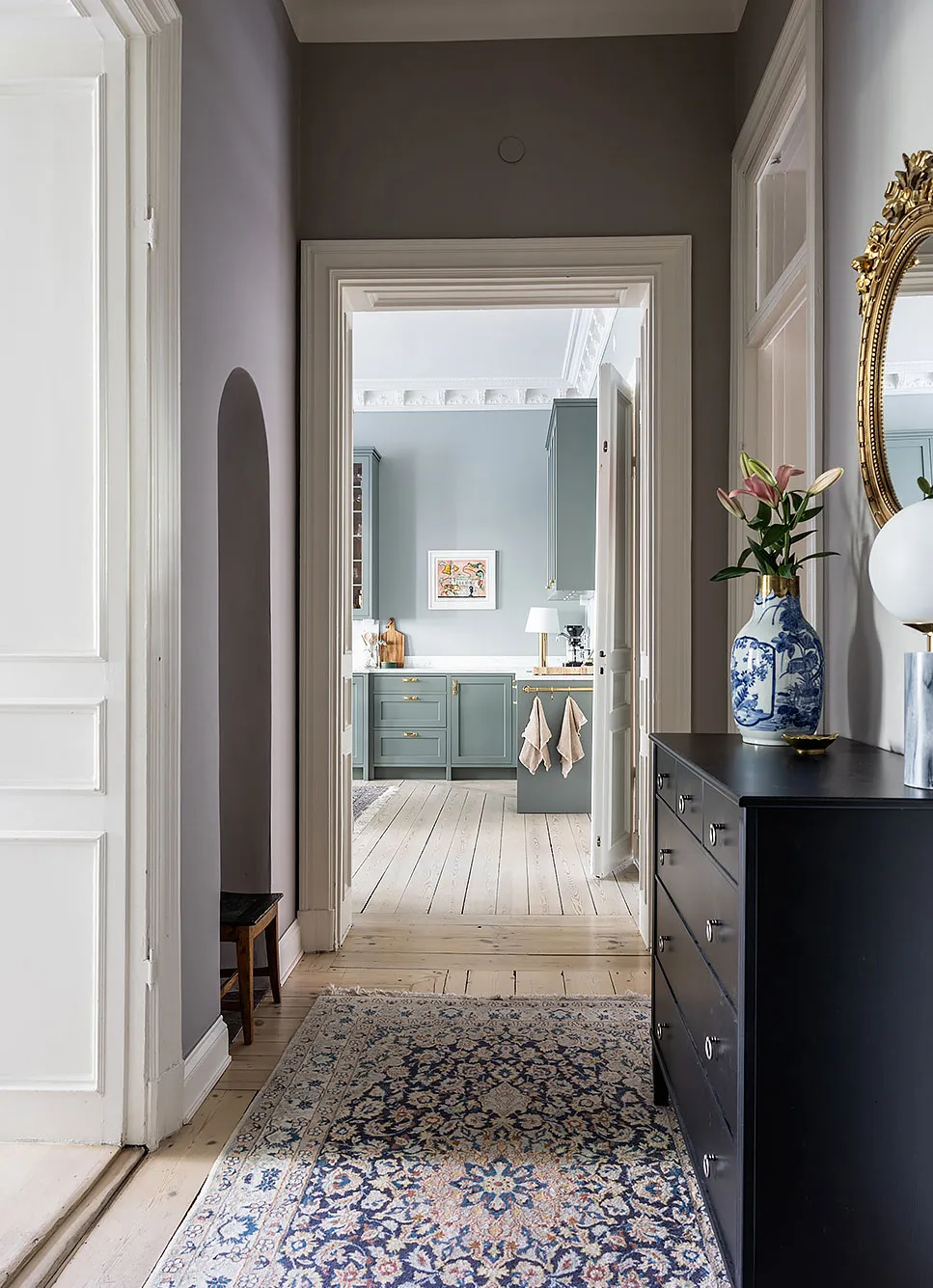 À l'origine, il s'agit d'un intérieur scandinave typique : des espaces caractéristiques aux hauts plafonds, des placards de cuisine typiques, un sol en pins clair.