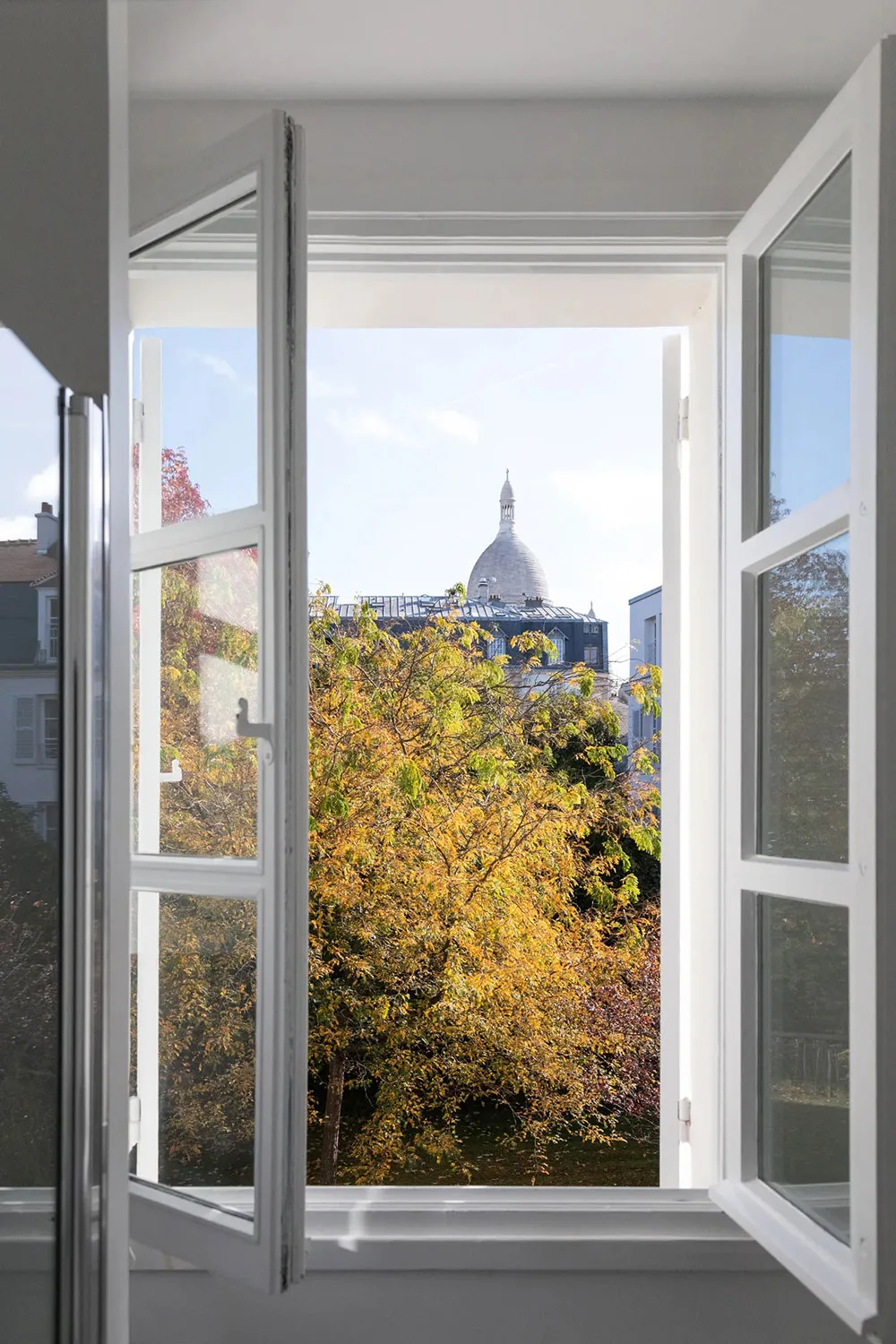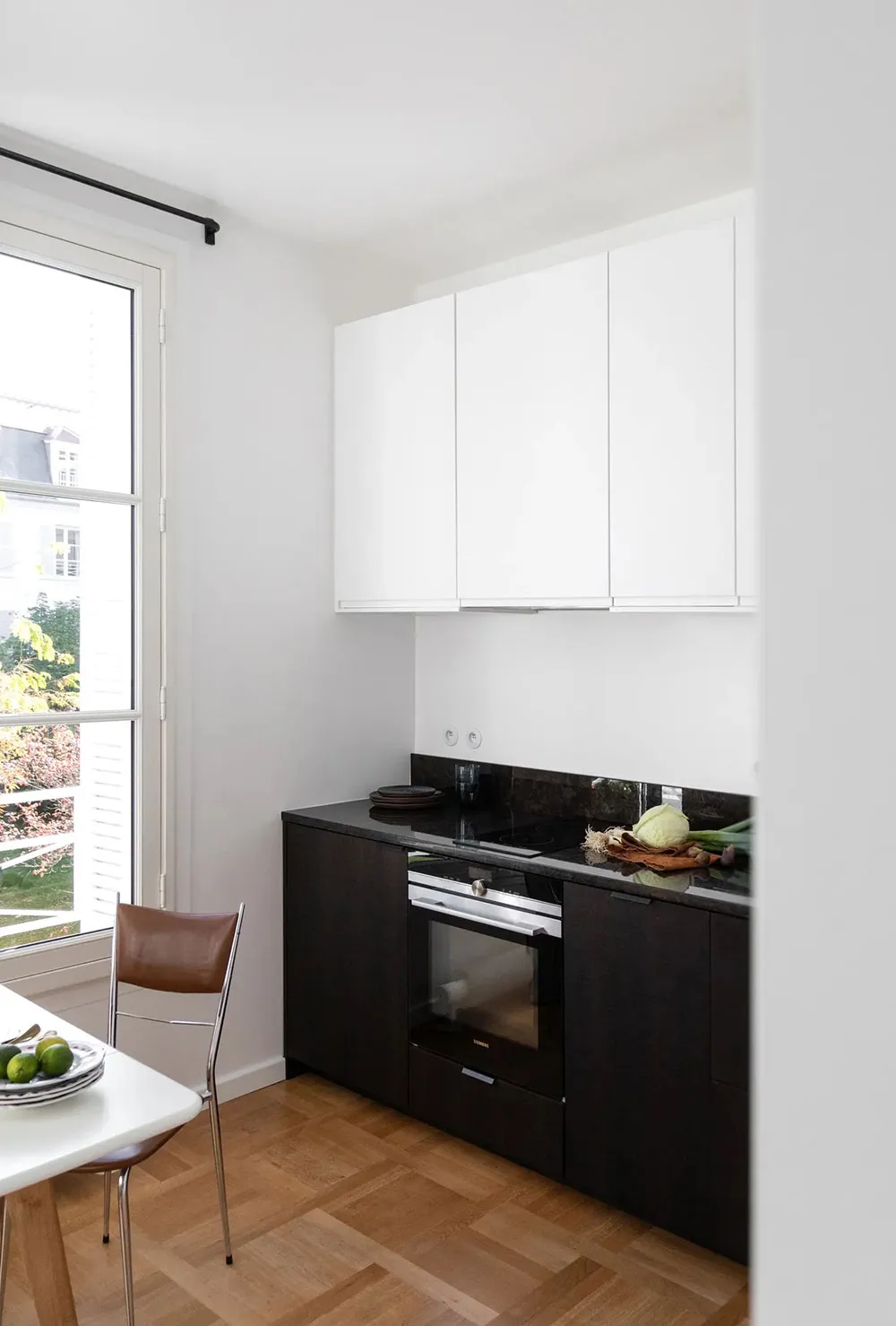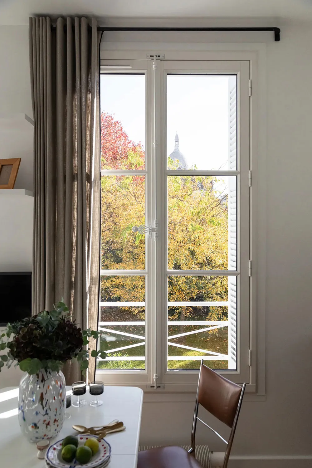 Petite appartement blanc à Paris avec vue sur le parc (25 m²)