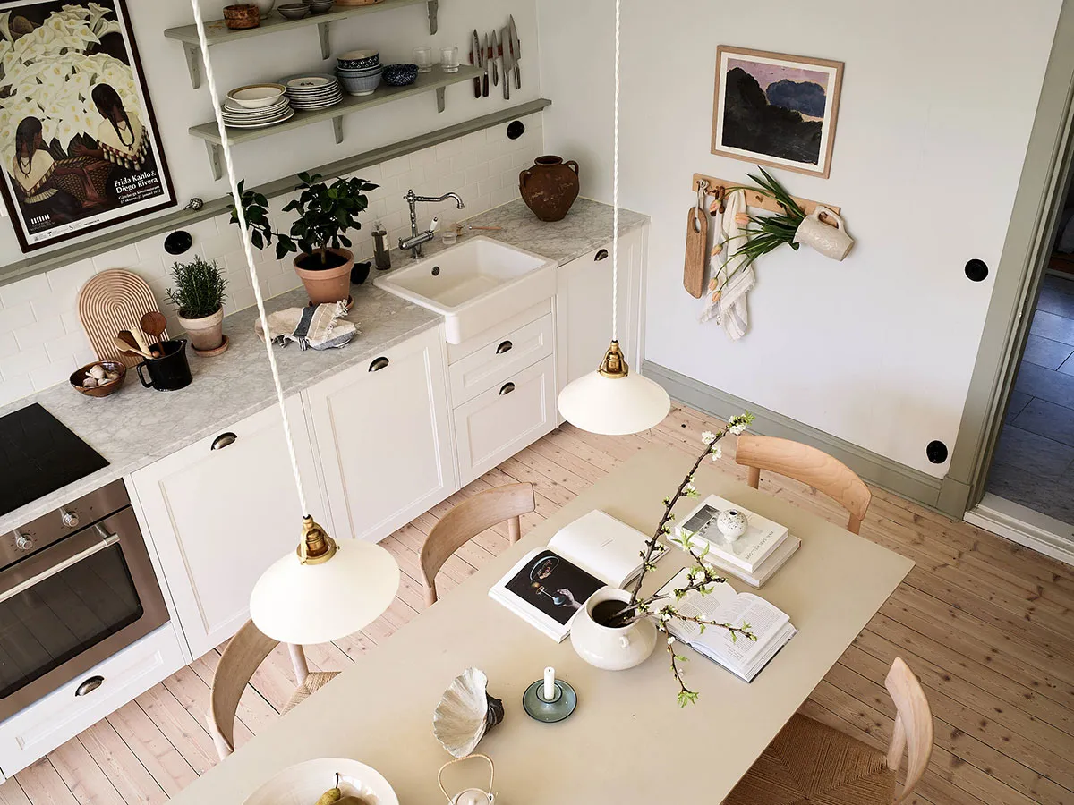 Appartement à l'ambiance pâle et pastel en Suède avec une cuisine bleue