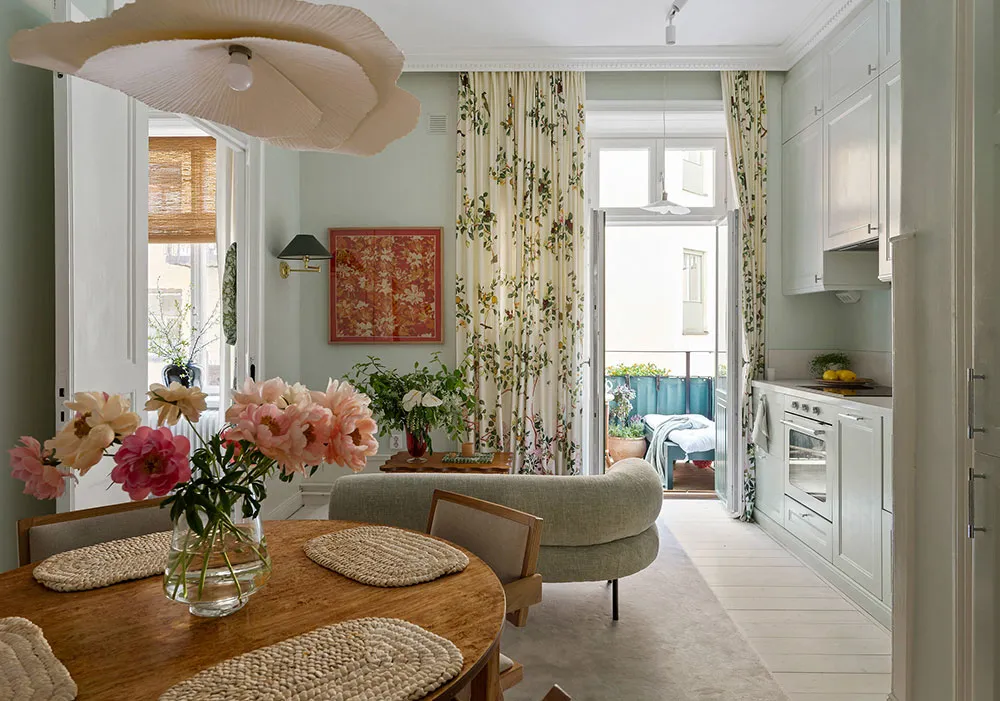 Dans la décoration de cet élégant appartement d'un bâtiment centenaire à Göteborg, les designers ont principalement utilisé des teintes pastel agréables et douces, ainsi que des accents décoratifs de tons neutres.