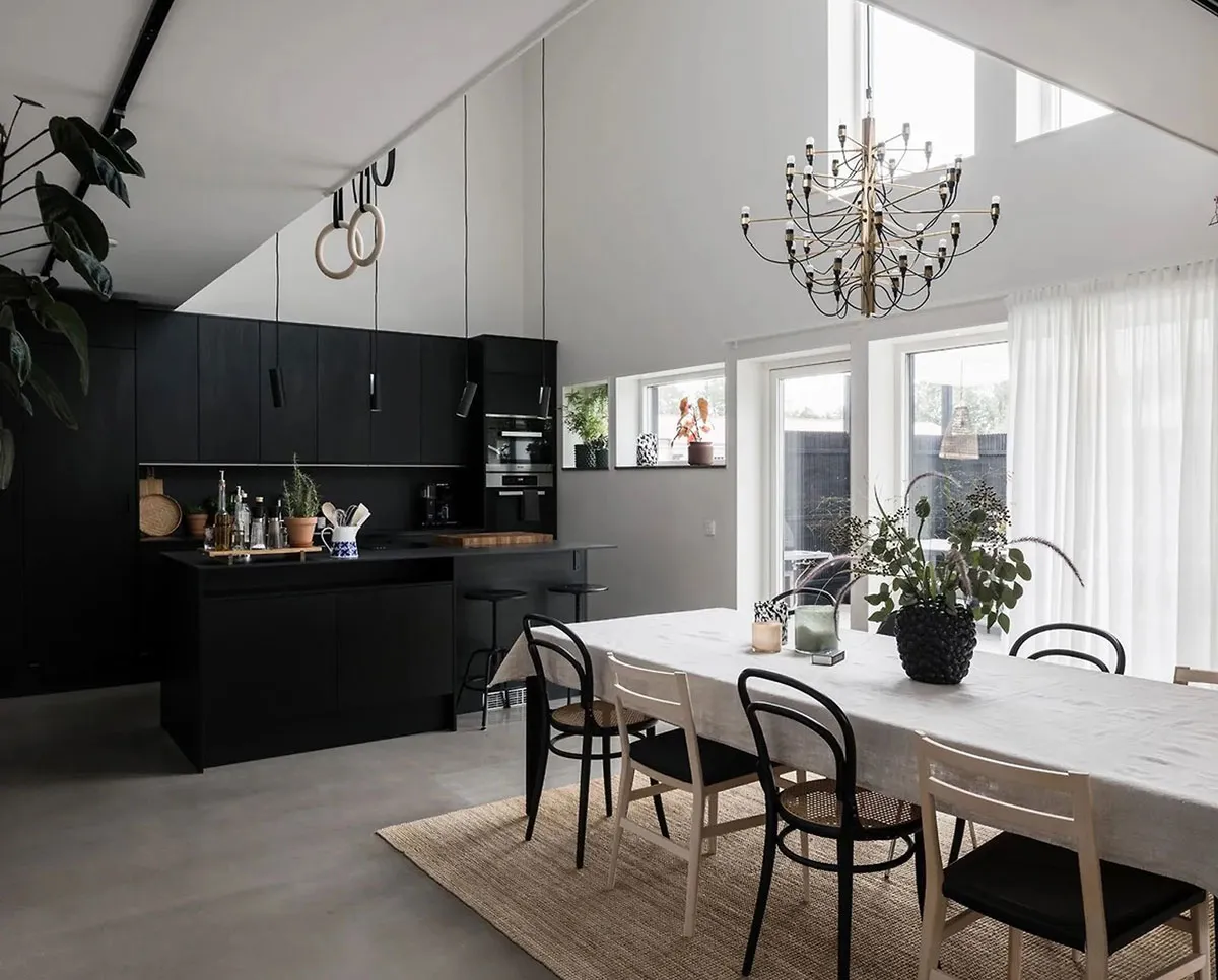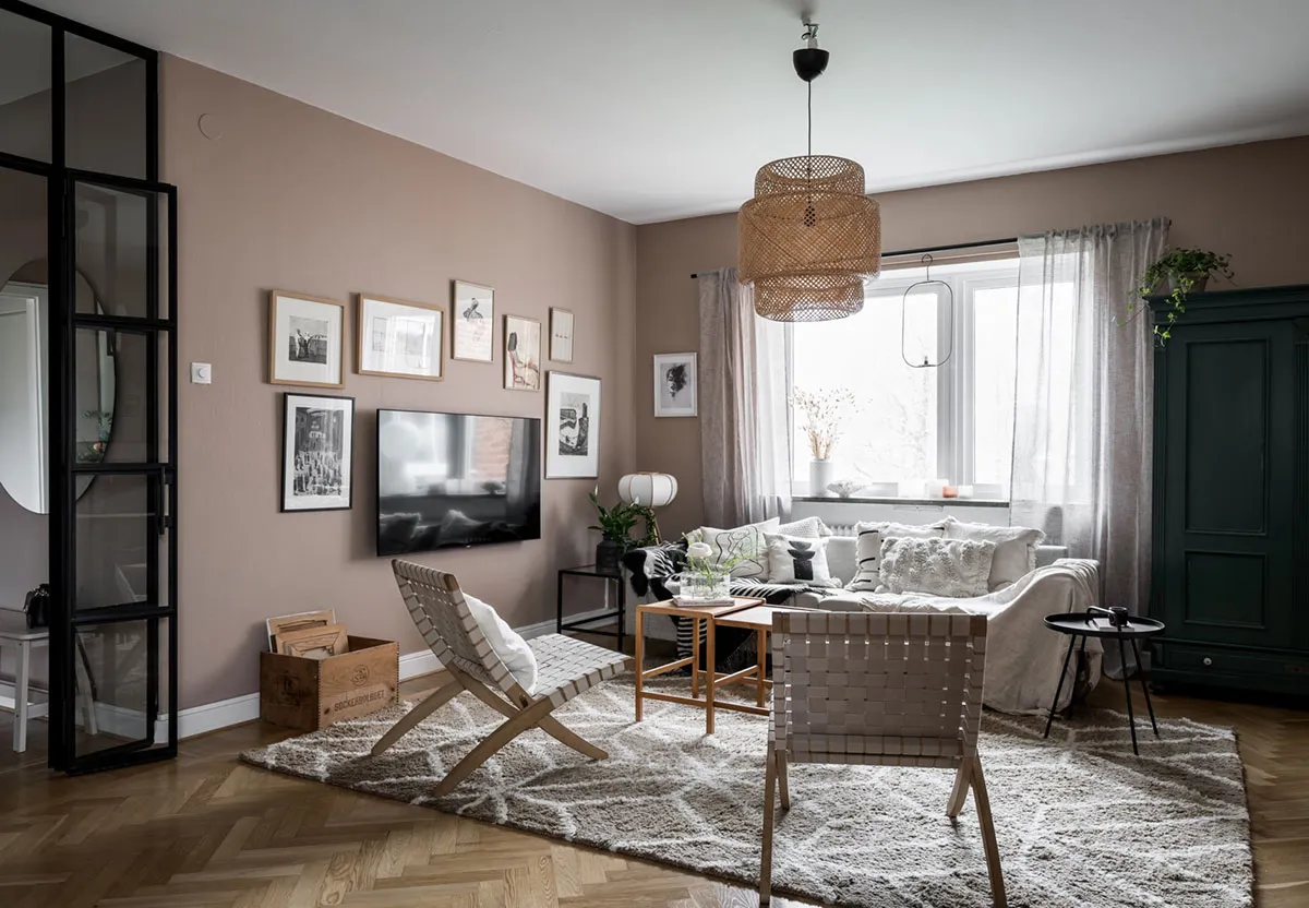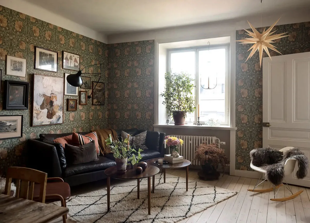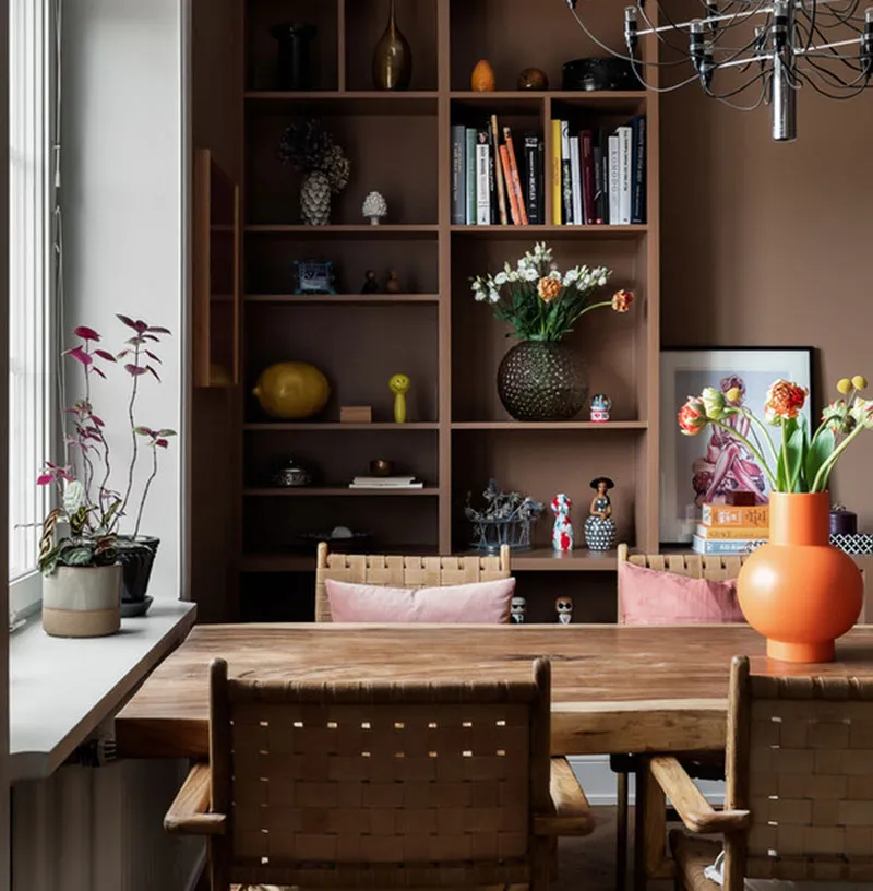 Appartement suédois cosy avec murs de café et mobilier vintage