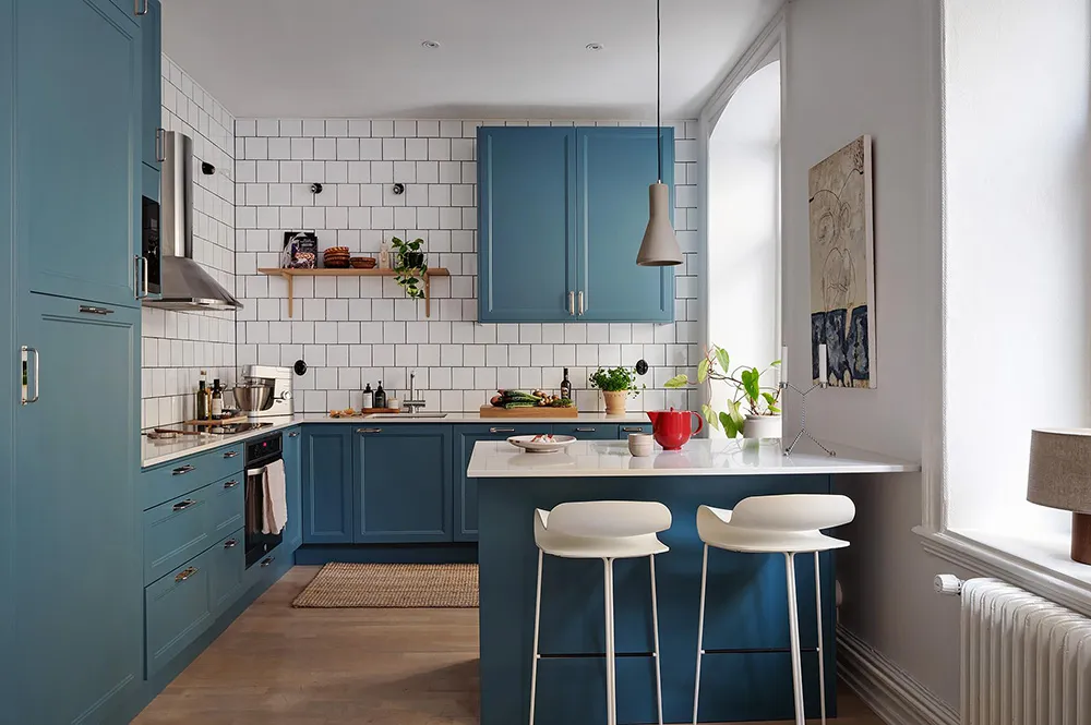 Appartement à l'ambiance pâle et pastel en Suède avec une cuisine bleue