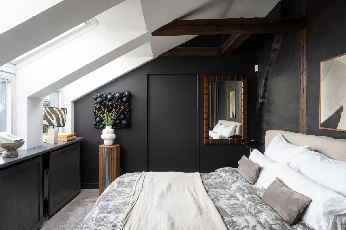 Plafonds inclinés et murs noirs : mansarde à Stockholm (82 m²)