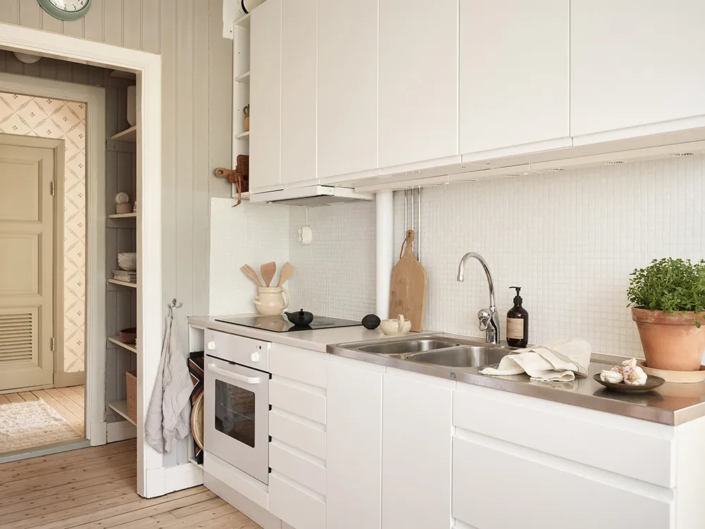L'intérieur de cet appartement situé en périphérie de Gotenborg est extrêmement sobre : murs blancs, mobilier sobriement économique, décoration discrète.
