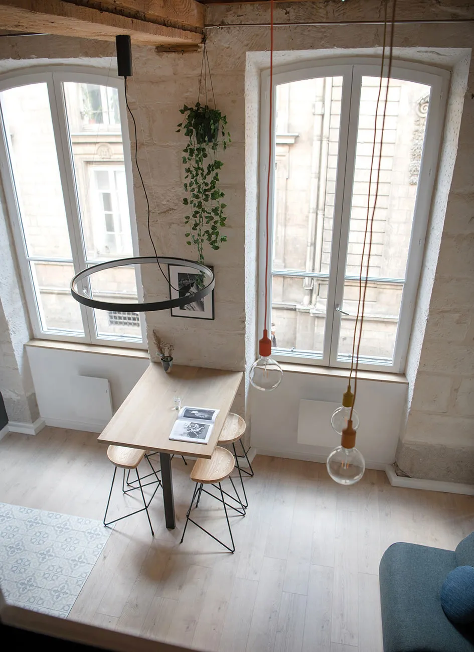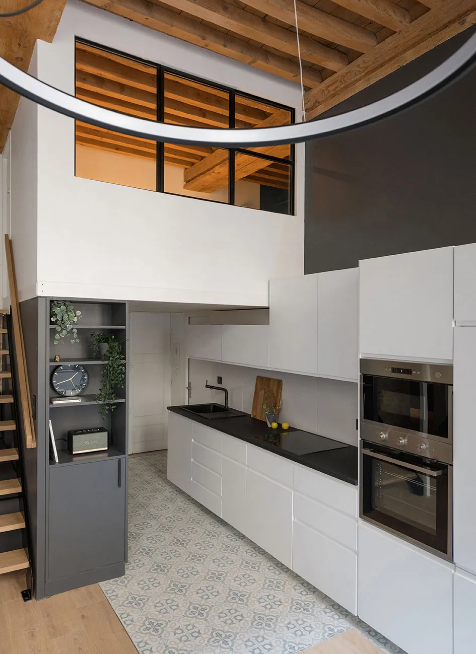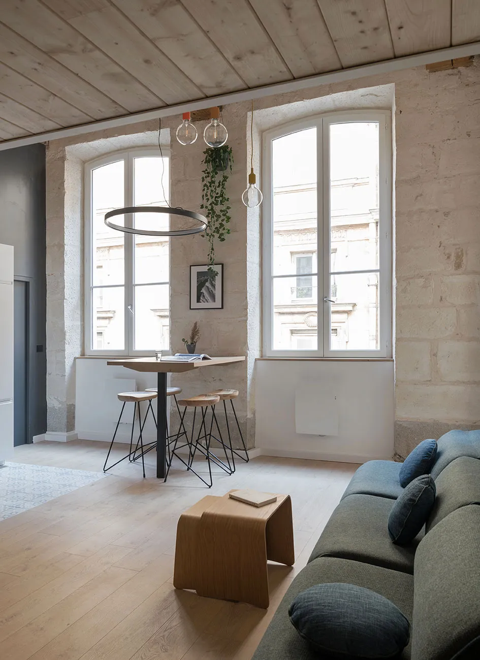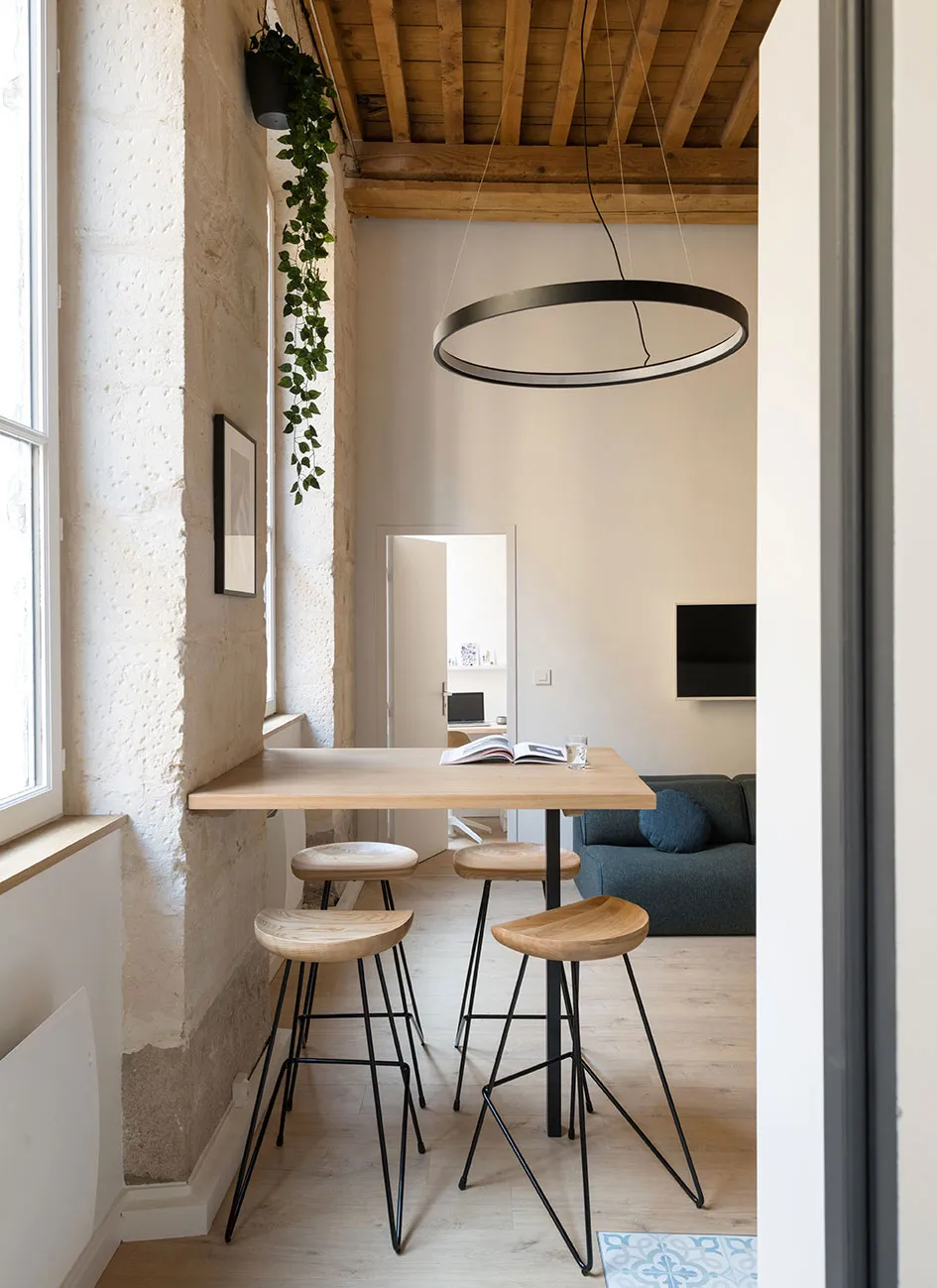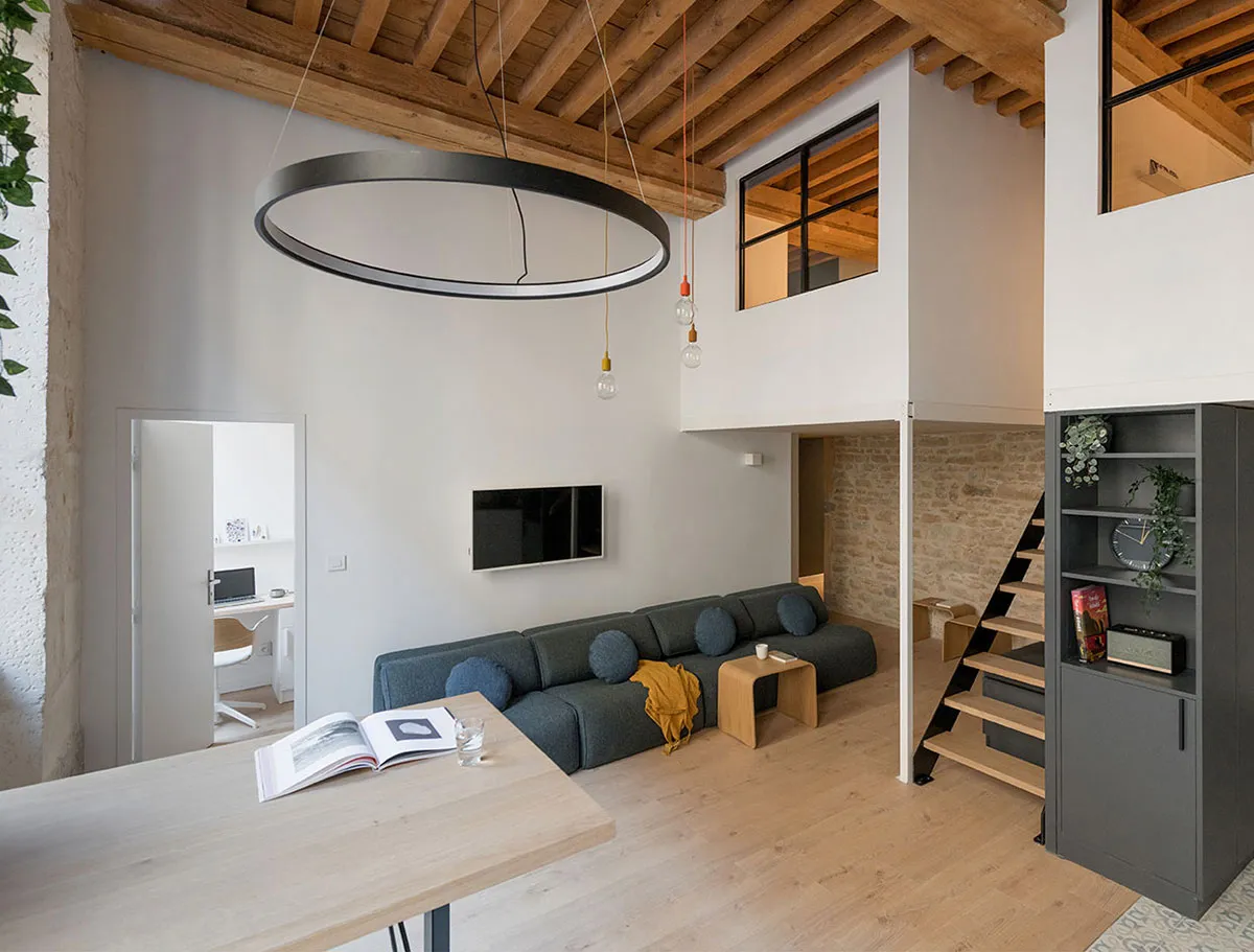 Des plafonds en poutre élégants, d'immenses fenêtres et beaucoup de lumière — déjà avant les travaux, cette appartement à Lyon présentait des atouts impressionnants qui la distinguent favorablement par rapport aux autres.