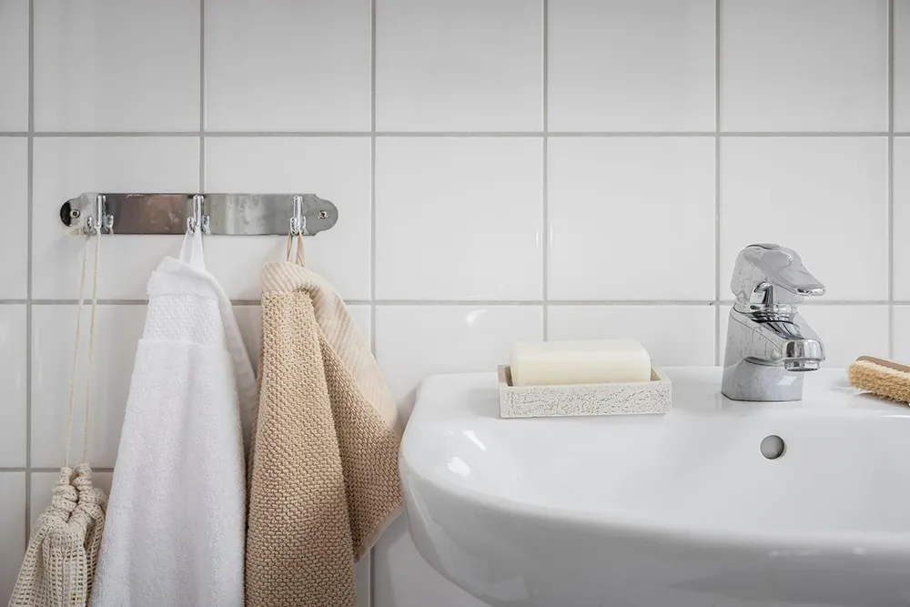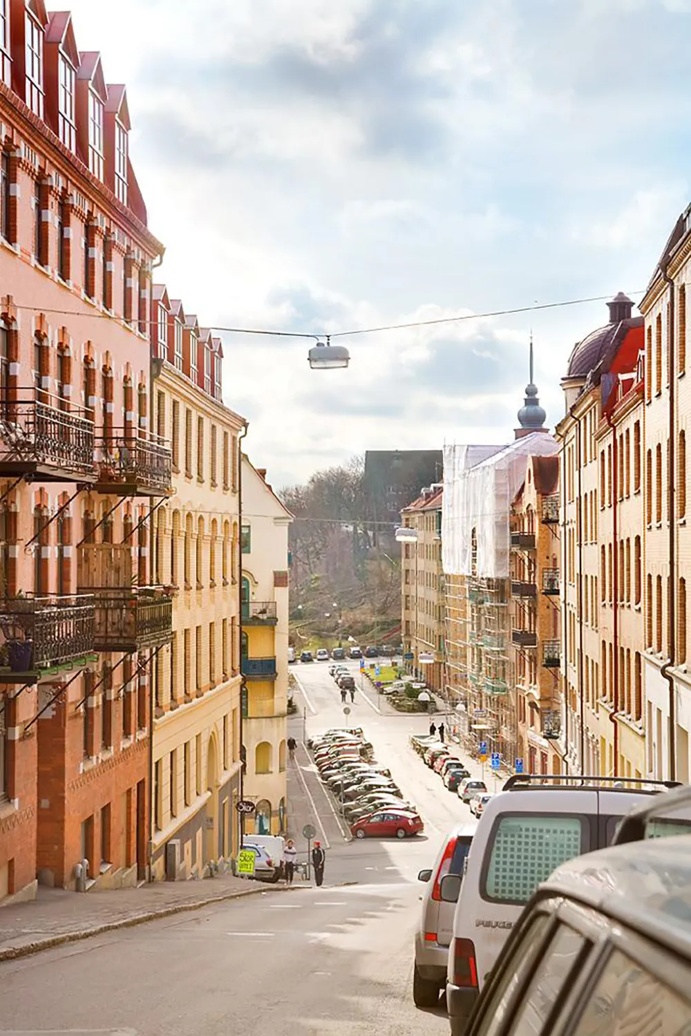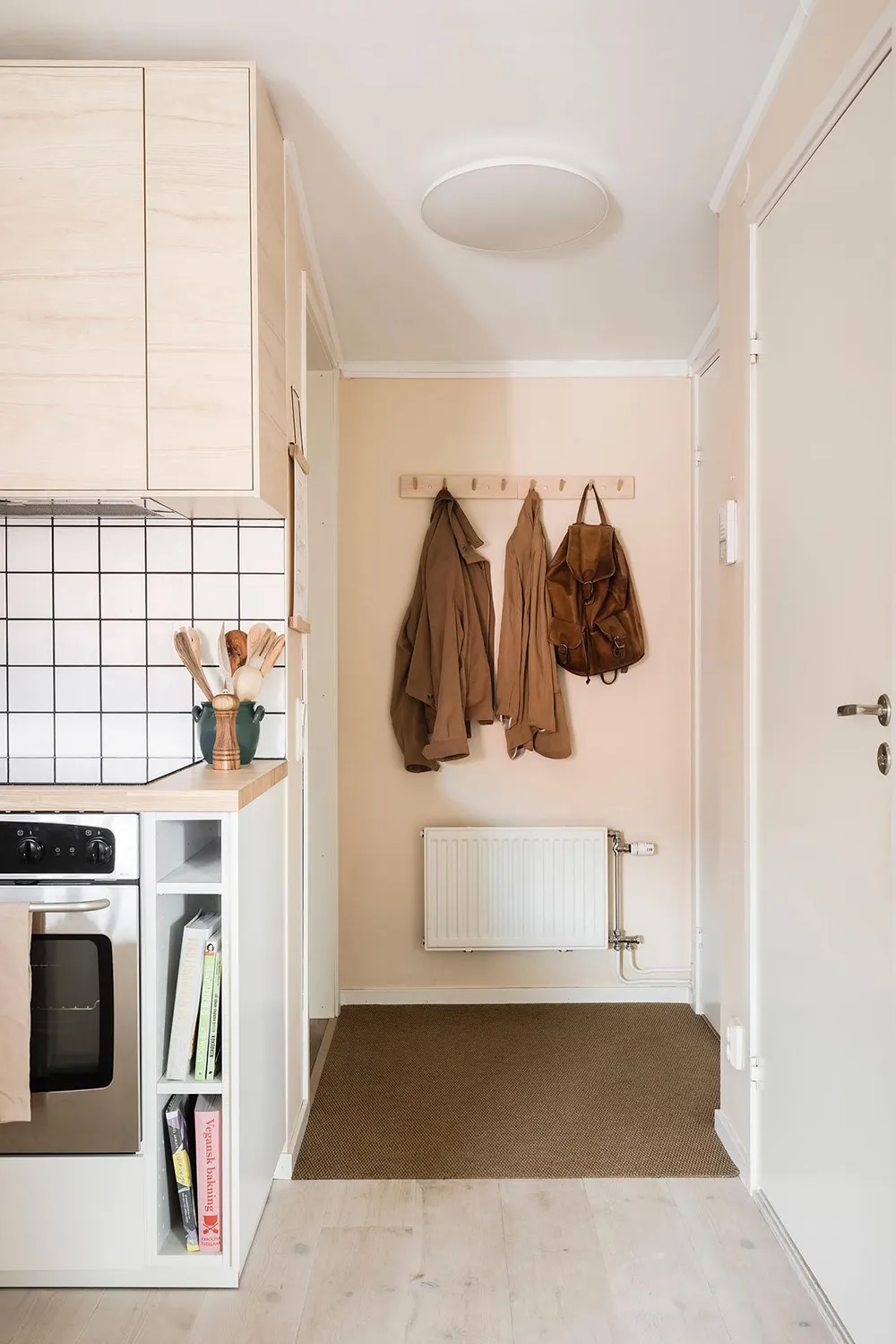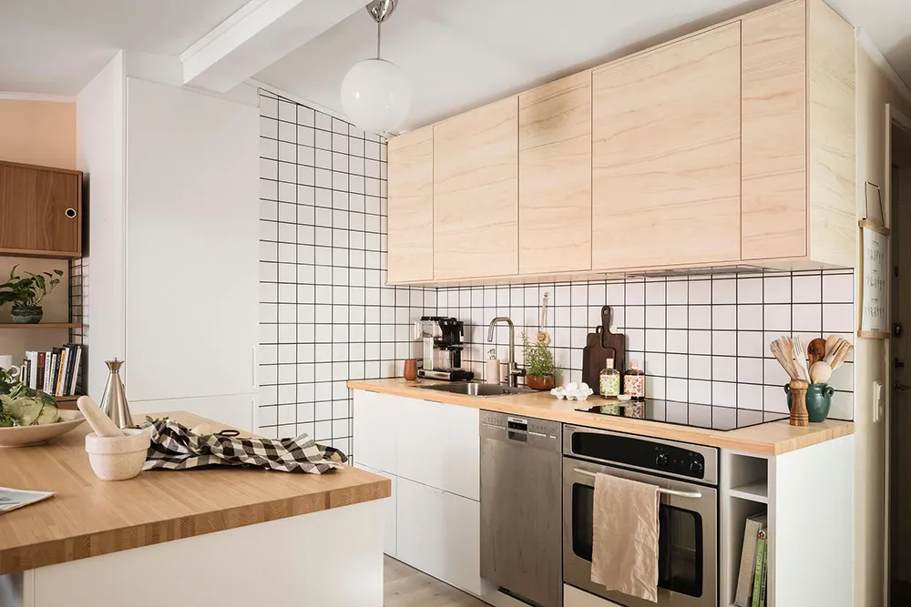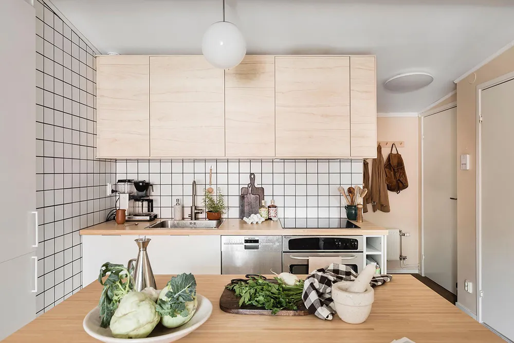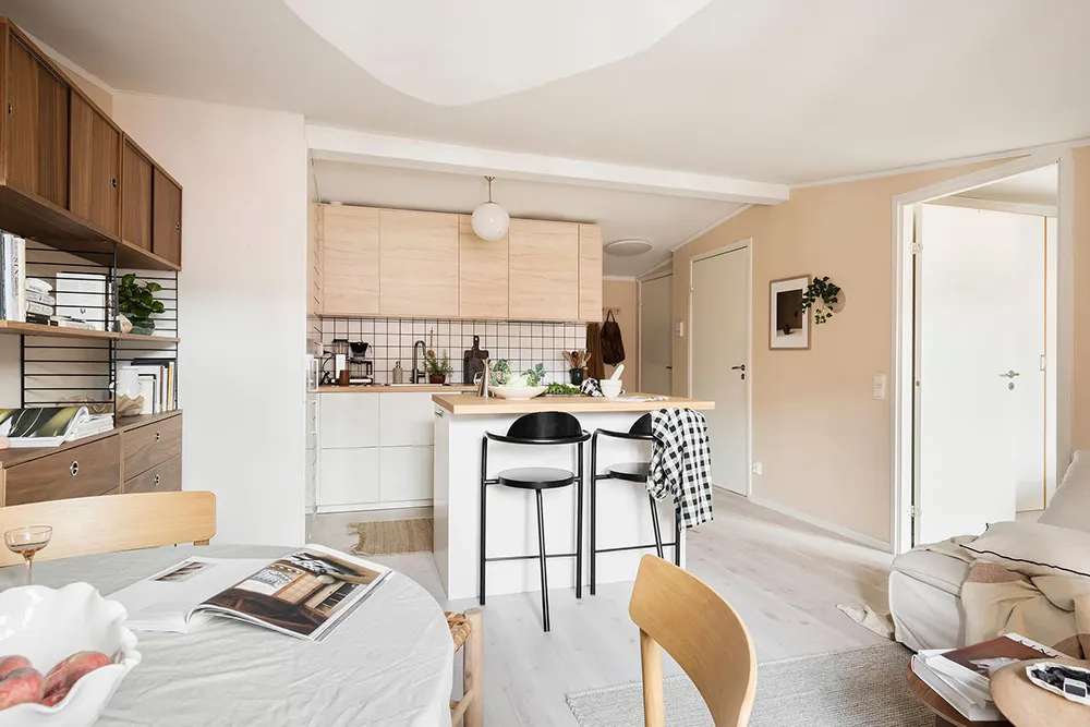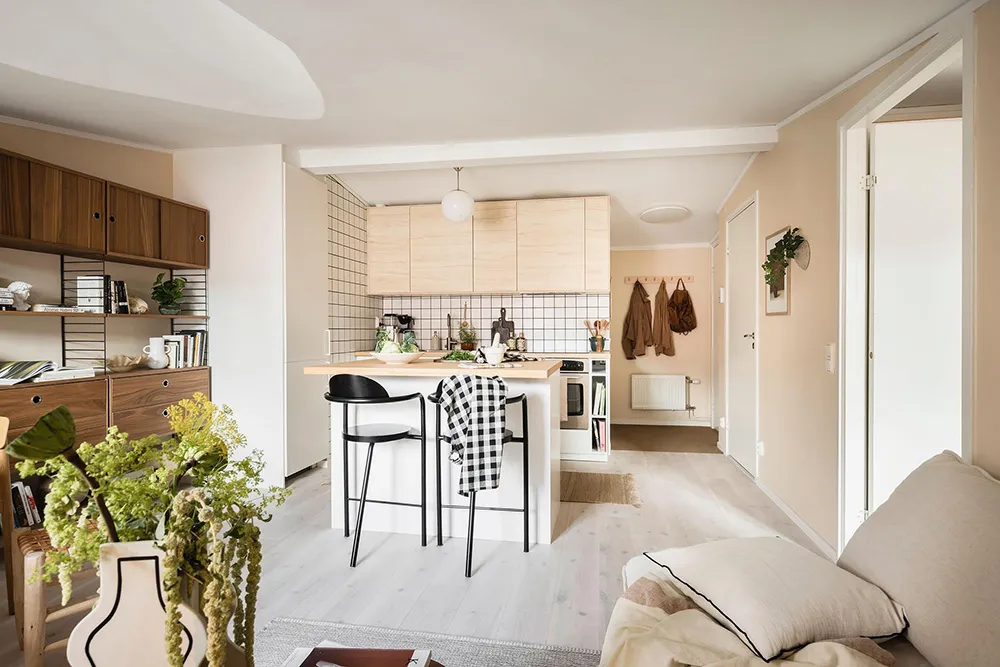 Une gamme de couleurs fraîche et une cloison sur la cuisine : appartement à Göteborg (89 m²)