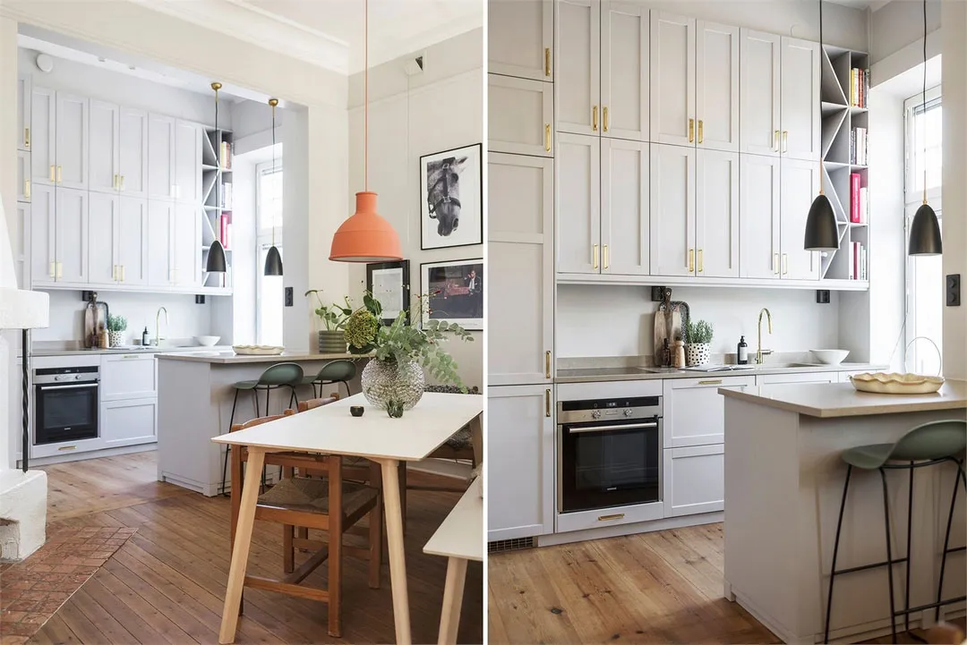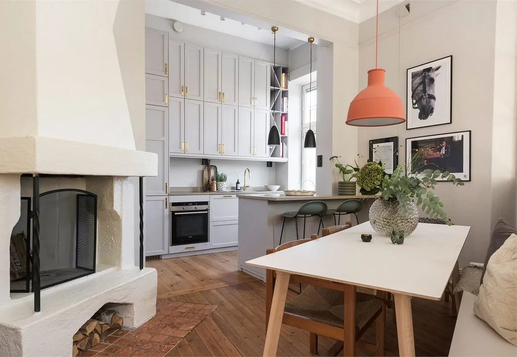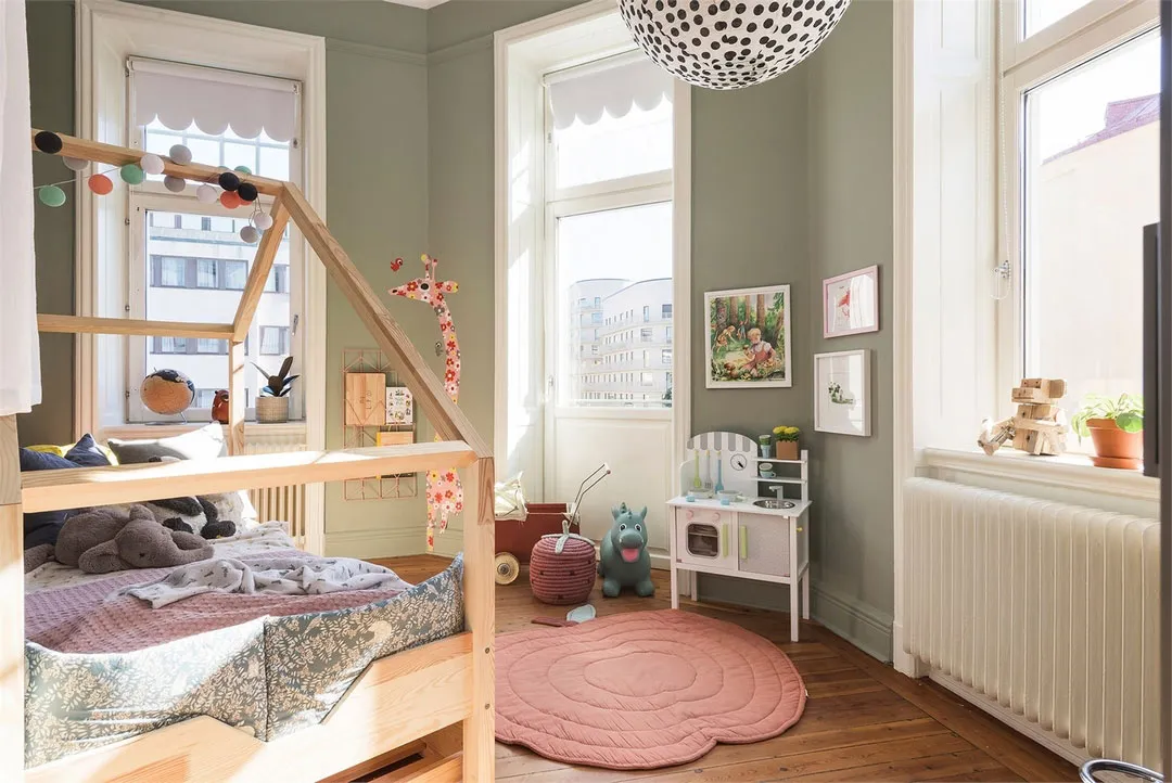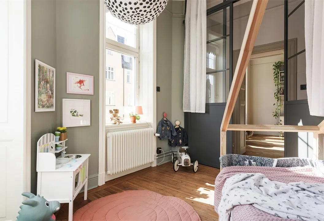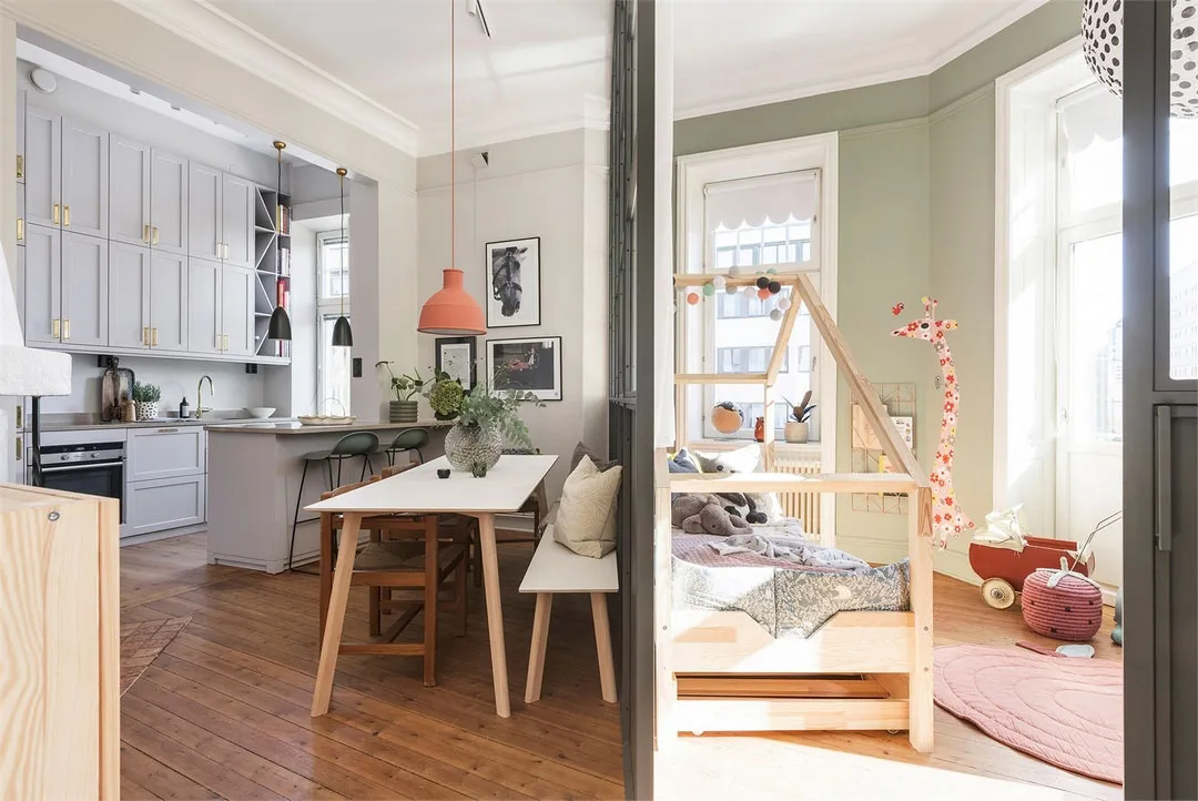 Chambre d'enfant dans la cuisine avec une gamme de couleurs élégante : appartement en Suède
