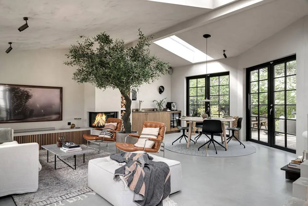 Arbre d'olivier et touches industrielles : maison de campagne en Suède