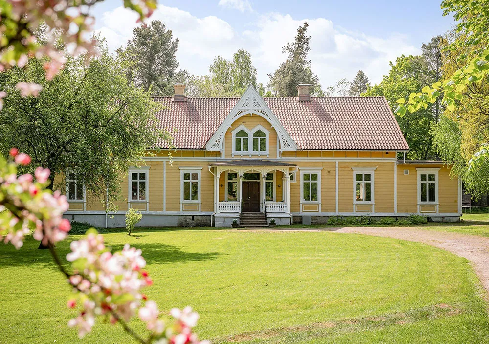 Aujourd'hui, nous vous présentons l'exemple le plus éclatant d'une maison rurale suédoise traditionnelle : une villa en bois du XIXe siècle avec une véranda et un facade élégant de couleur jaune.
