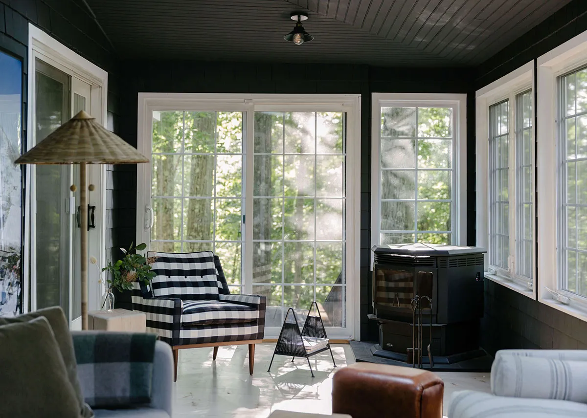 Fenêtre noire et intérieurs blancs : un abri confortable dans la forêt de l'État de New York