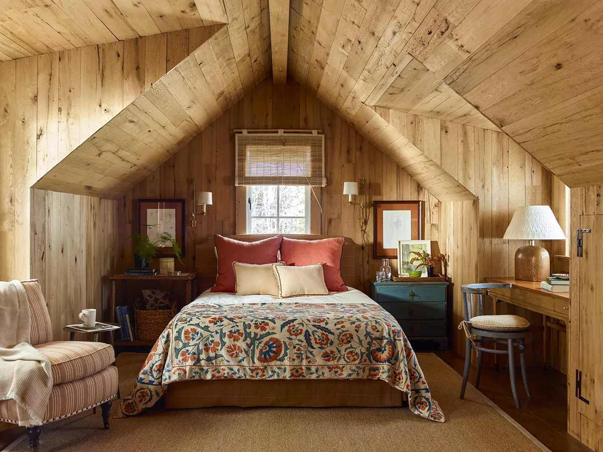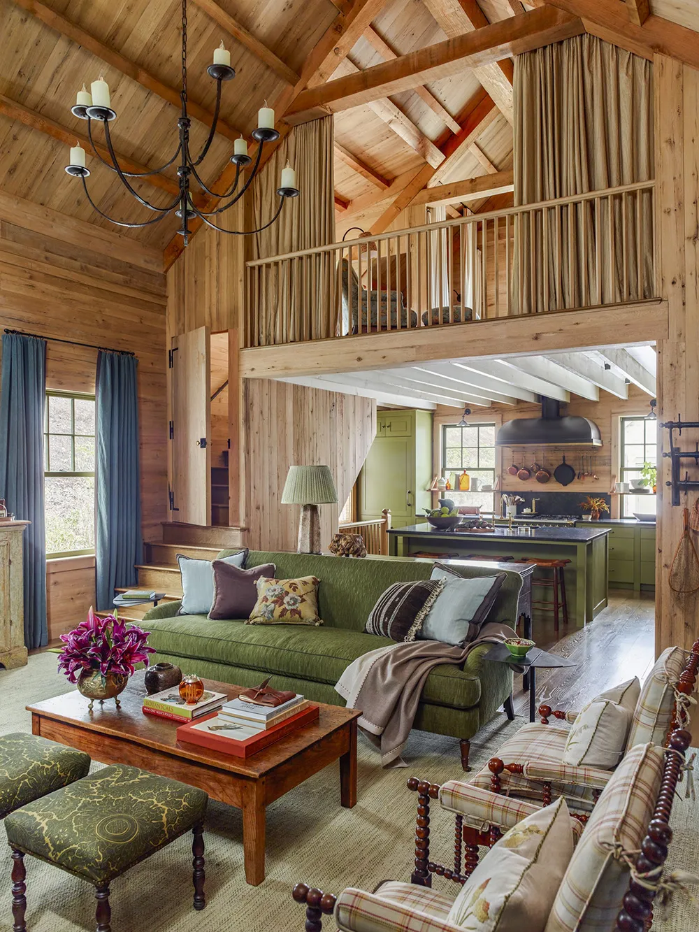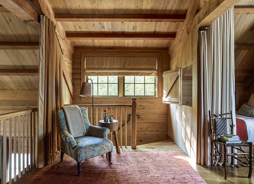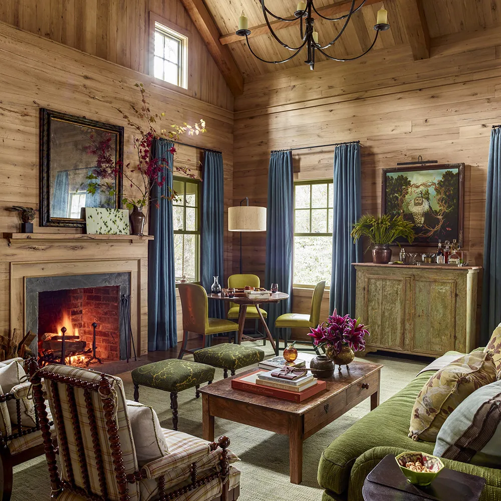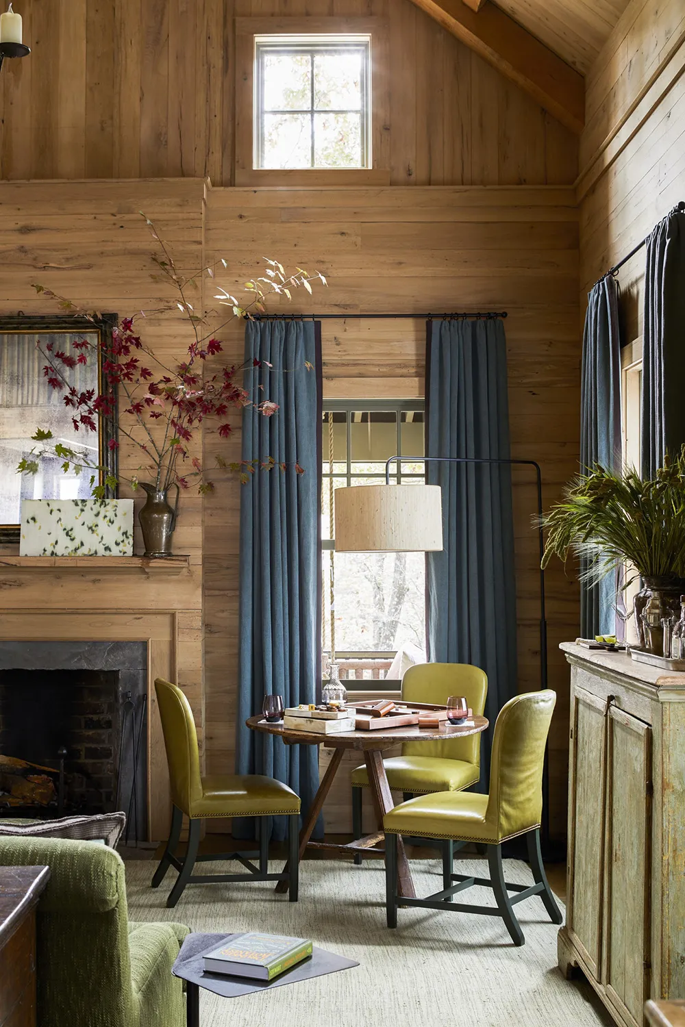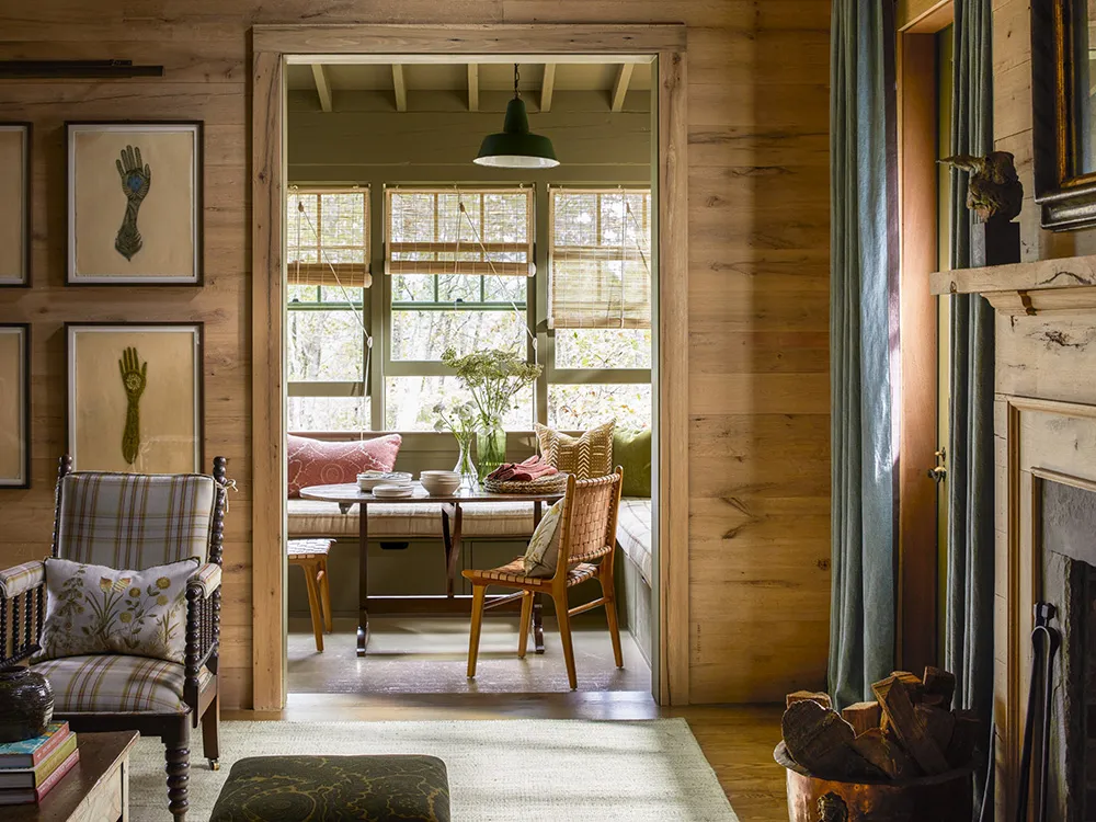 Malgré la rigueur de l'extérieur de ce cottage forestier dans l'État du Tennessee (les architectes, il faut le reconnaître, ont tenté de faire en sorte que son aspect extérieur s'intègre dans la nature locale), ses intérieurs sont assez colorés.