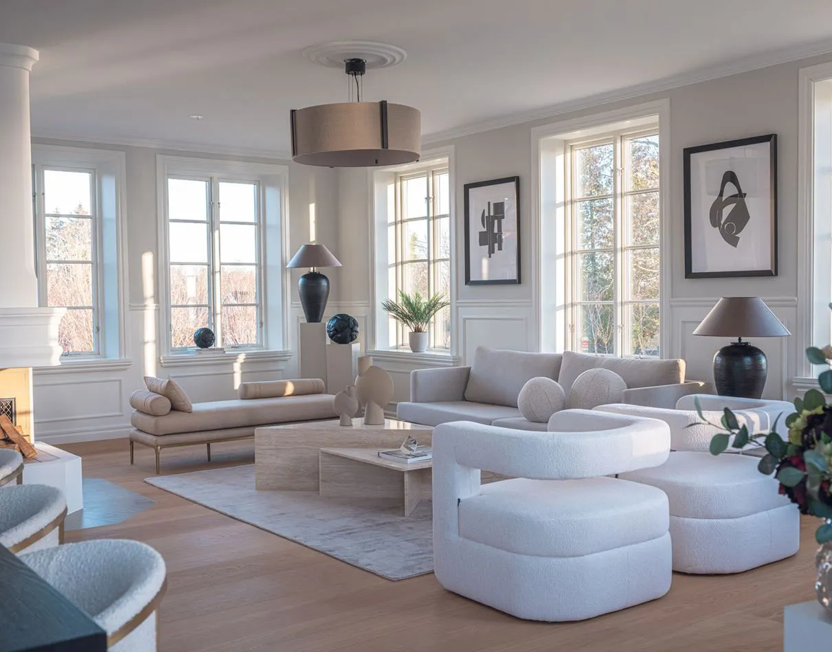 Élégants intérieurs modernes de cottage lacustre en Suède