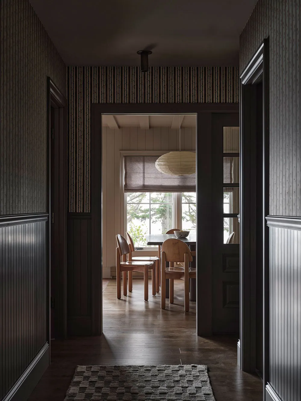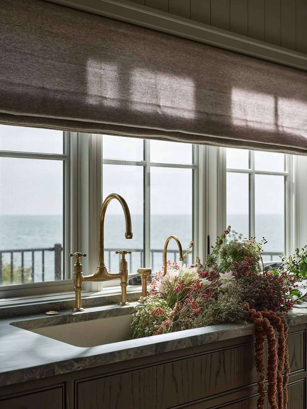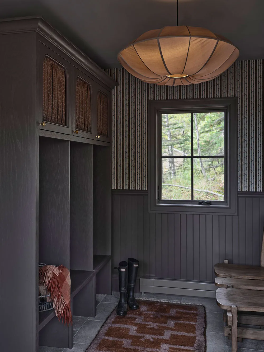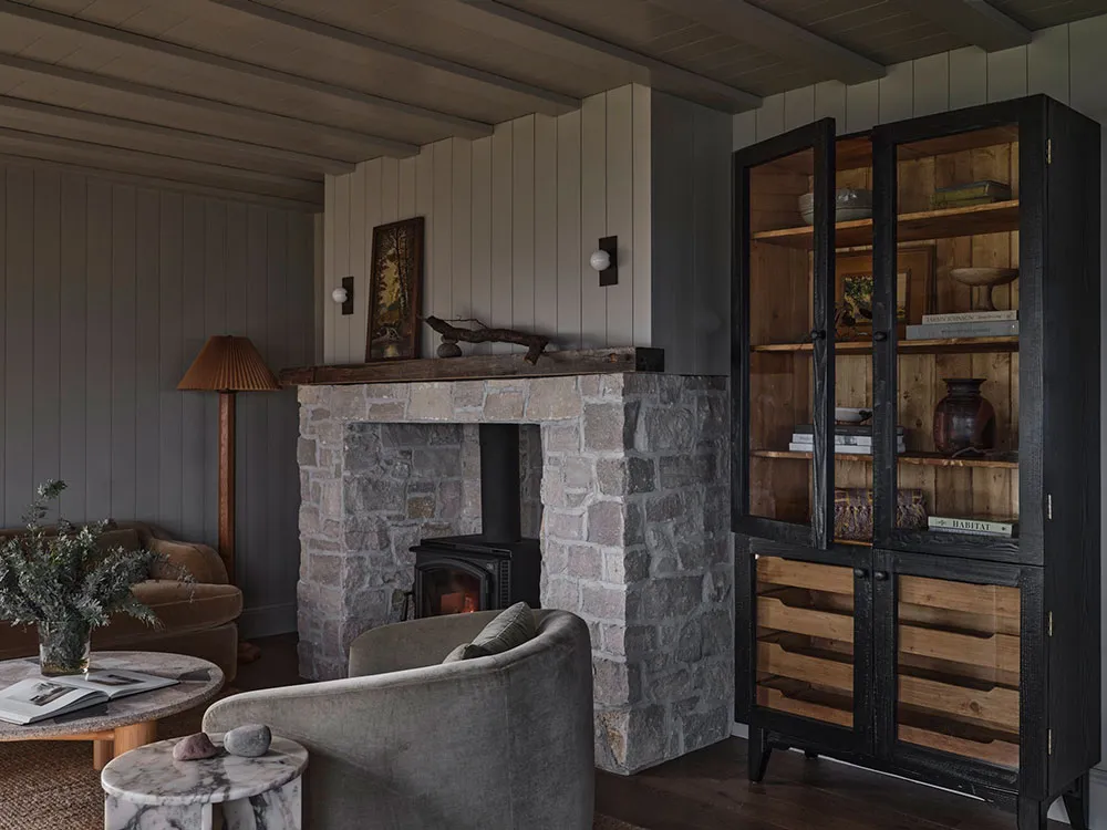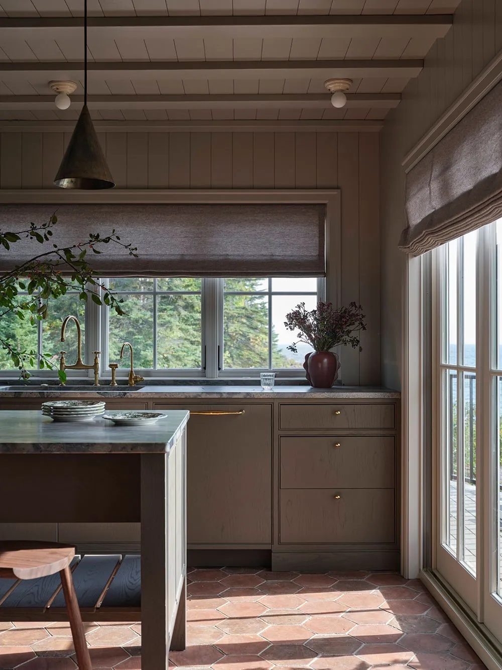 La gamme de couleurs de ces intérieurs de villa côtière dans l'État du Minnesota est composée de teintes terroires élégantes qui créent une atmosphère particulière et atténuée dans la maison.