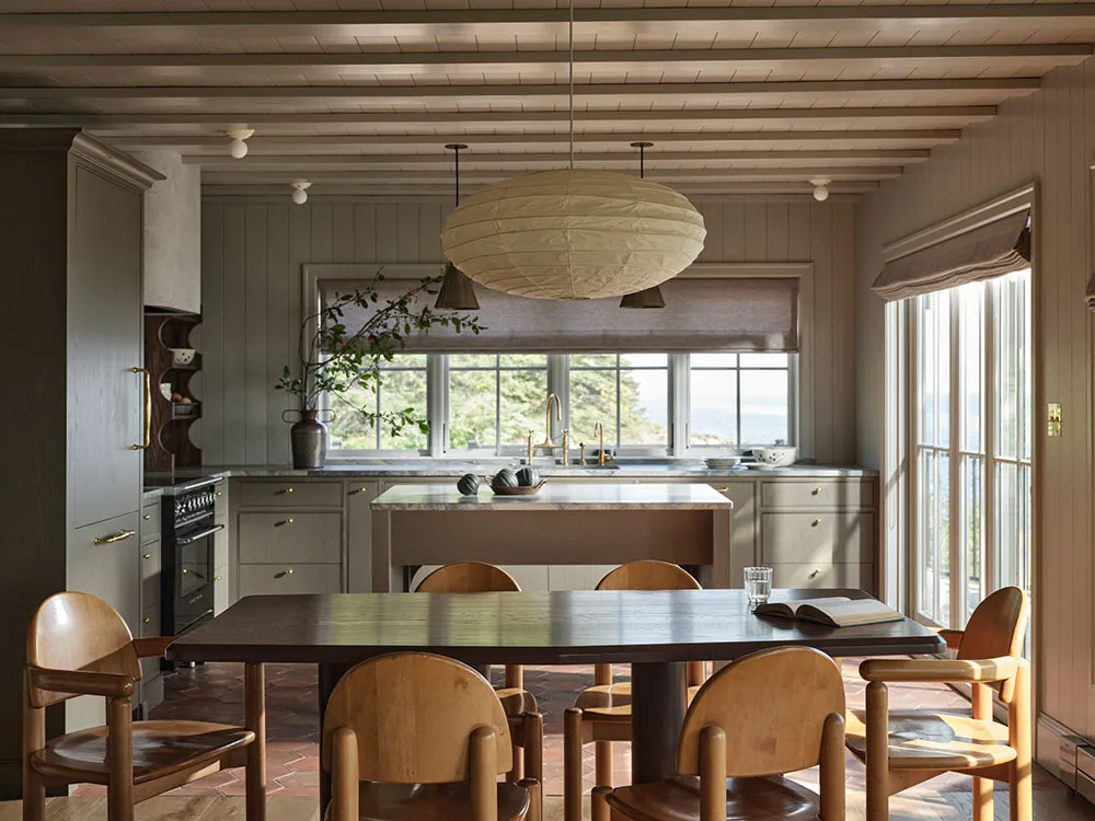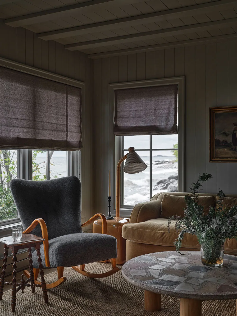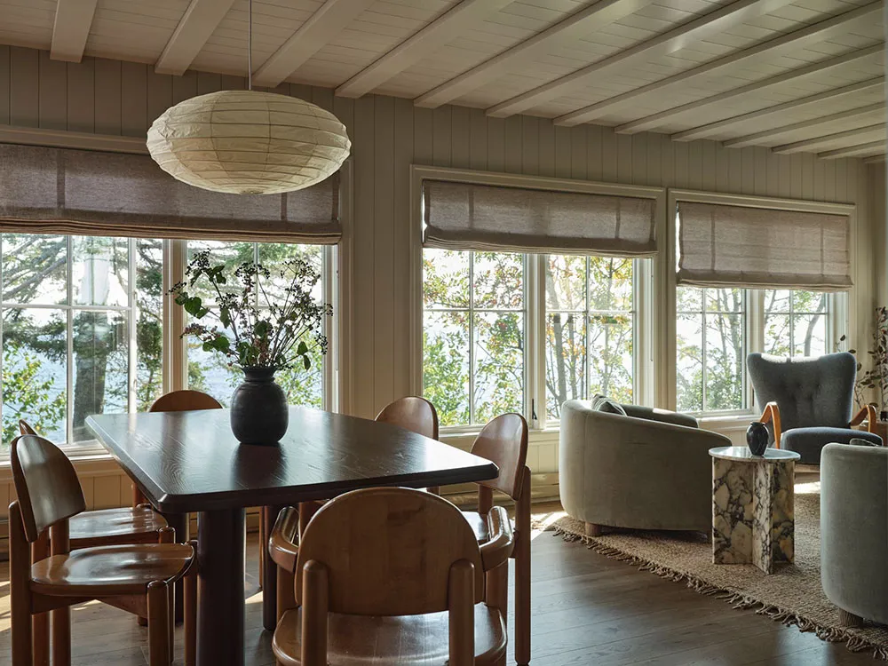 Teintes douces et atténuées dans les intérieurs d'une maison de campagne américaine sur le lac
