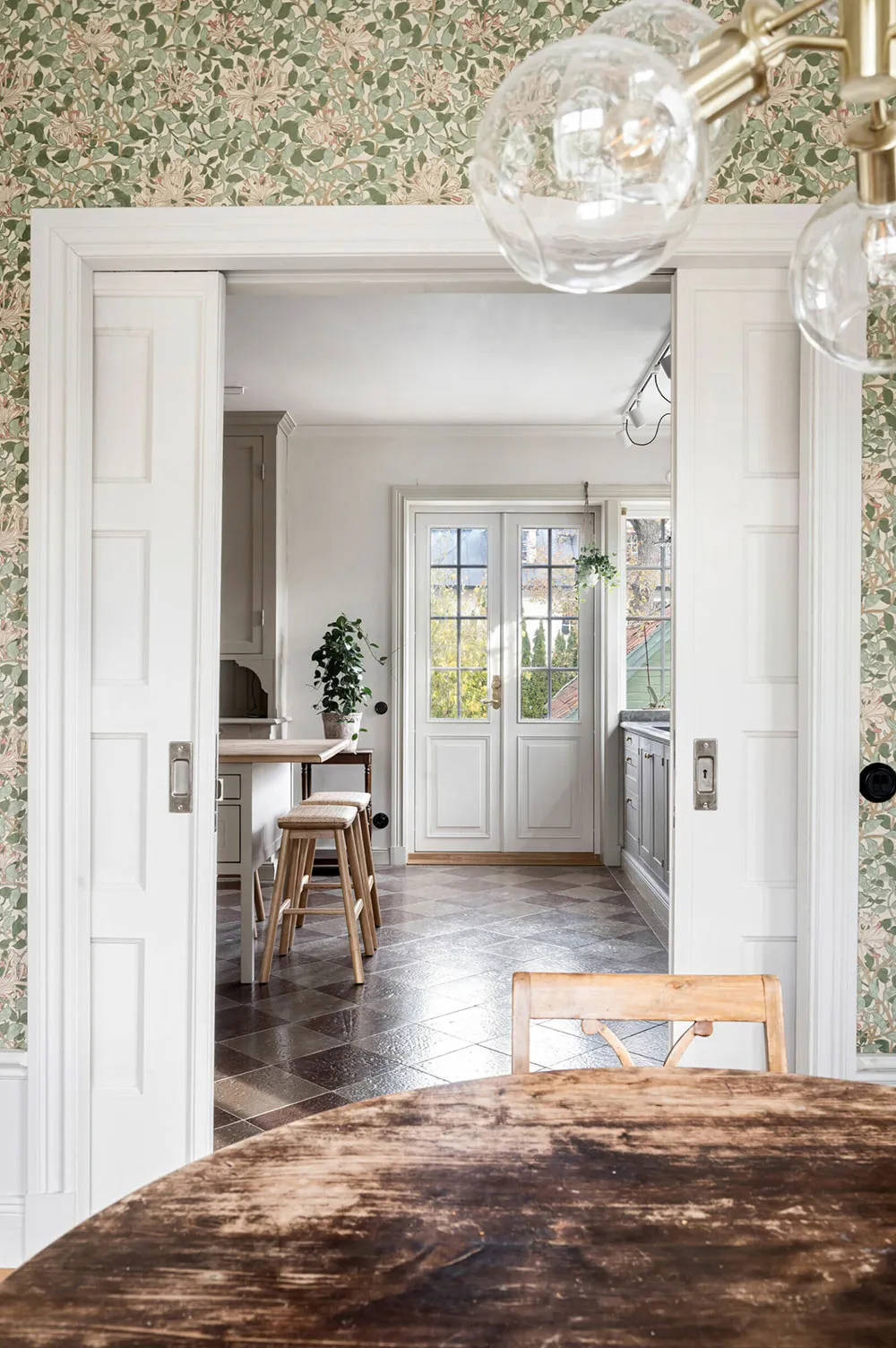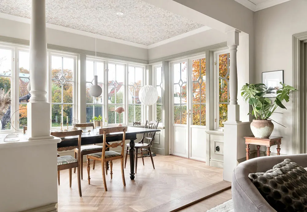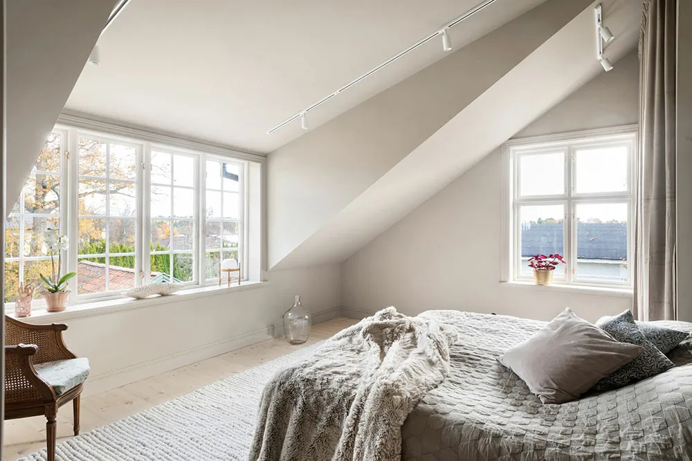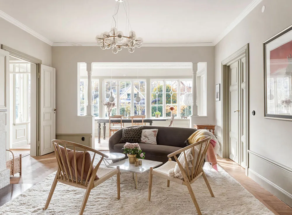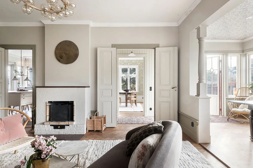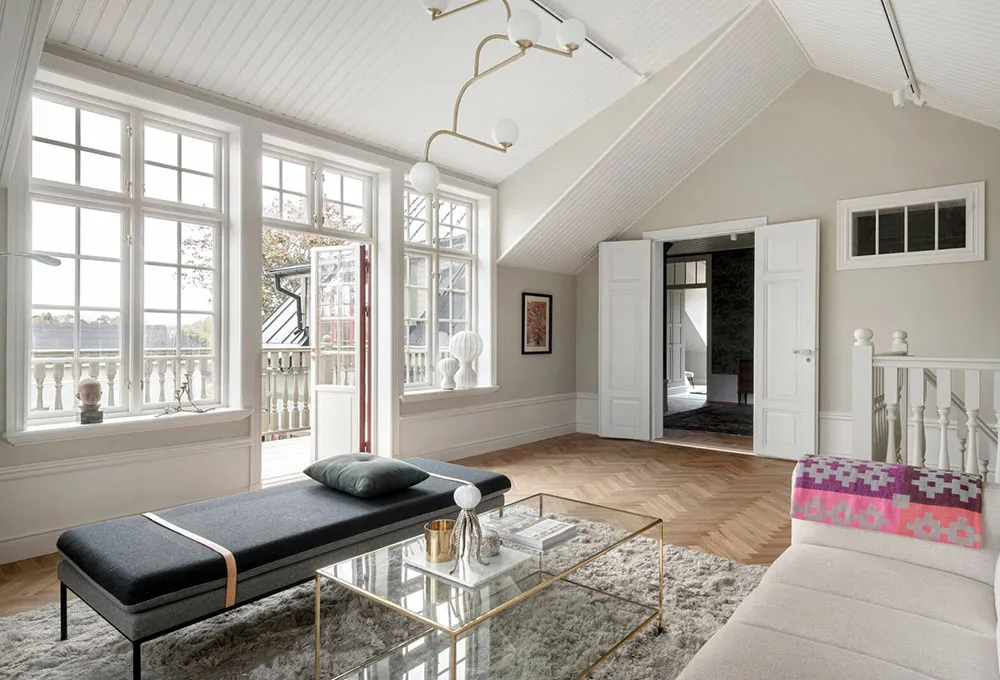Moldings, briques et mansarde : un intérieur original en Suède