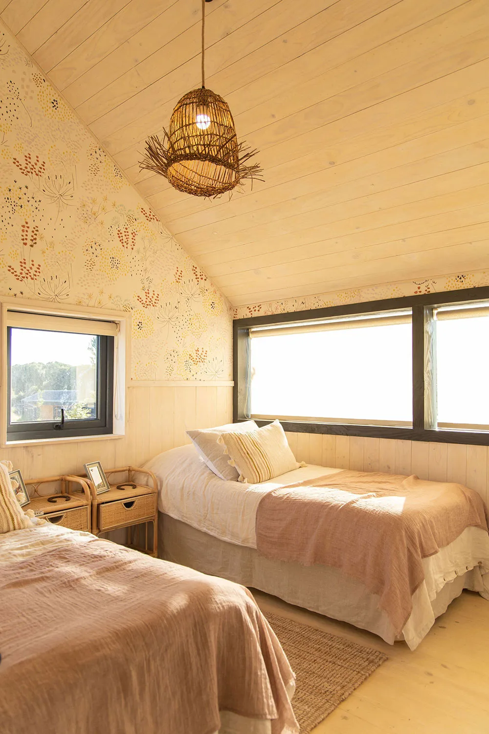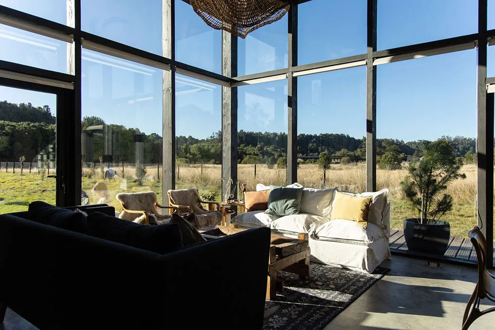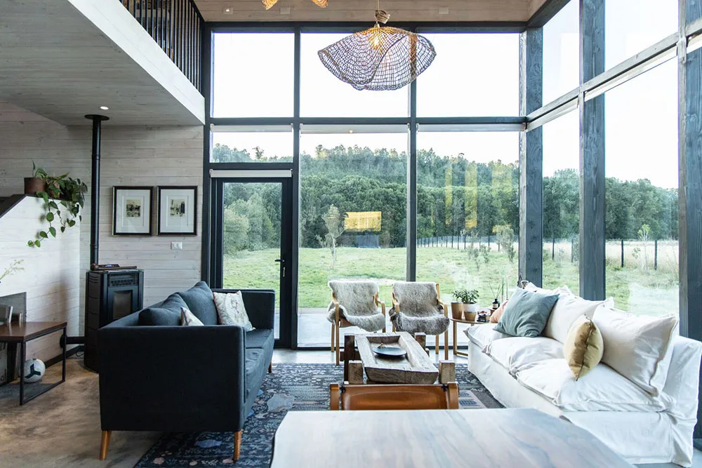 Le salon de ce cottage moderne en forêt au Chili possède deux murs entièrement vitrés, créant ainsi une atmosphère particulière dans l'intérieur.