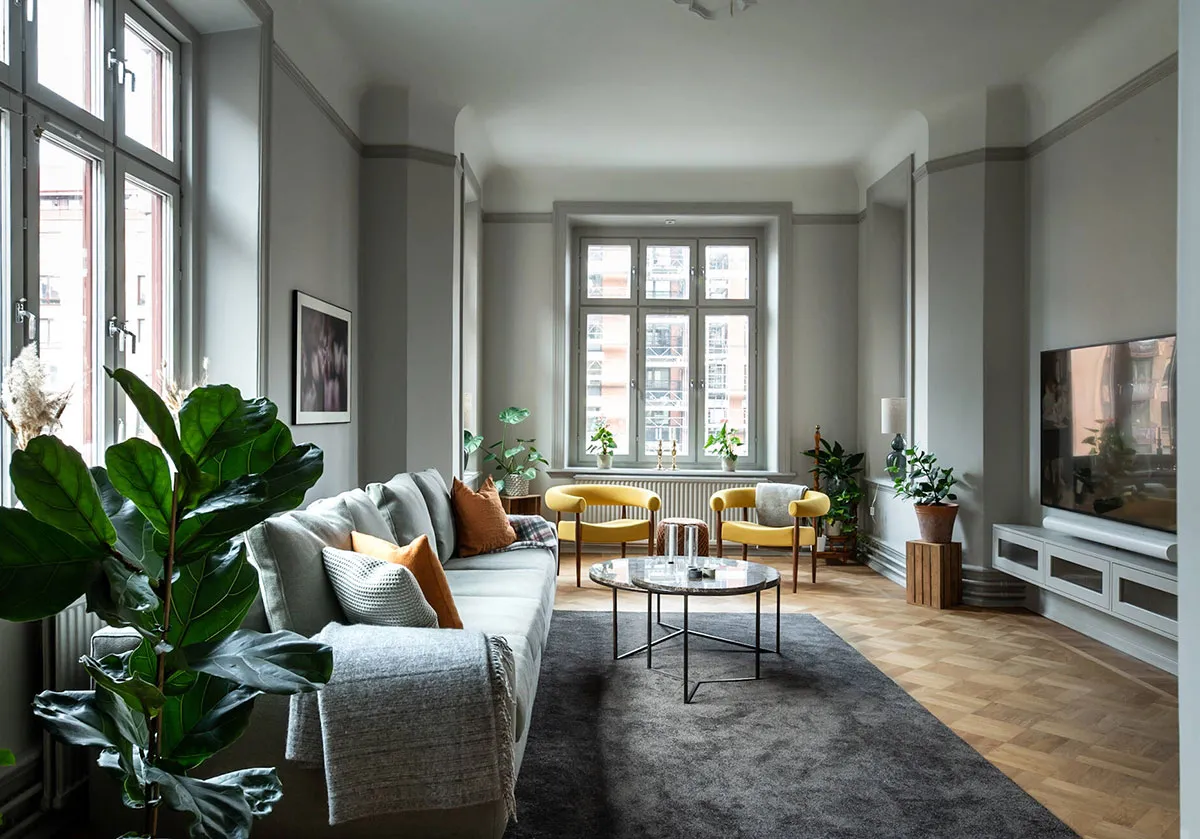 Teintes de gris dans le design d'une appartement raffiné à Goteborg