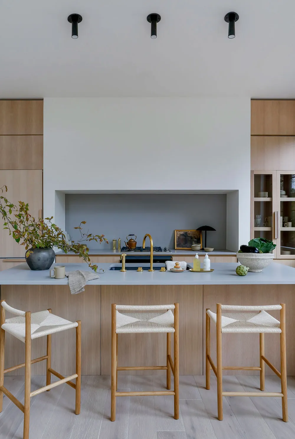 Une merveilleuse cuisine blanche avec sol sombre et détails en bois