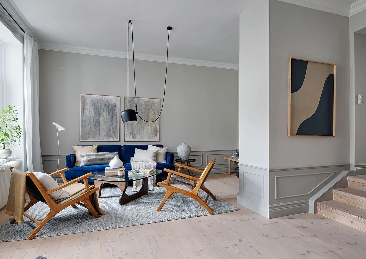 Canapé bleu en velours et détails chaleureux : appartement scandinave dans un espace inhabituel (69 m²)