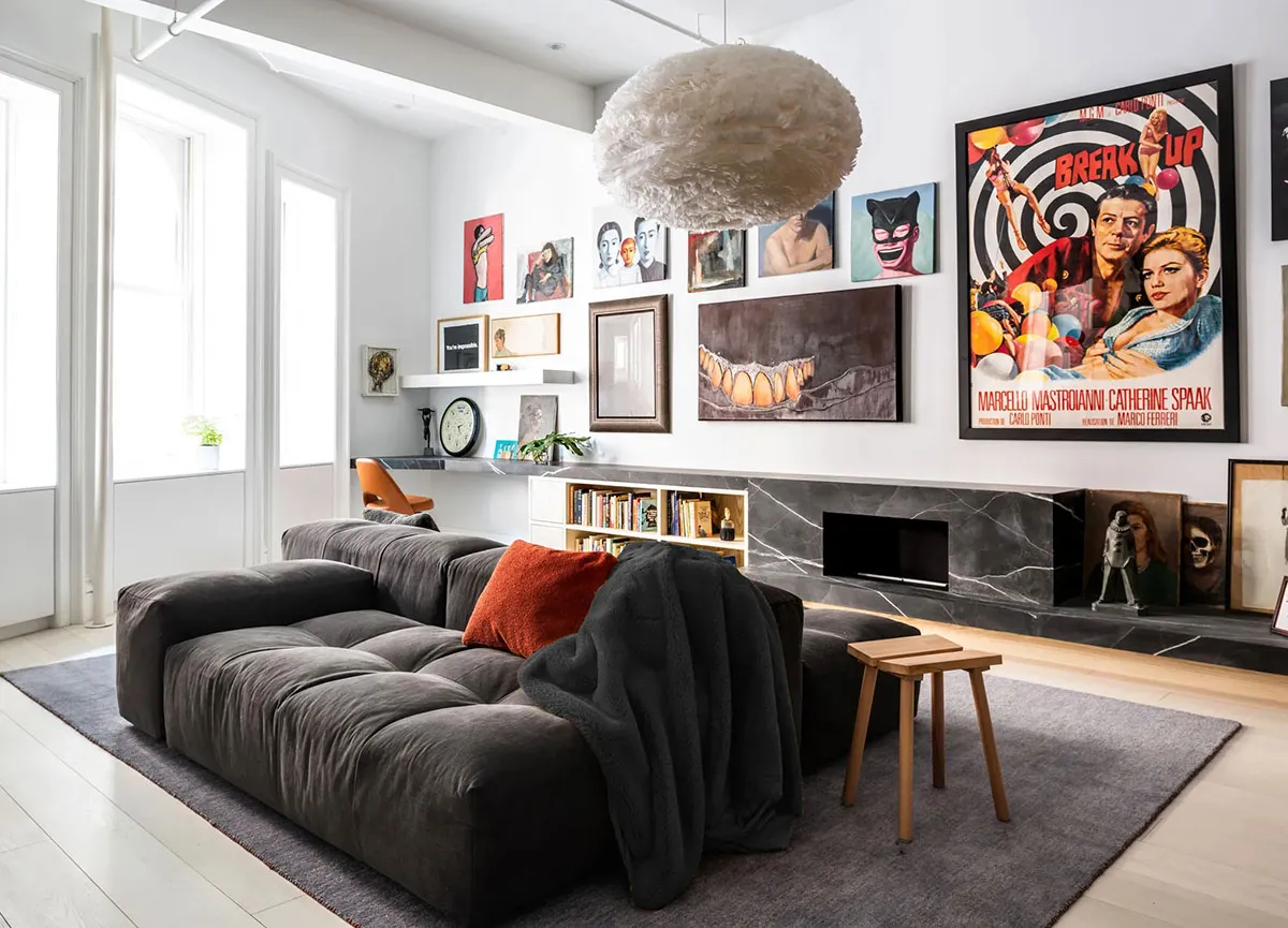 Loft lumineux avec des affiches colorées sur Broadway