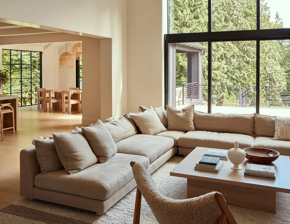 Intérieur monochrome chaleureux d'un cottage moderne en forêt aux États-Unis