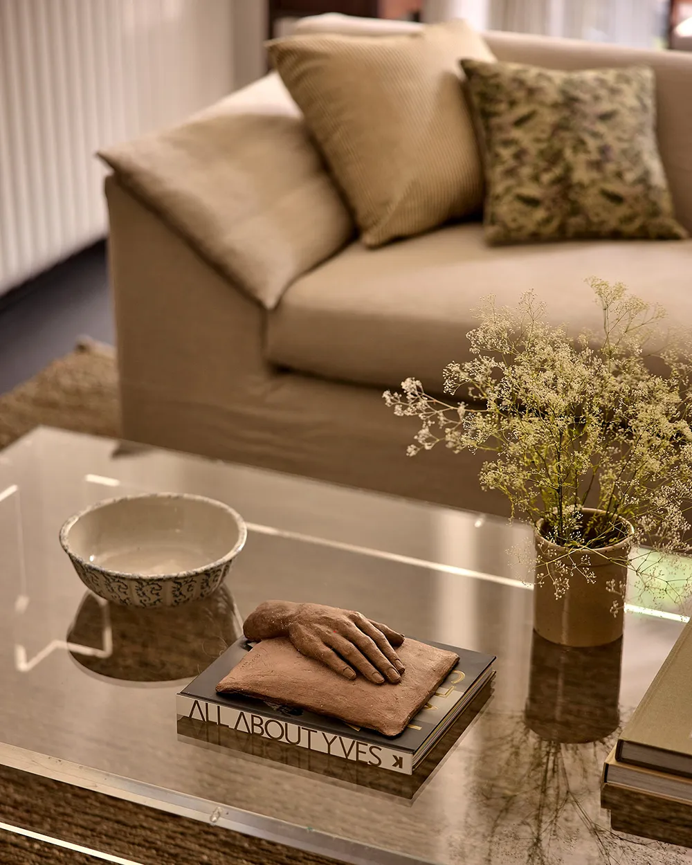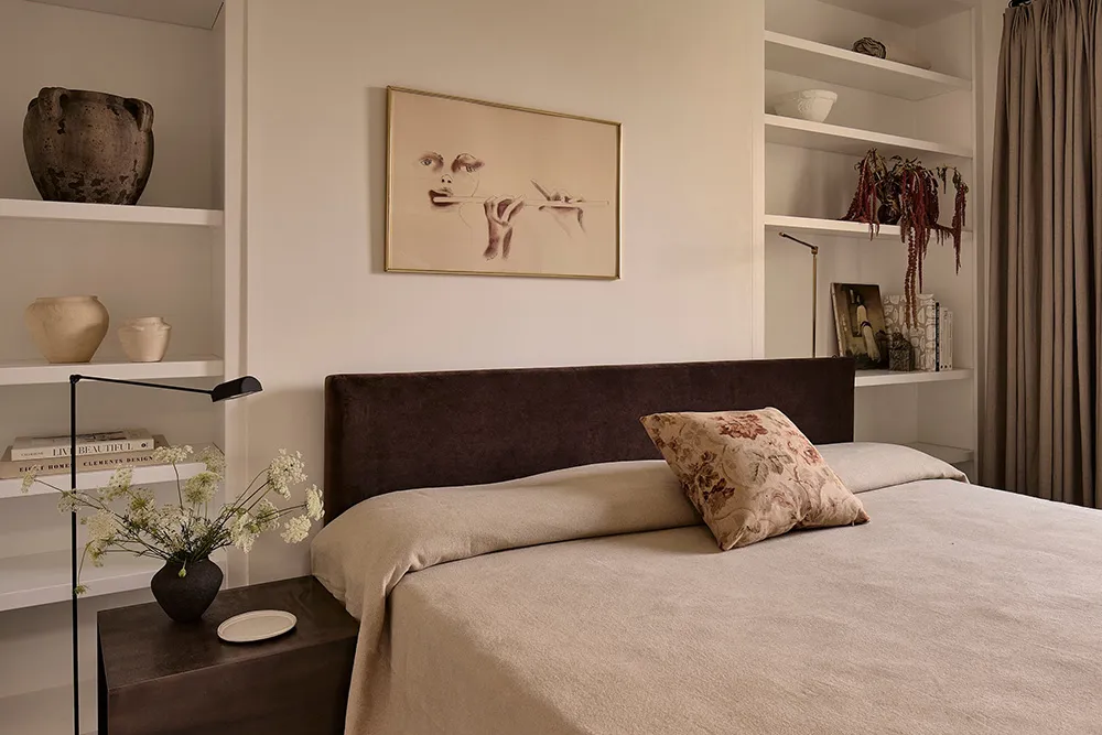 Intérieur beige confortable avec bibliothèque dans un appartement suédois à Stockholm (63 m²)