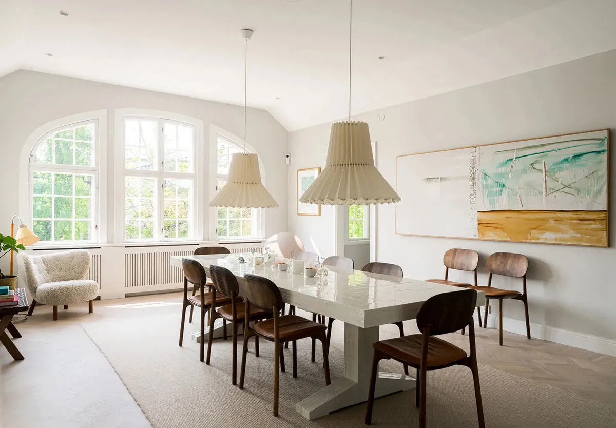 Teintes douces du blanc dans le design d'un appartement suédois spacieux