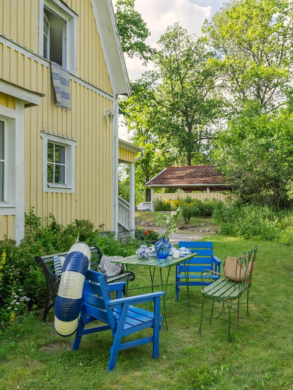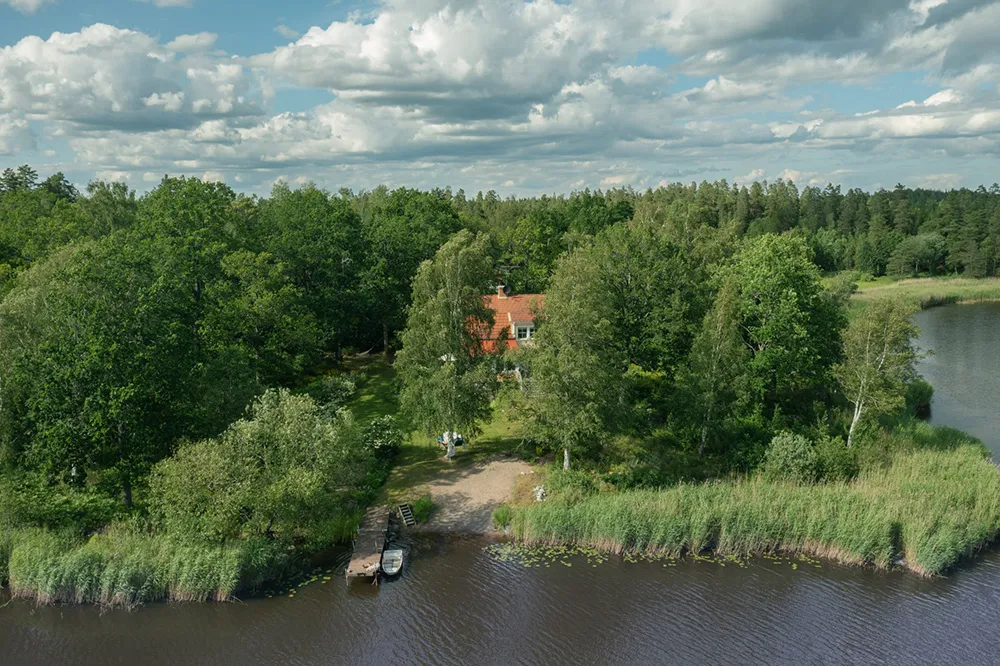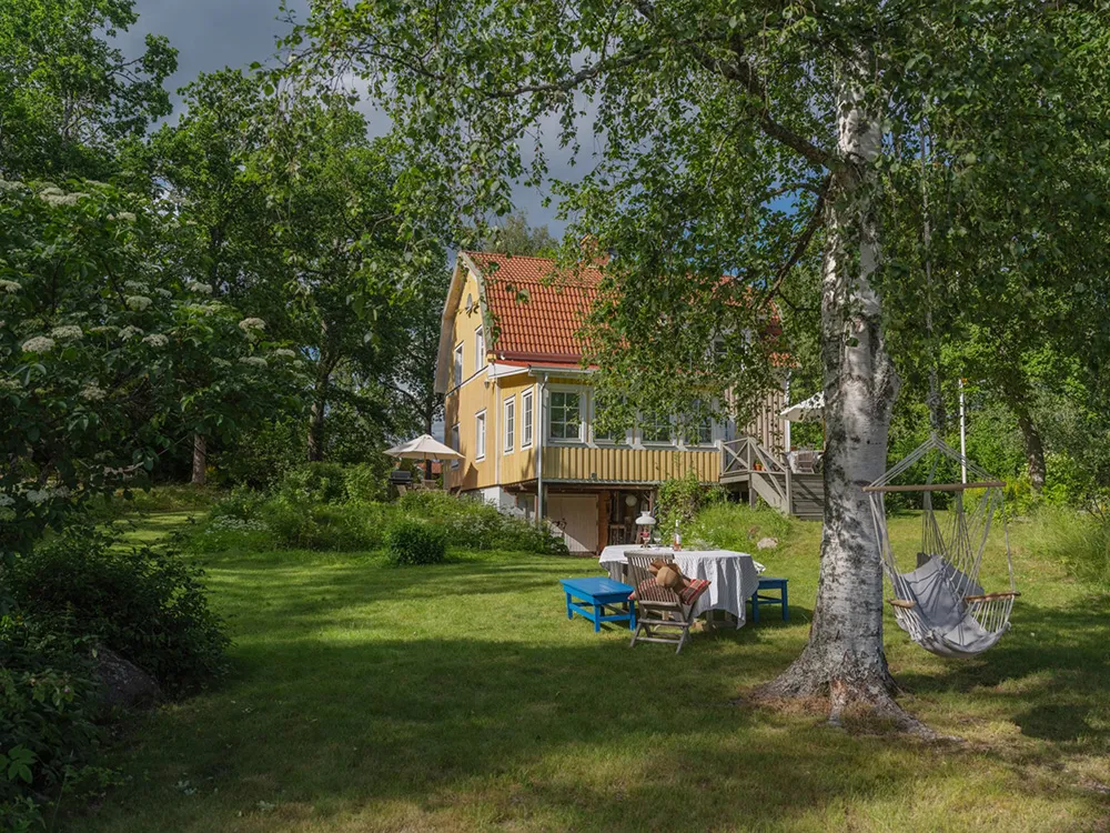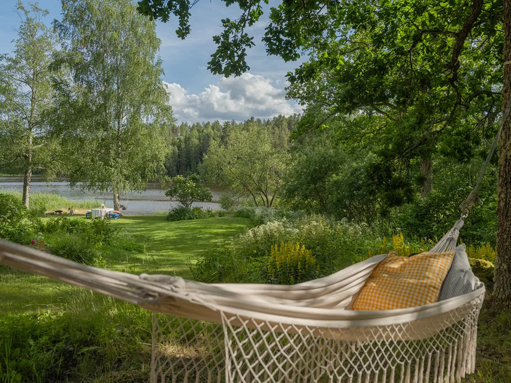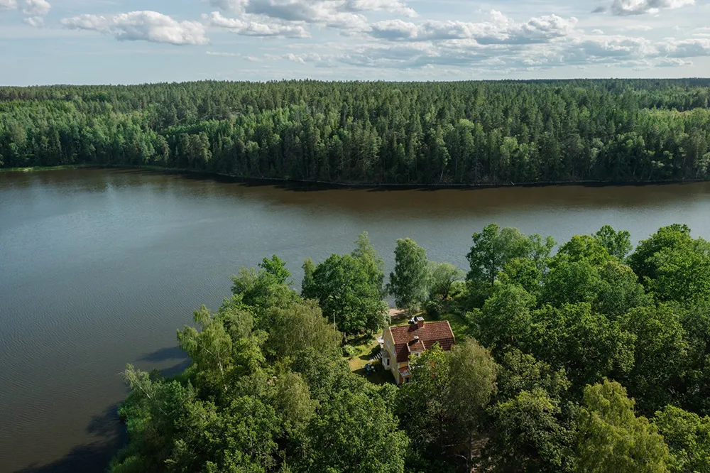 La verdure entoure cette charmante maison de camp suédoise de tous côtés.