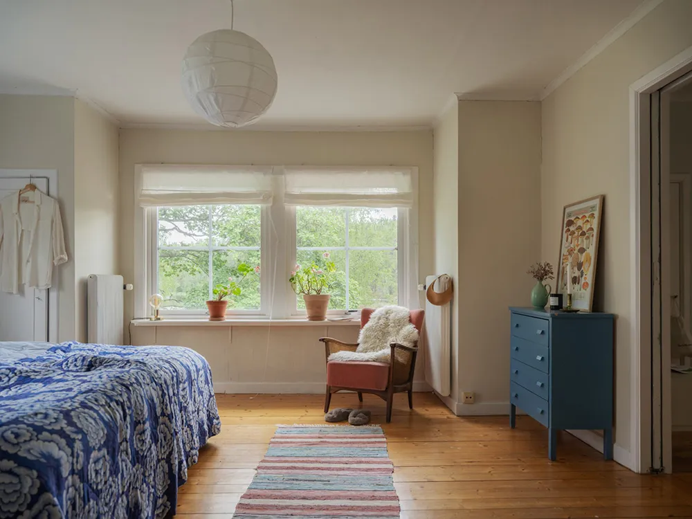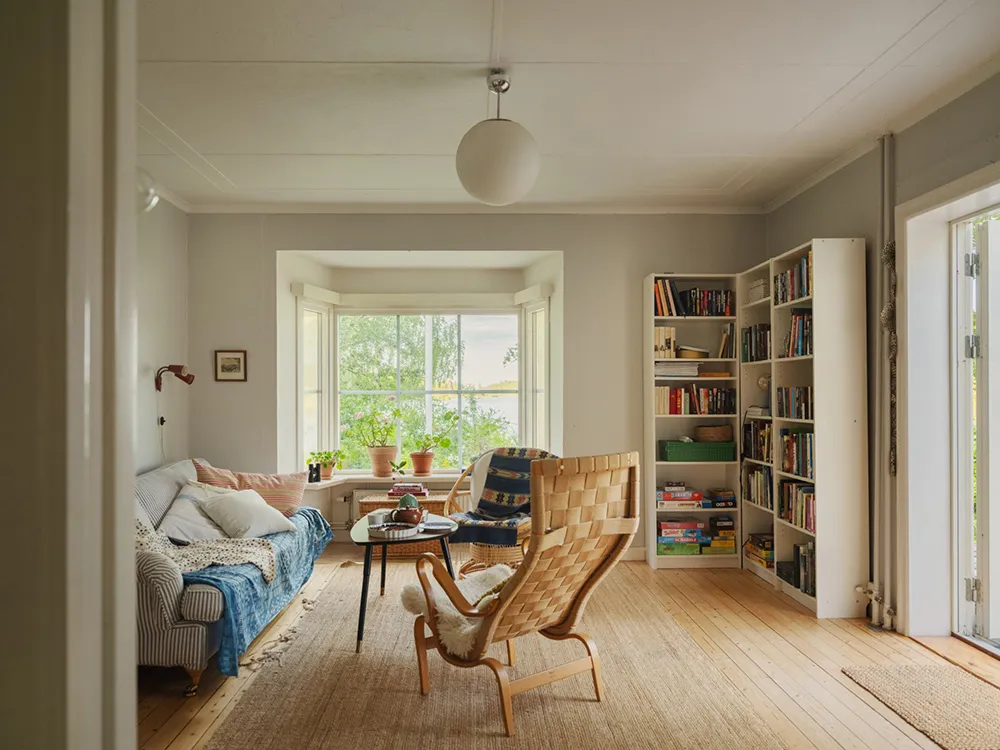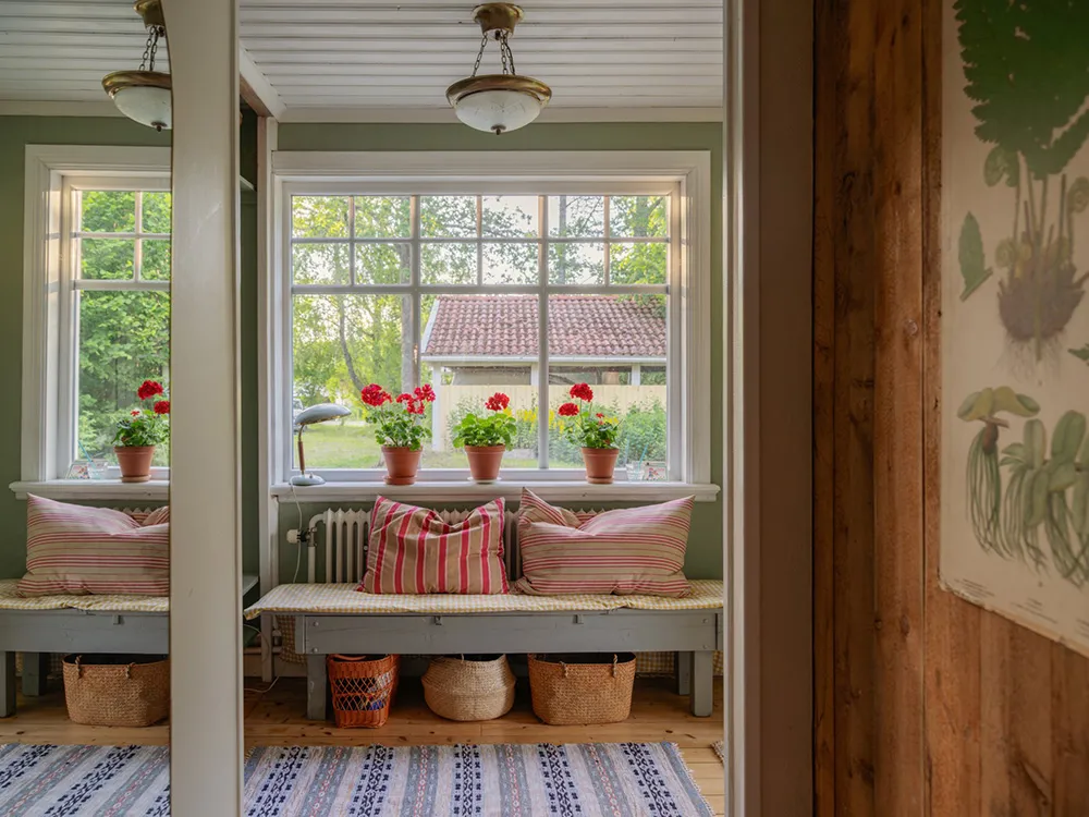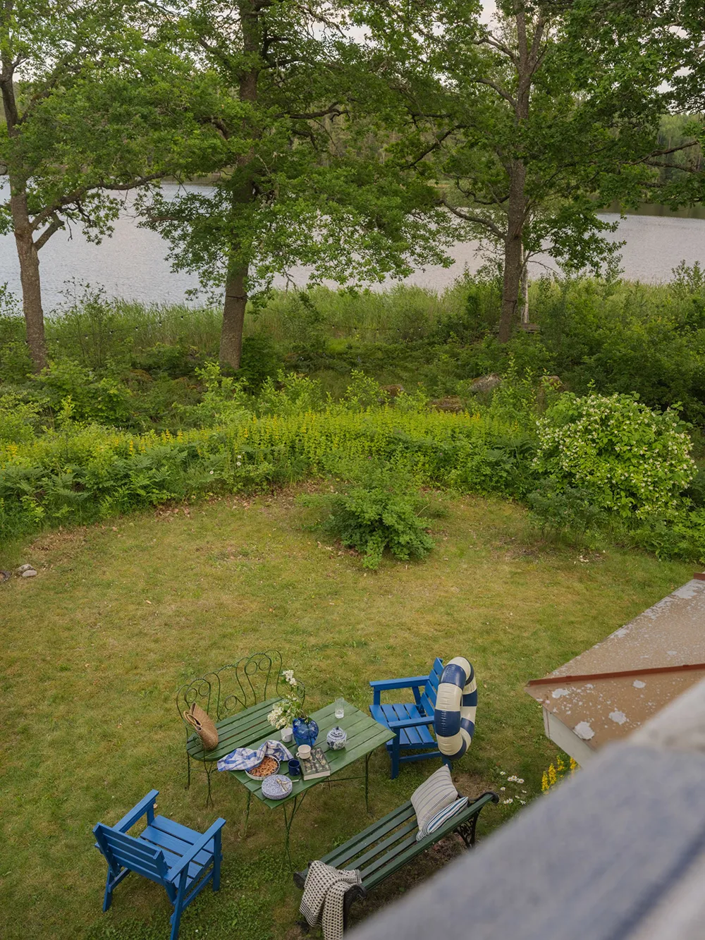 La verdure entoure cette charmante maison de camp suédoise de tous côtés.
