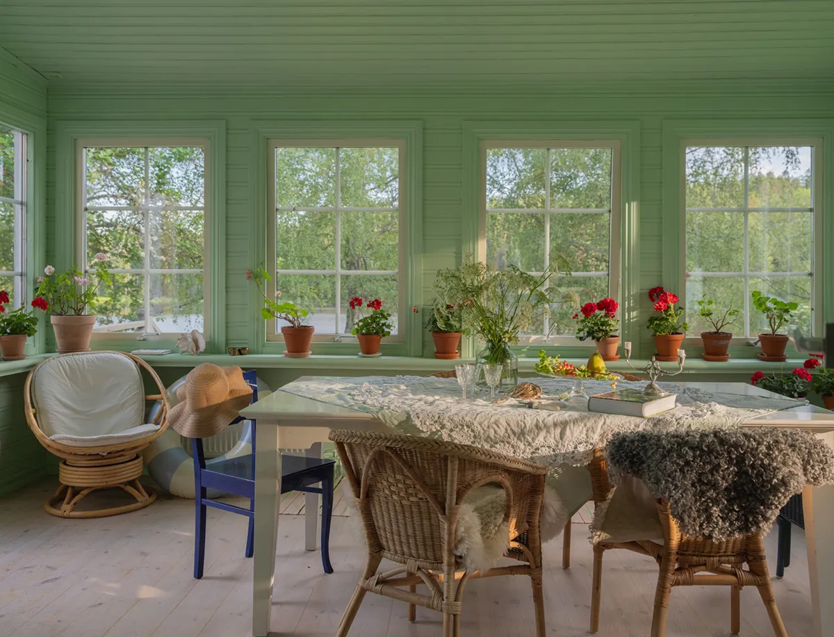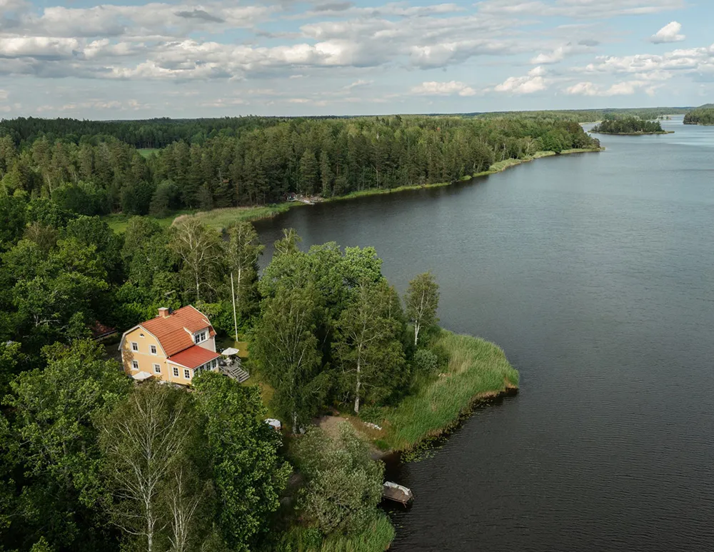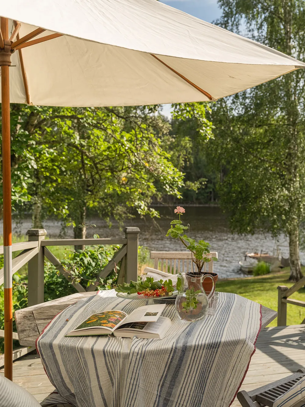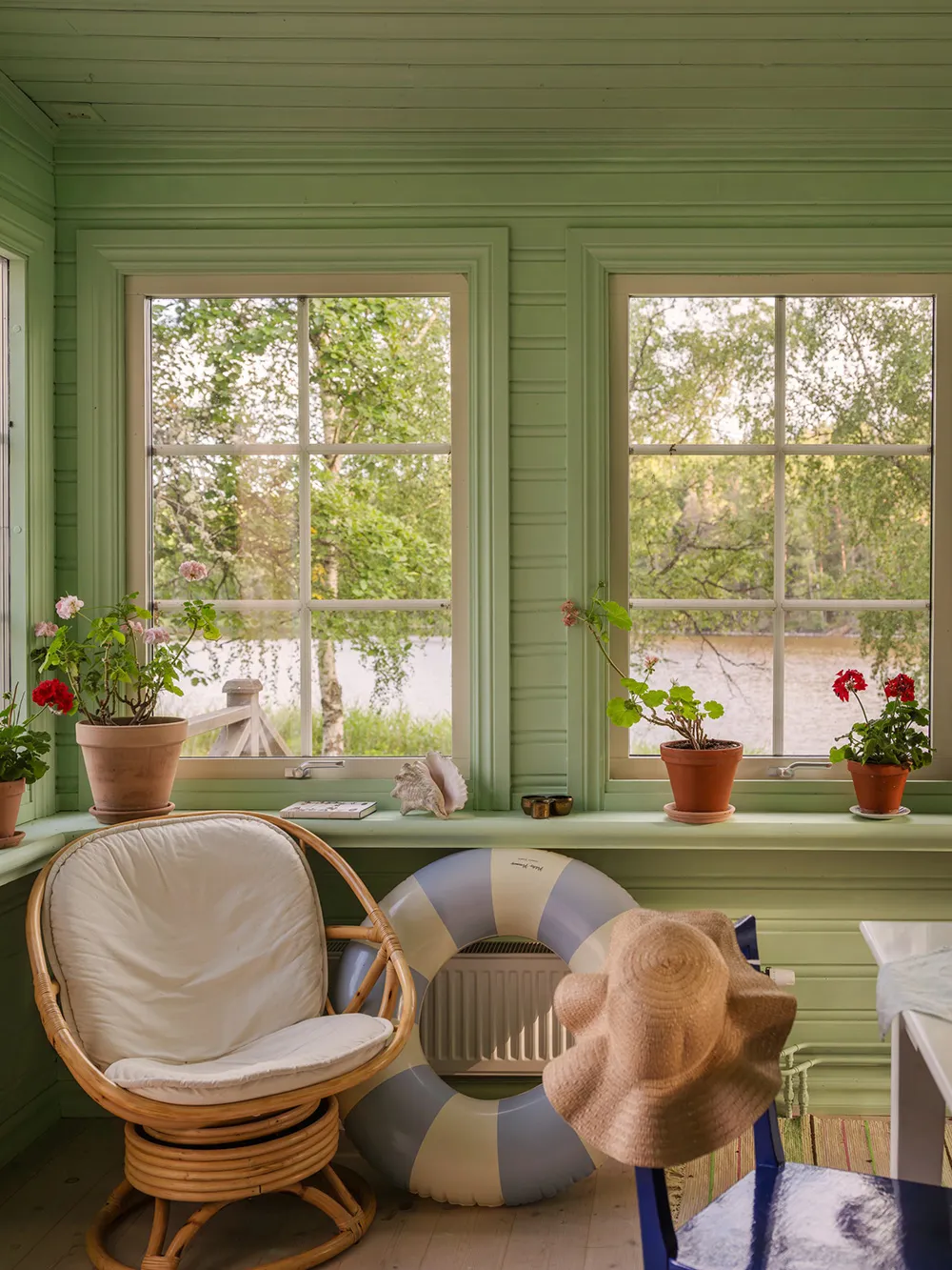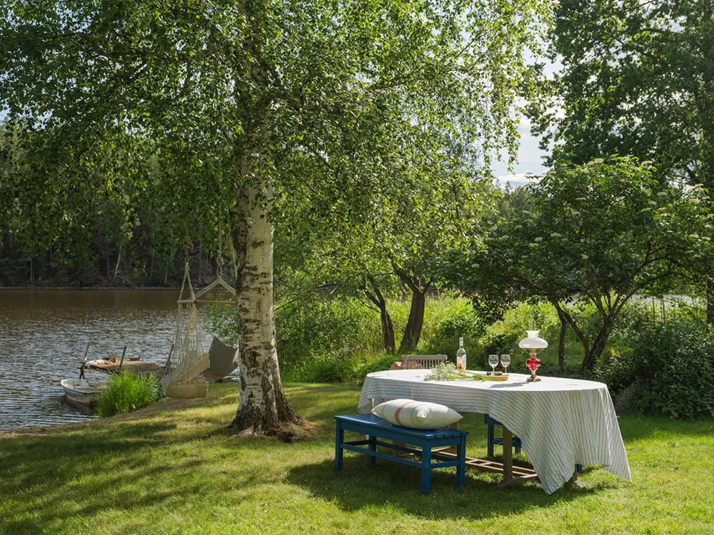 Beaucoup de verdure dans le design d'une maison de camp suédoise au bord du lac